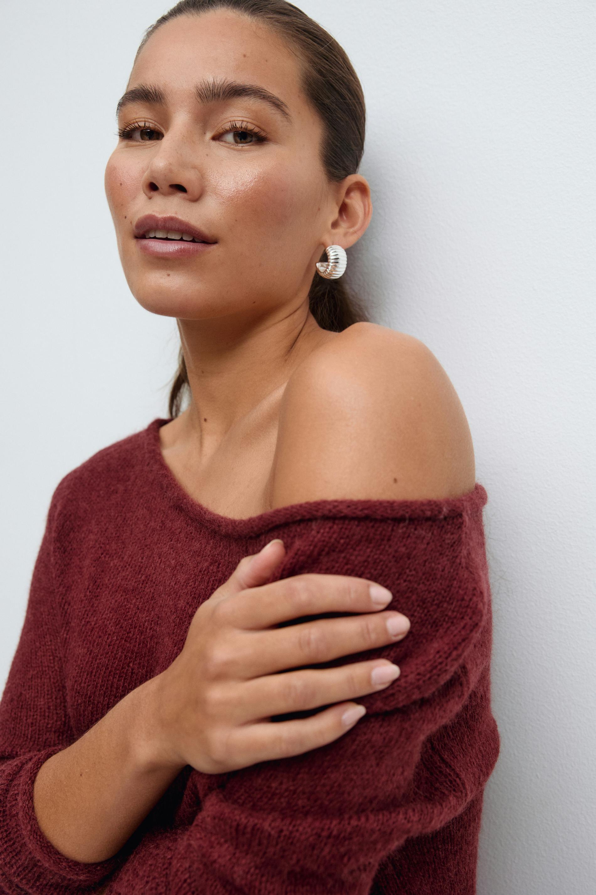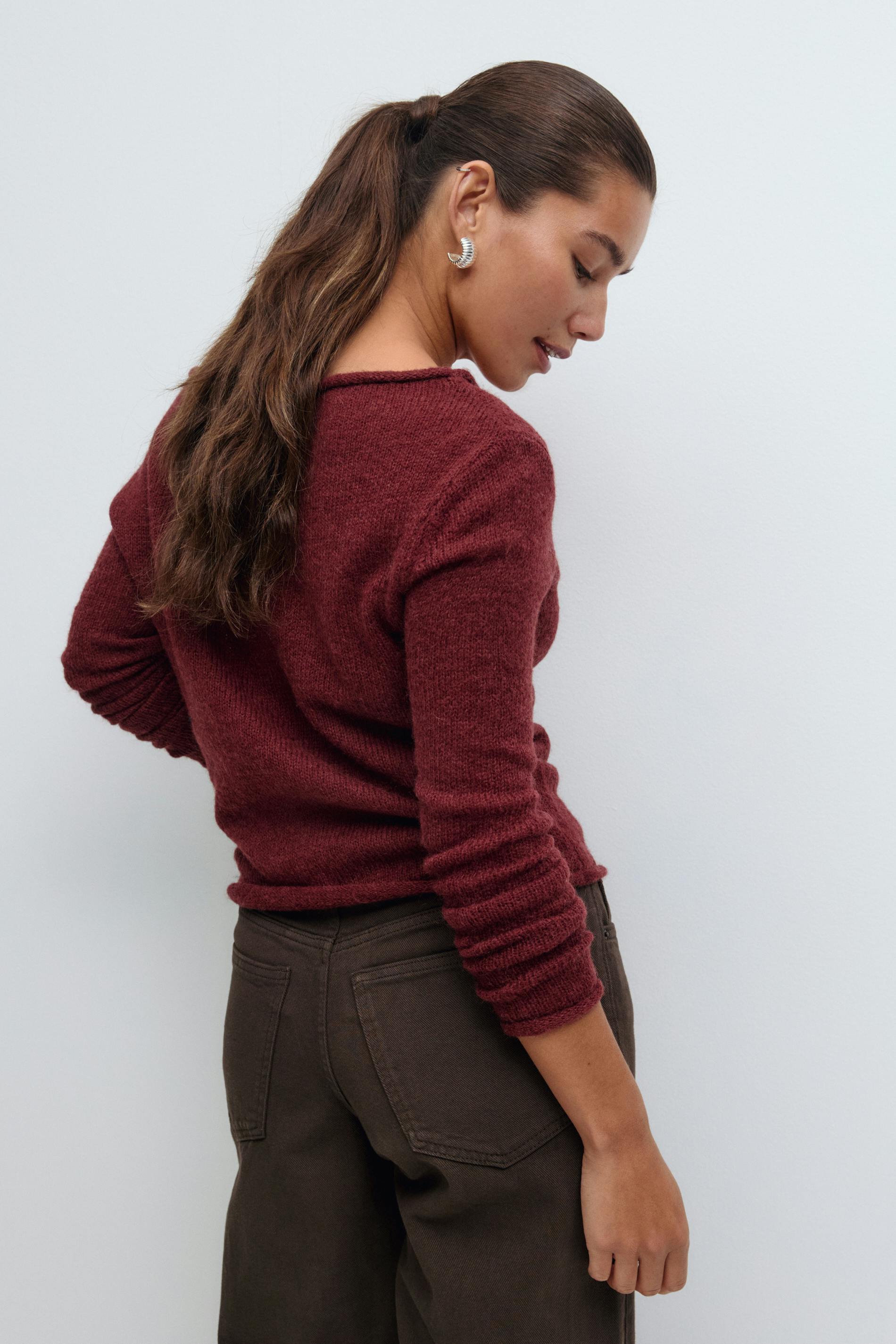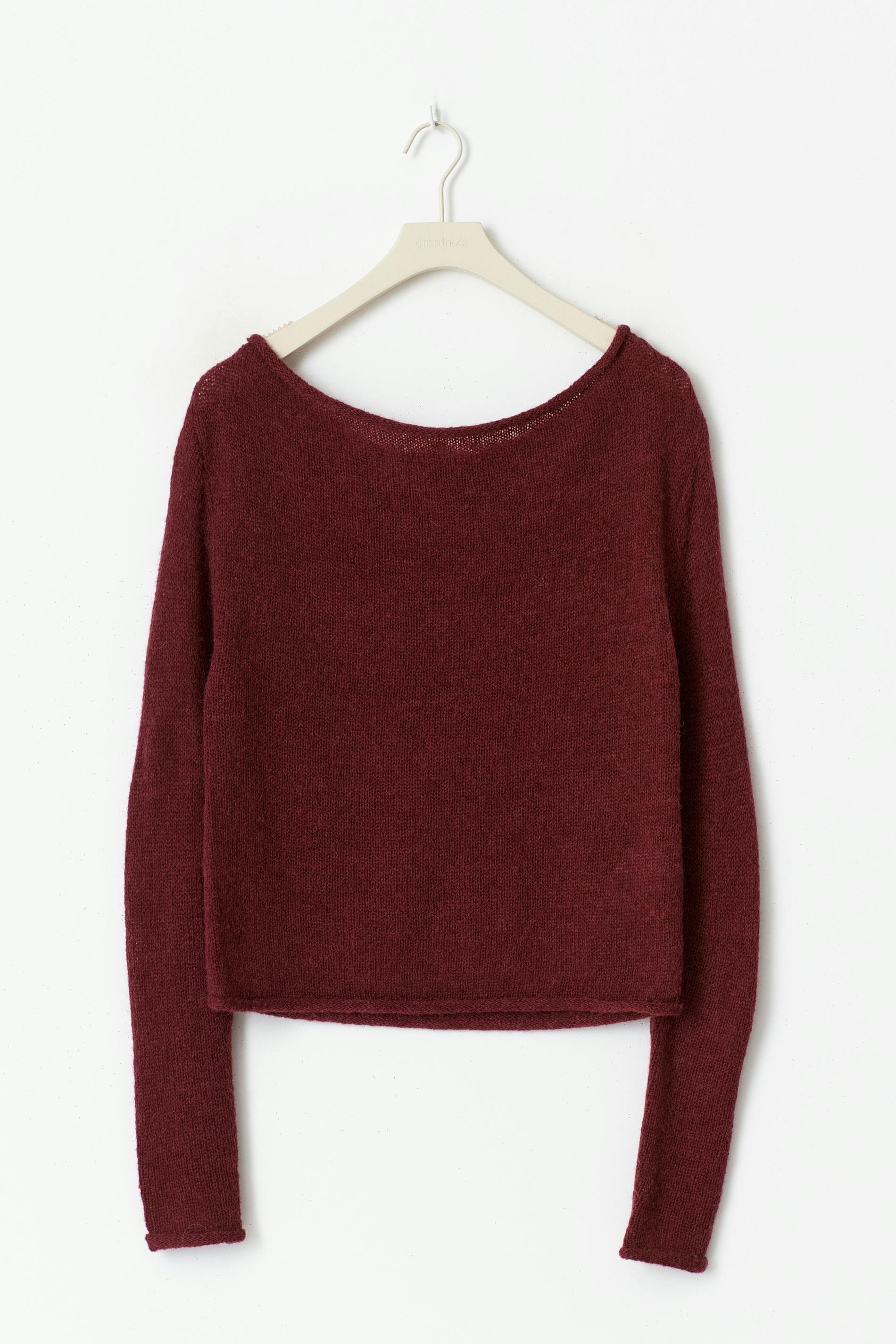 Stickad topp med off shoulder-design. Toppen är vinröd och har båtringning. Den har långa ärmar och en normal passform.