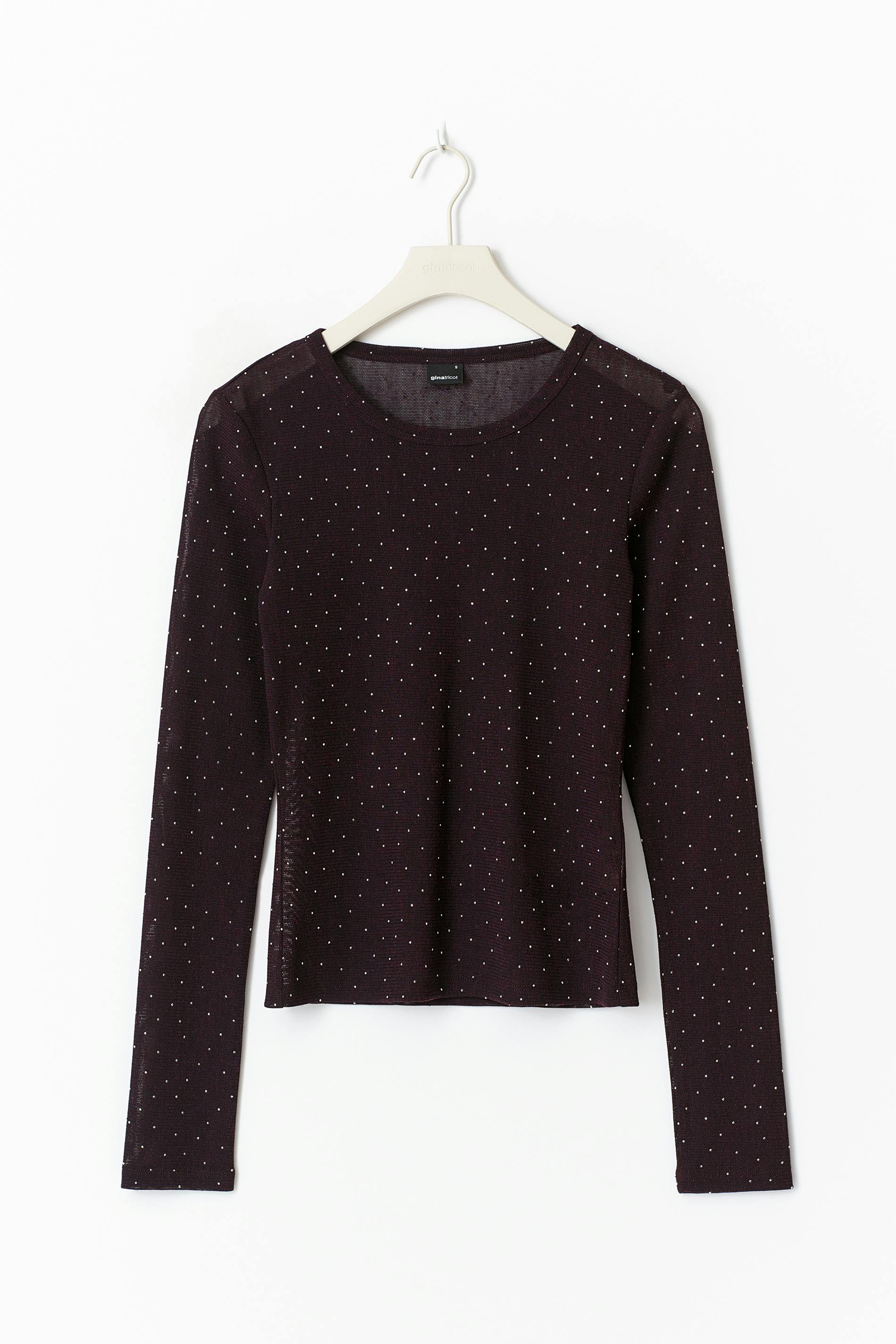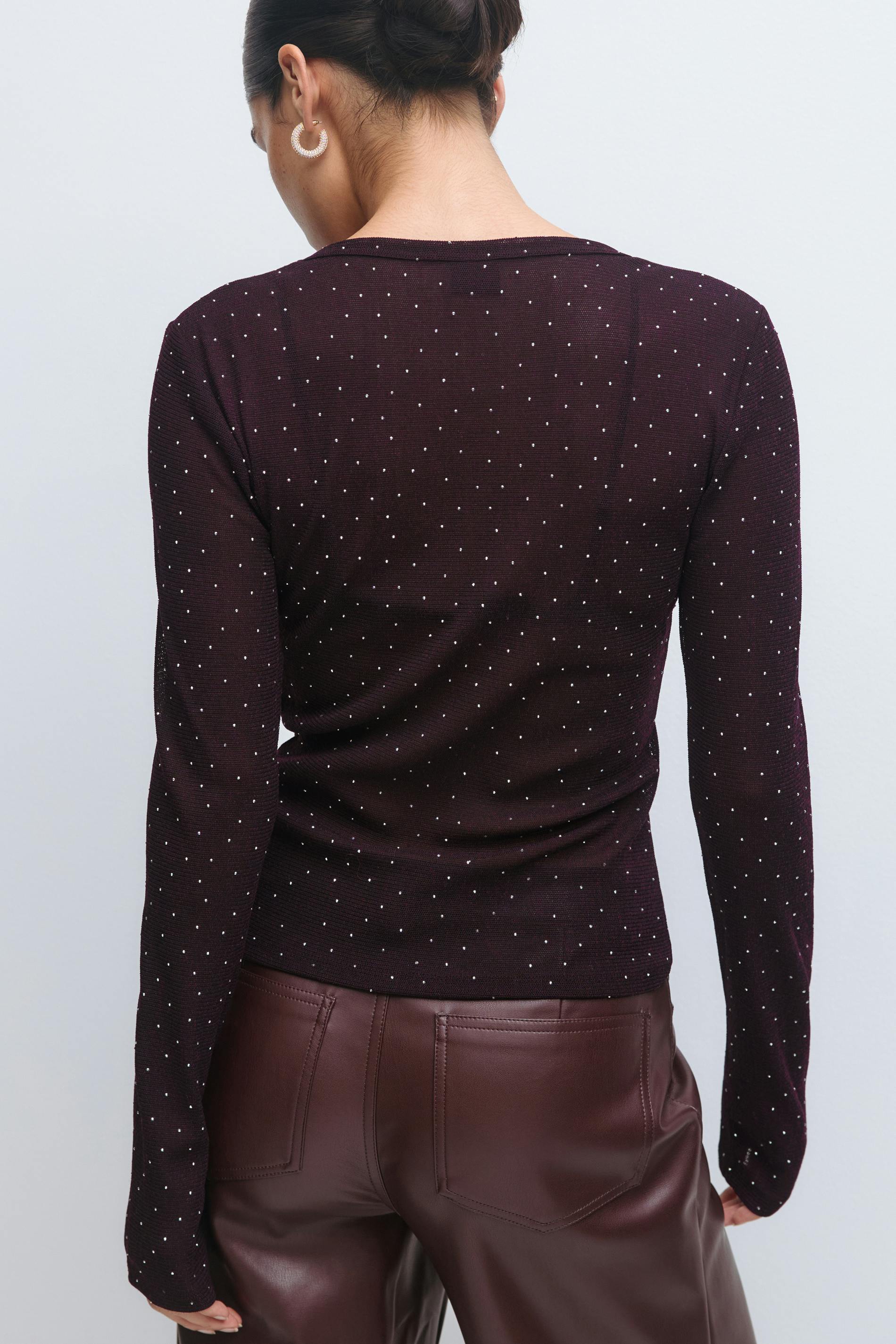 Strassprydd topp med en figurnära passform. Toppen är vinröd och långärmad och har en rund halsringning. Den har normallängd.