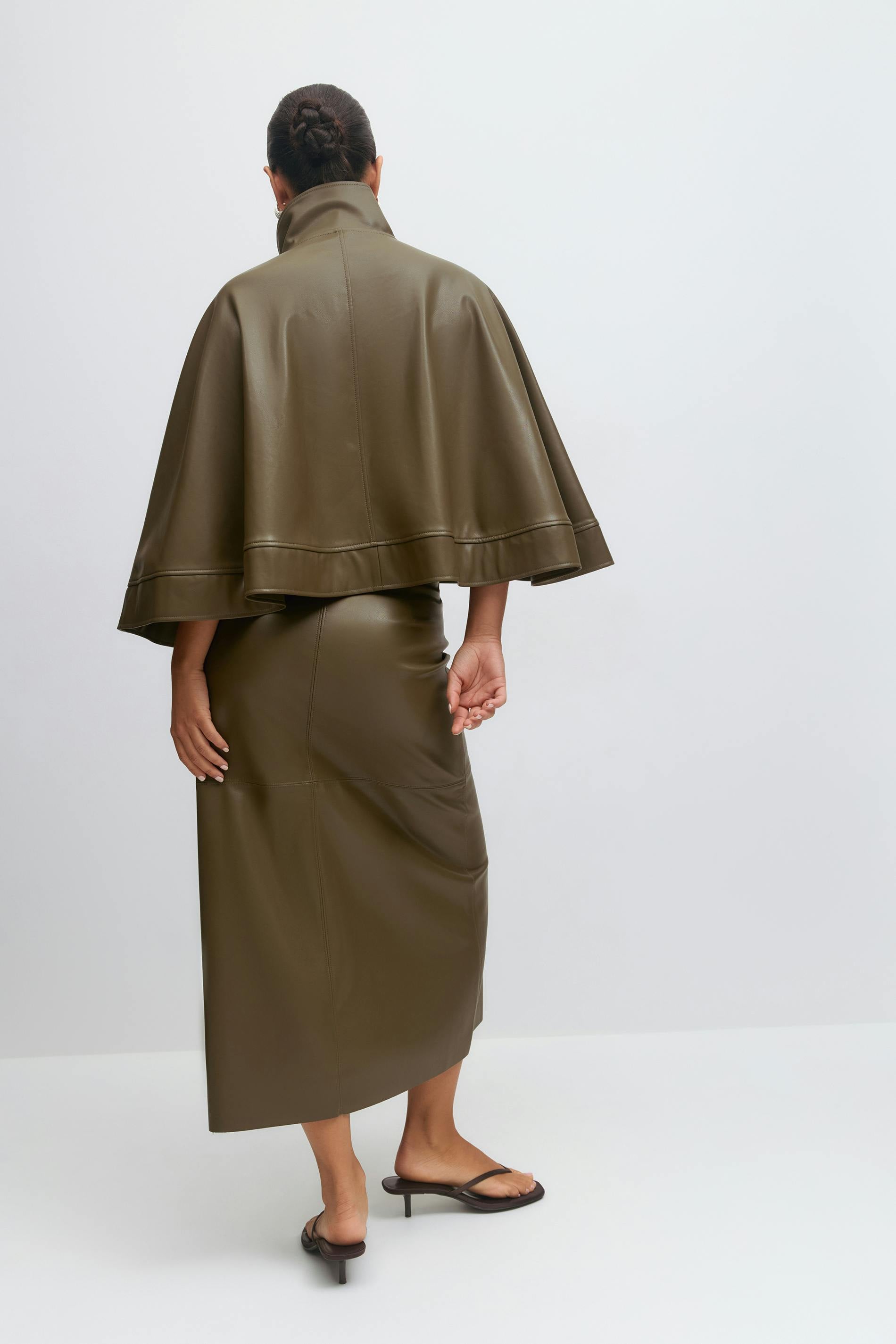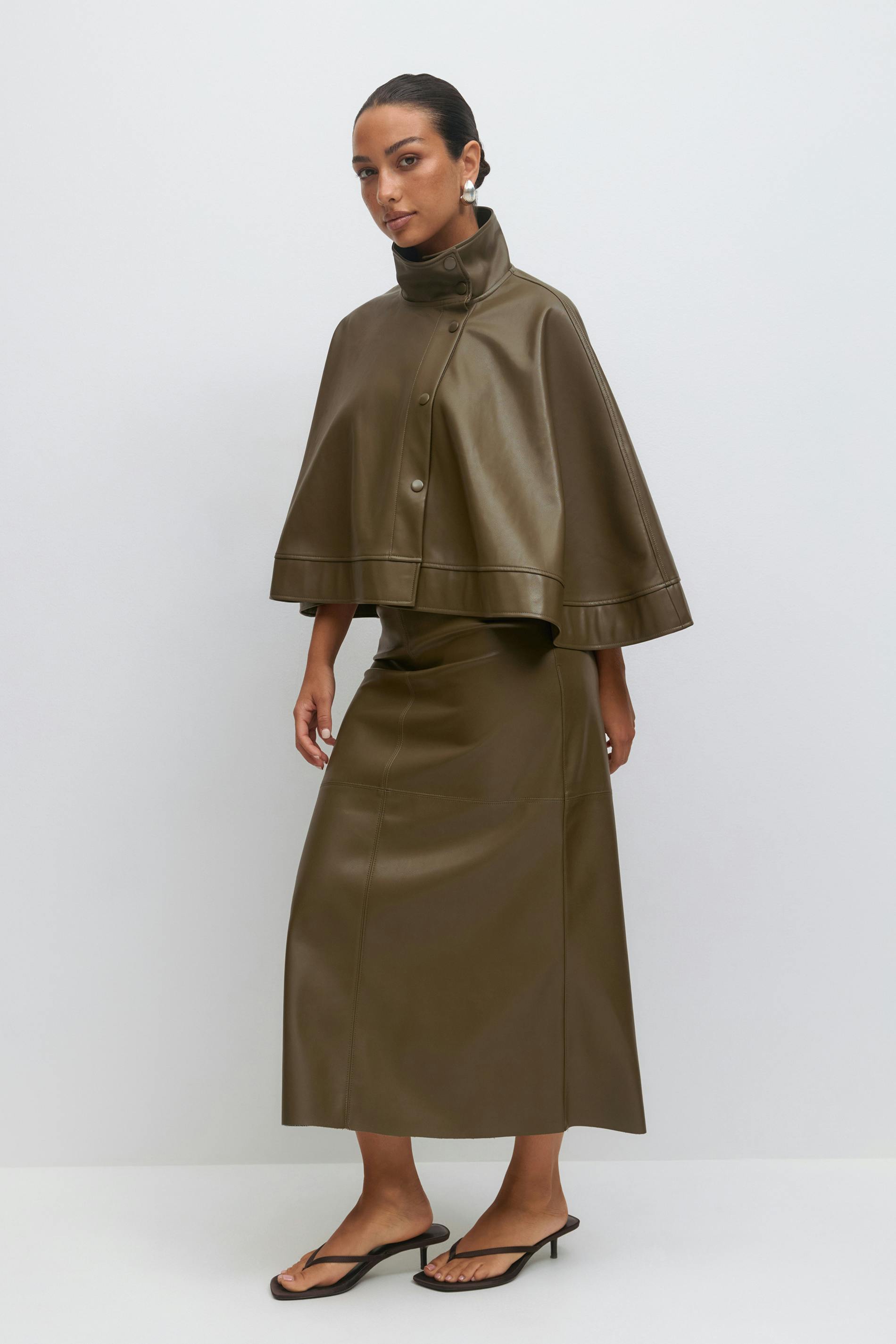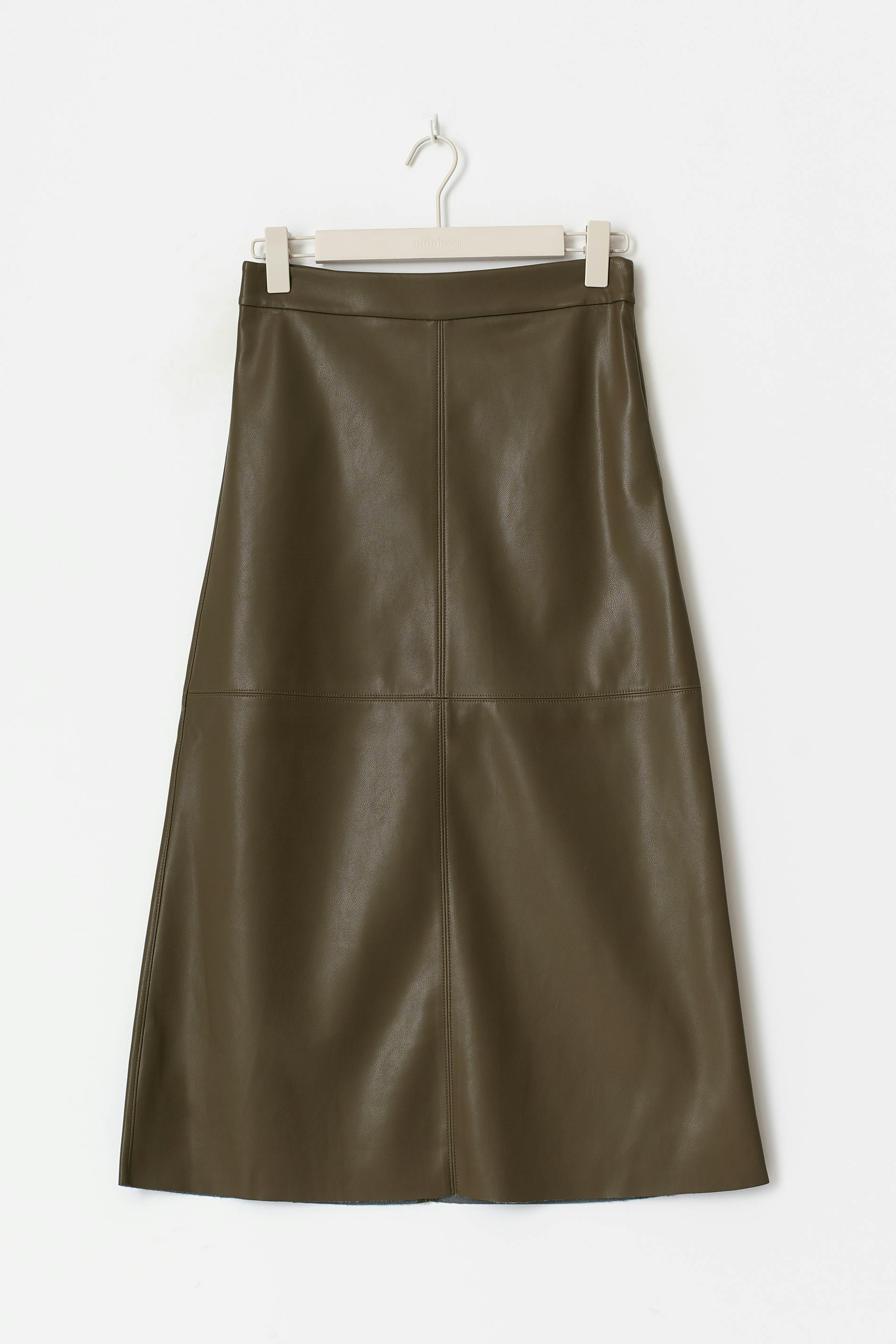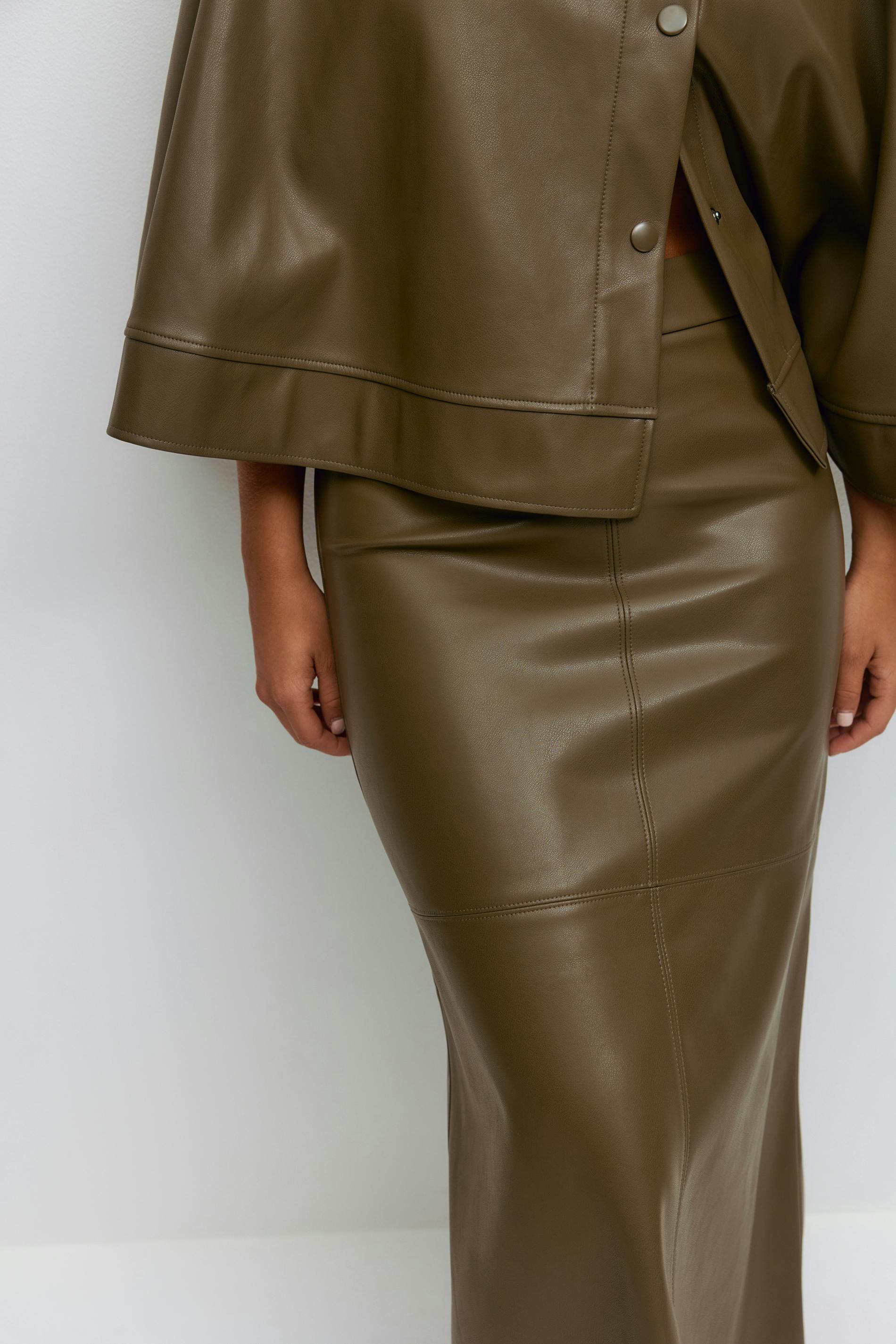 Lång skinnkjol i läderimitation med sömdetaljer. Kjolen är grön och har medelhög midja. Den har normal passform, dold dragkedja och midilängd.