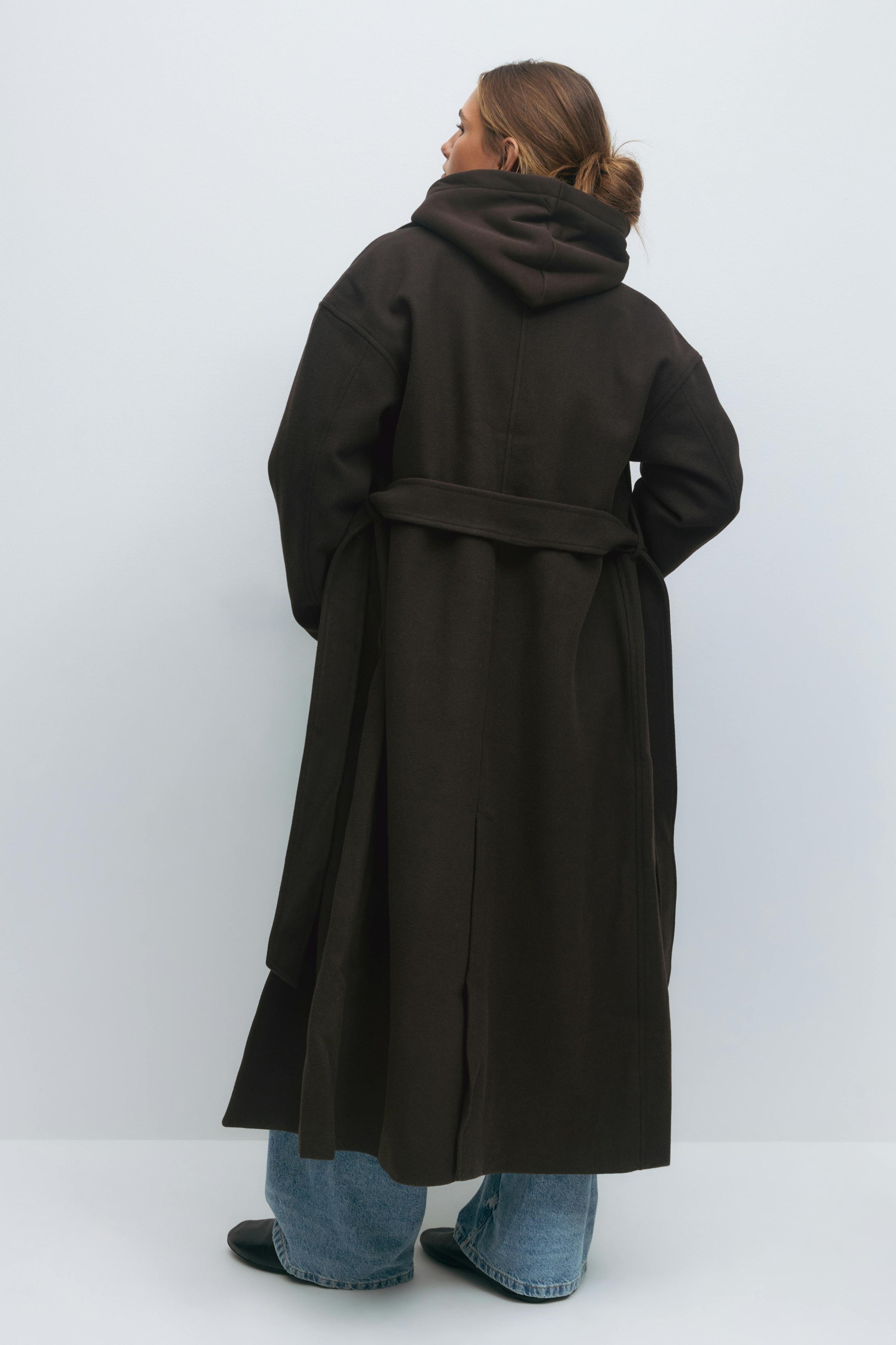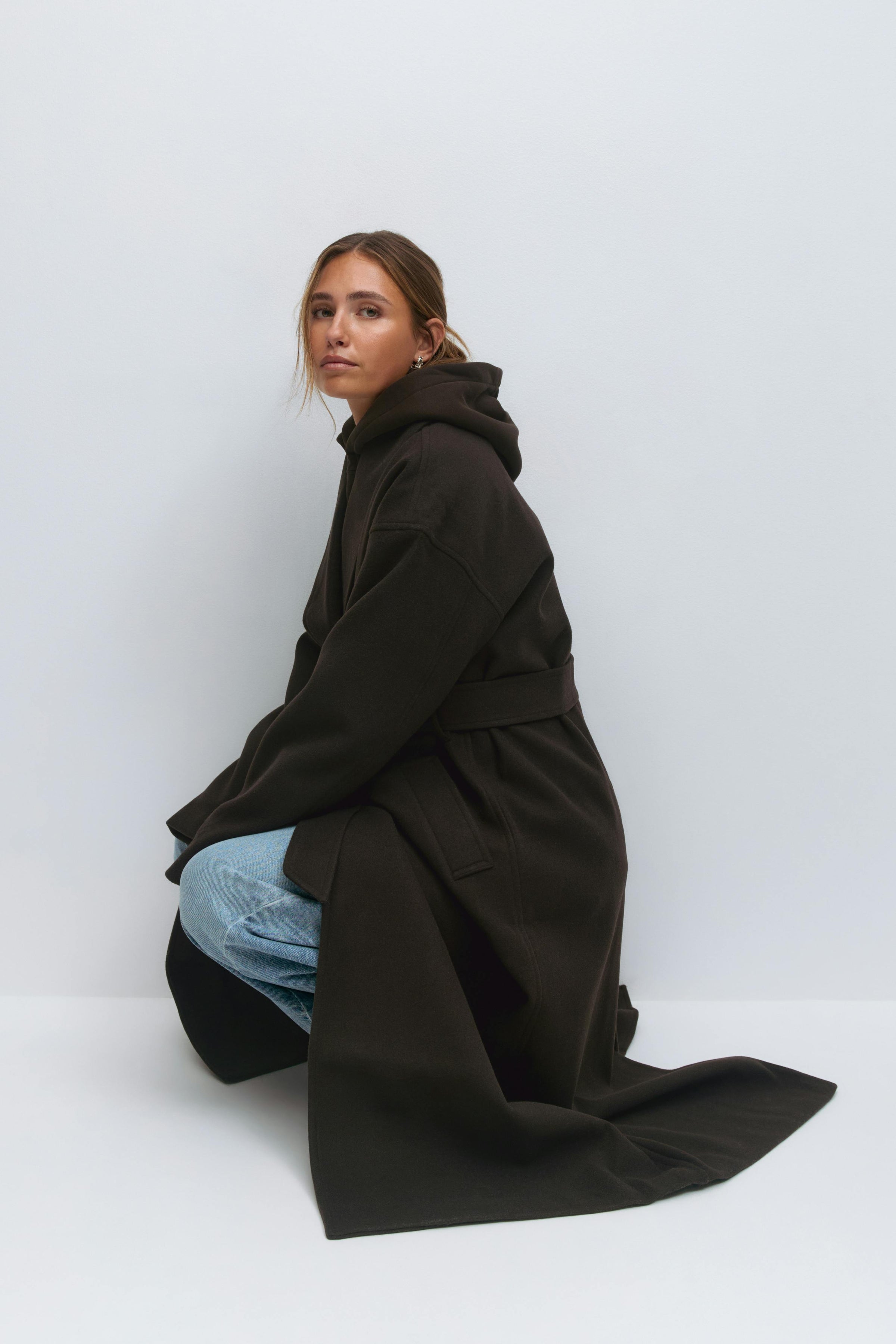 Lång kappa med knytskärp i midjan. Kappan är brun och har oversize fit. Den har fickor i sidorna, sjalkrage, dold knäppning framtill och slits bak.