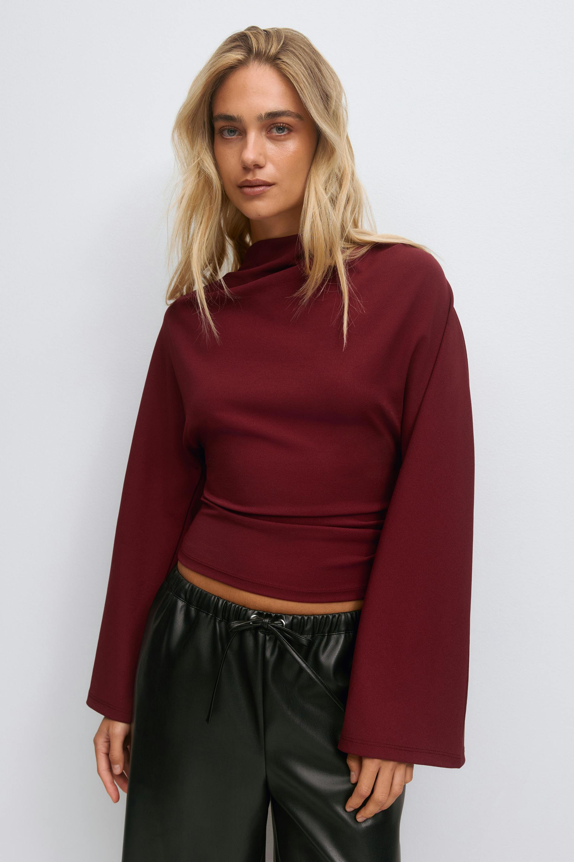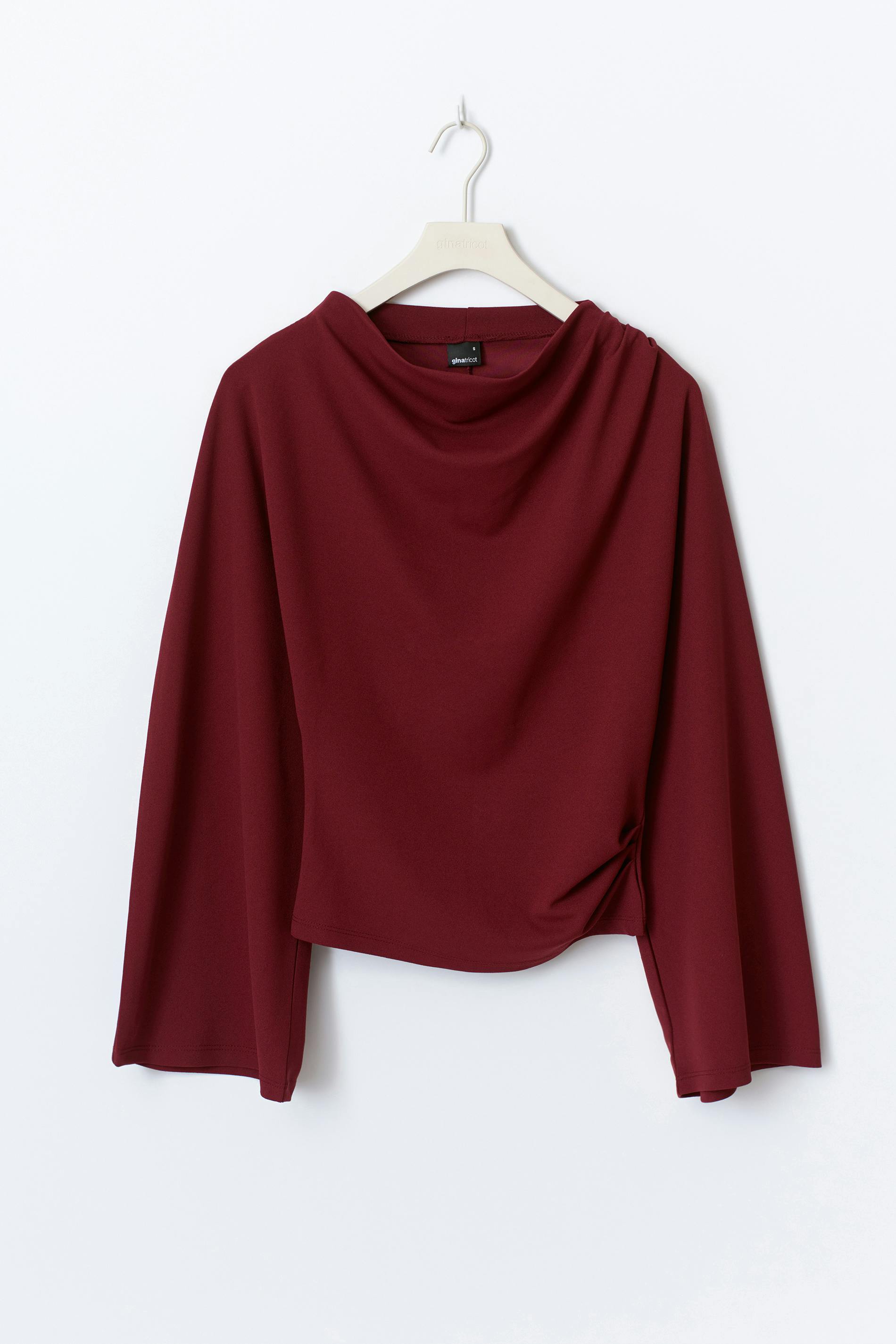 Draperad topp med vida armar. Toppen är mörkröd och har en hög halsringning. Den har rynkningar på sidorna och en normal passform.
