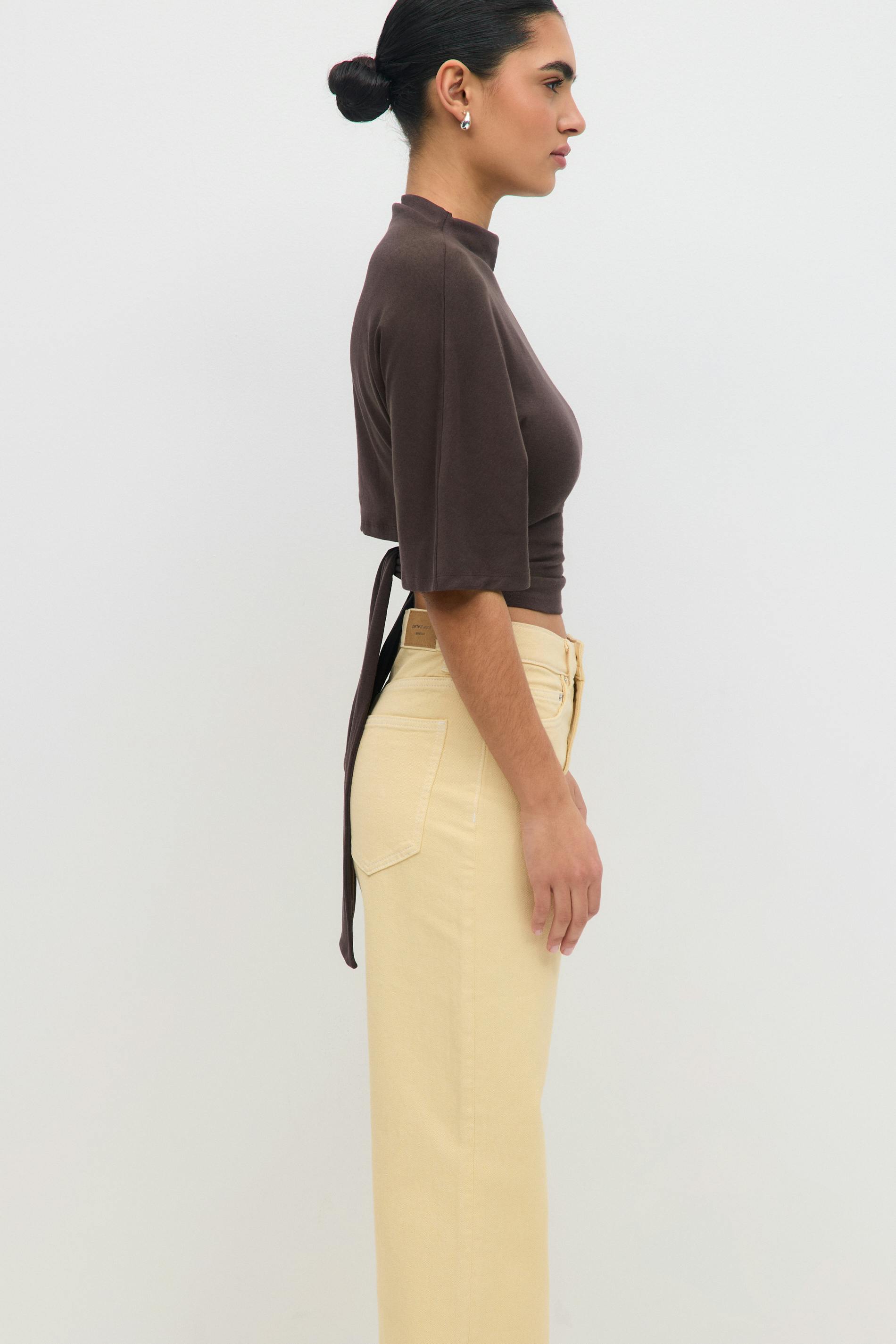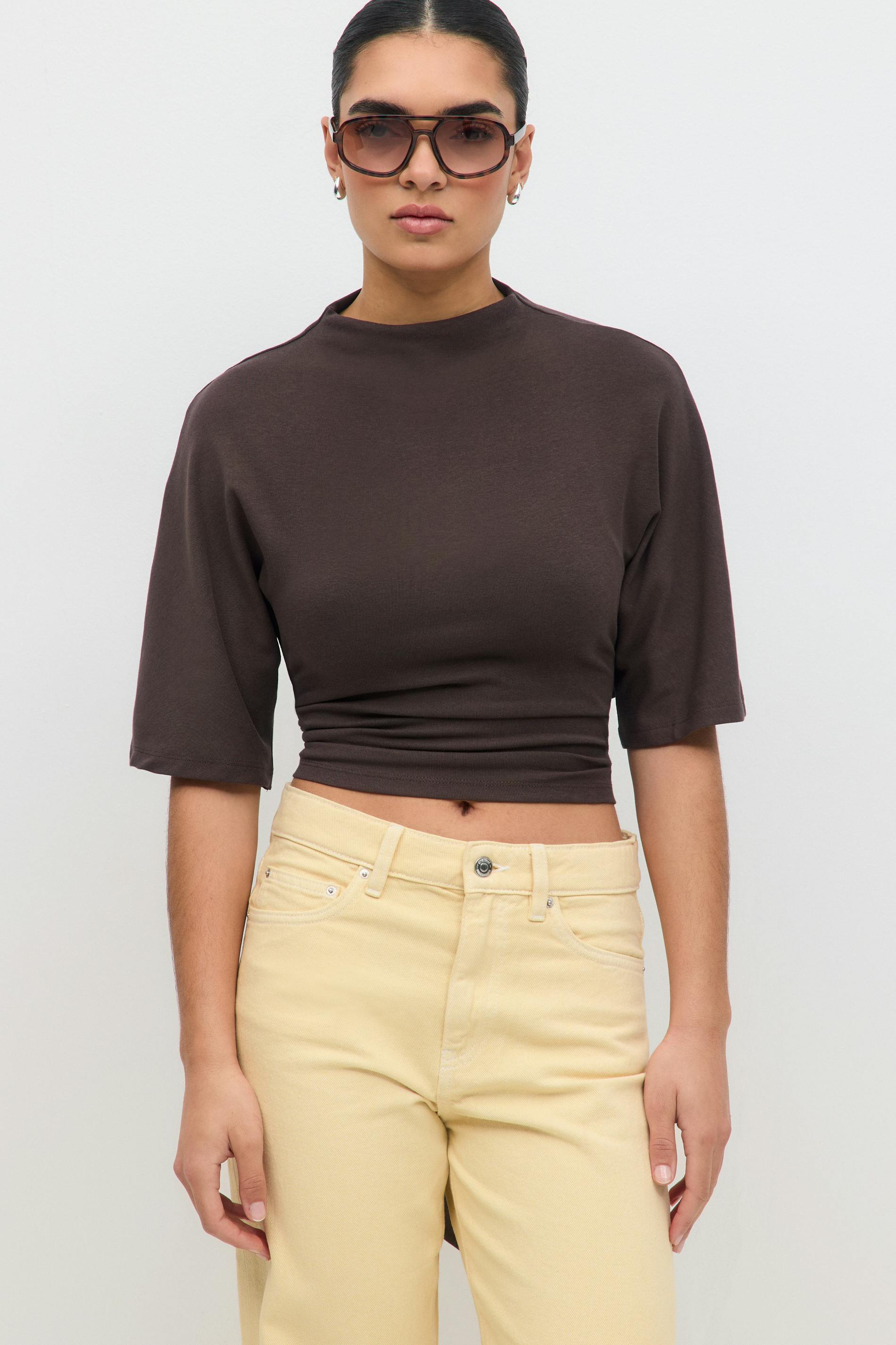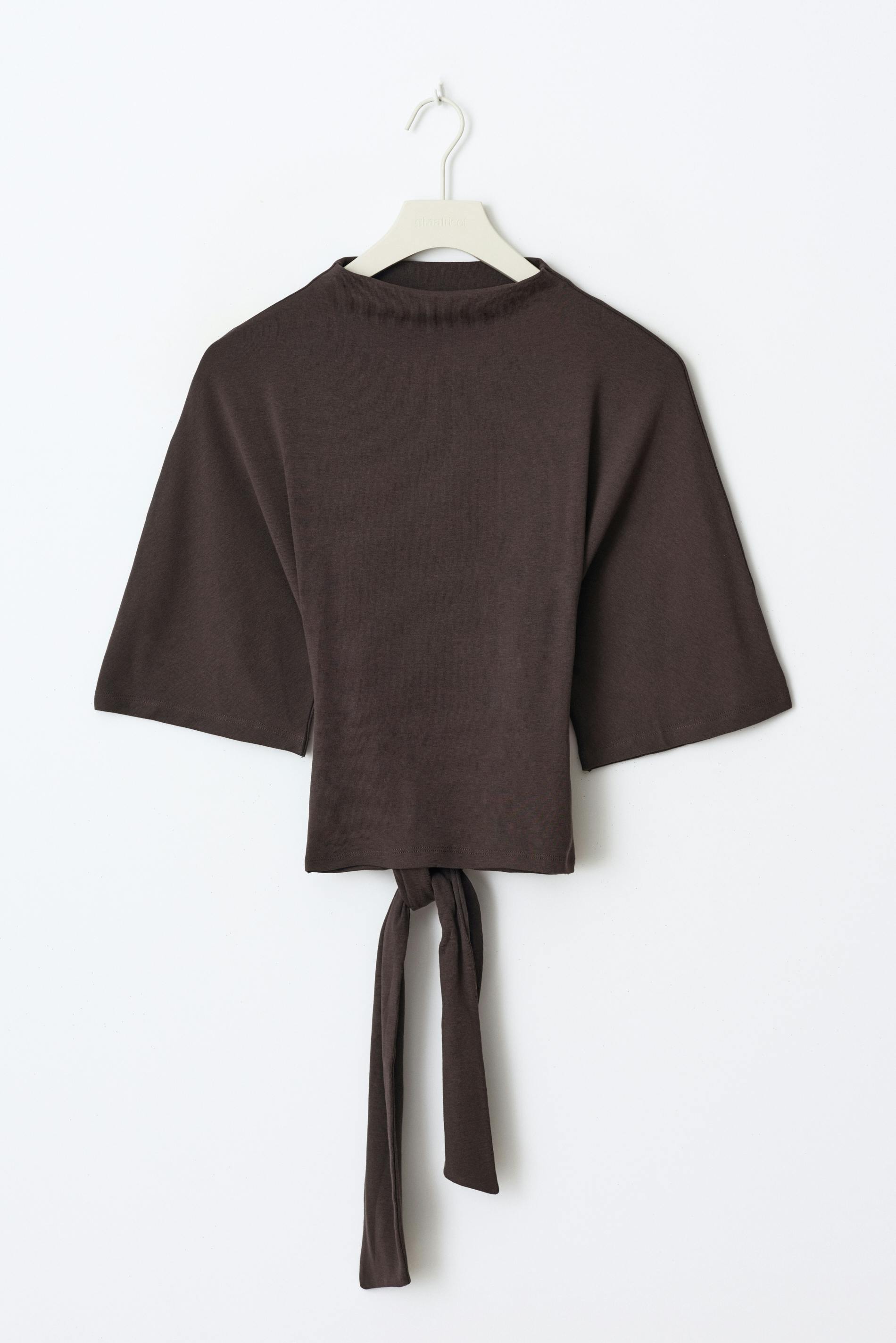 Cropped t-shirt with tie detail in the back. The t-shirt is brown and has short sleeve. It has high neckline and regular fit.
