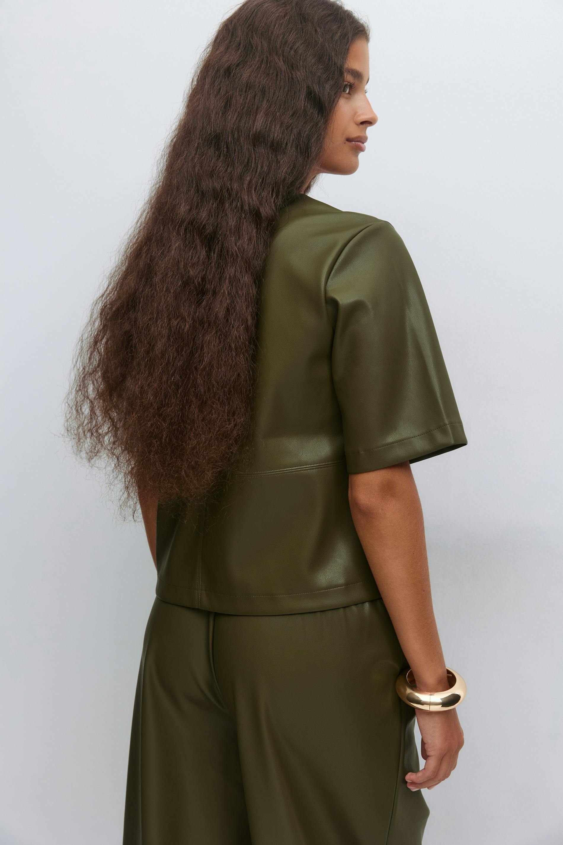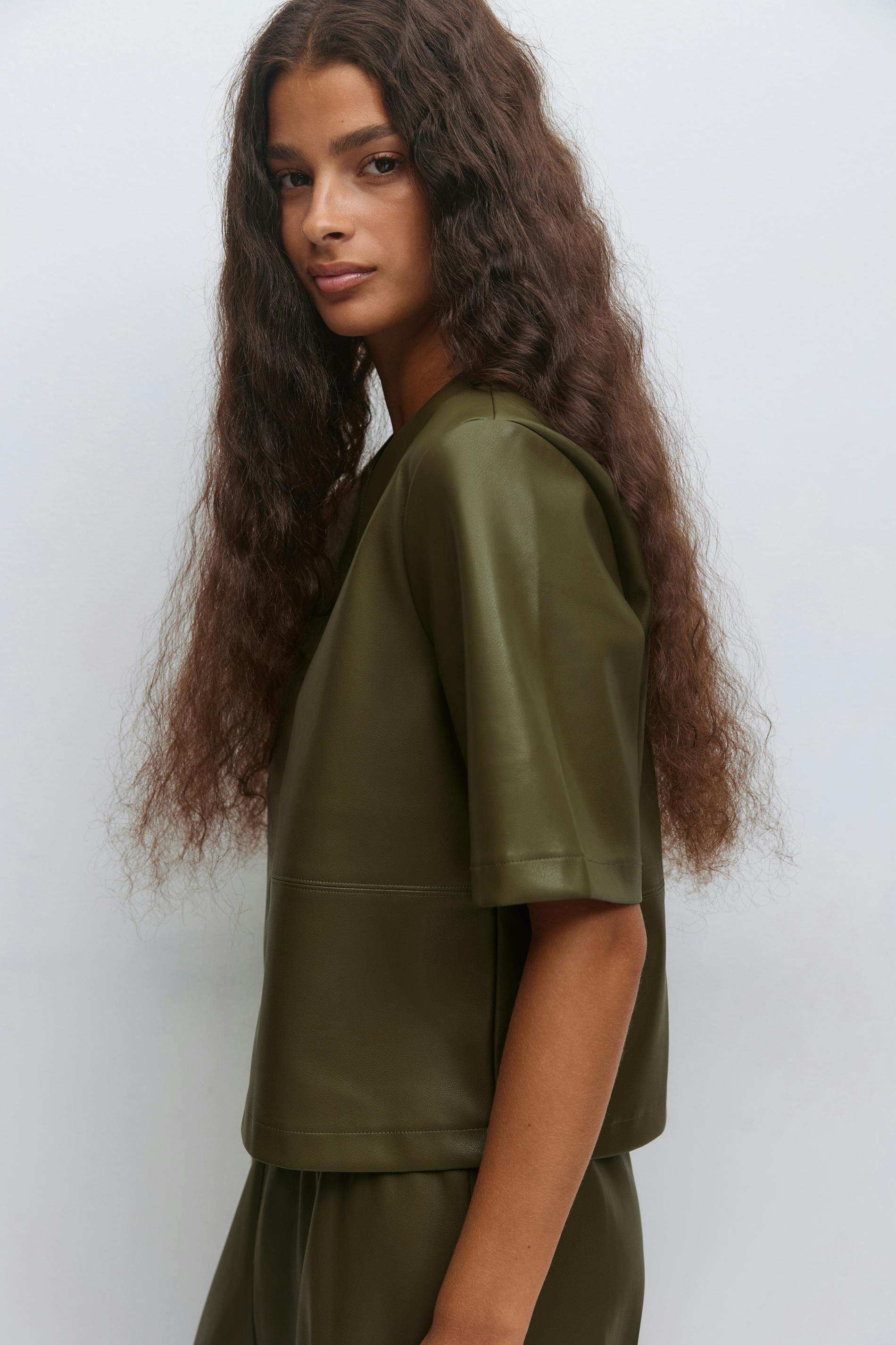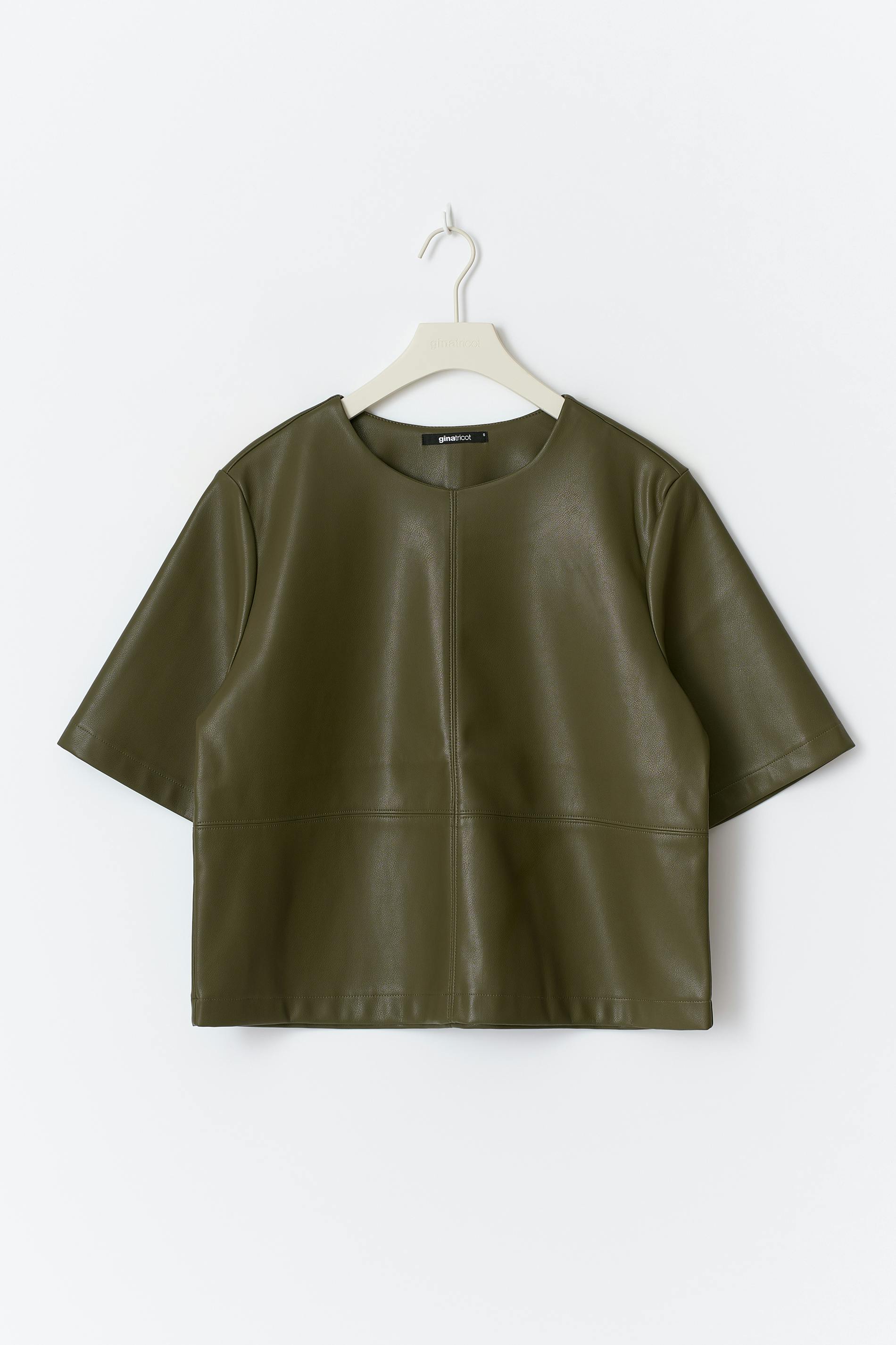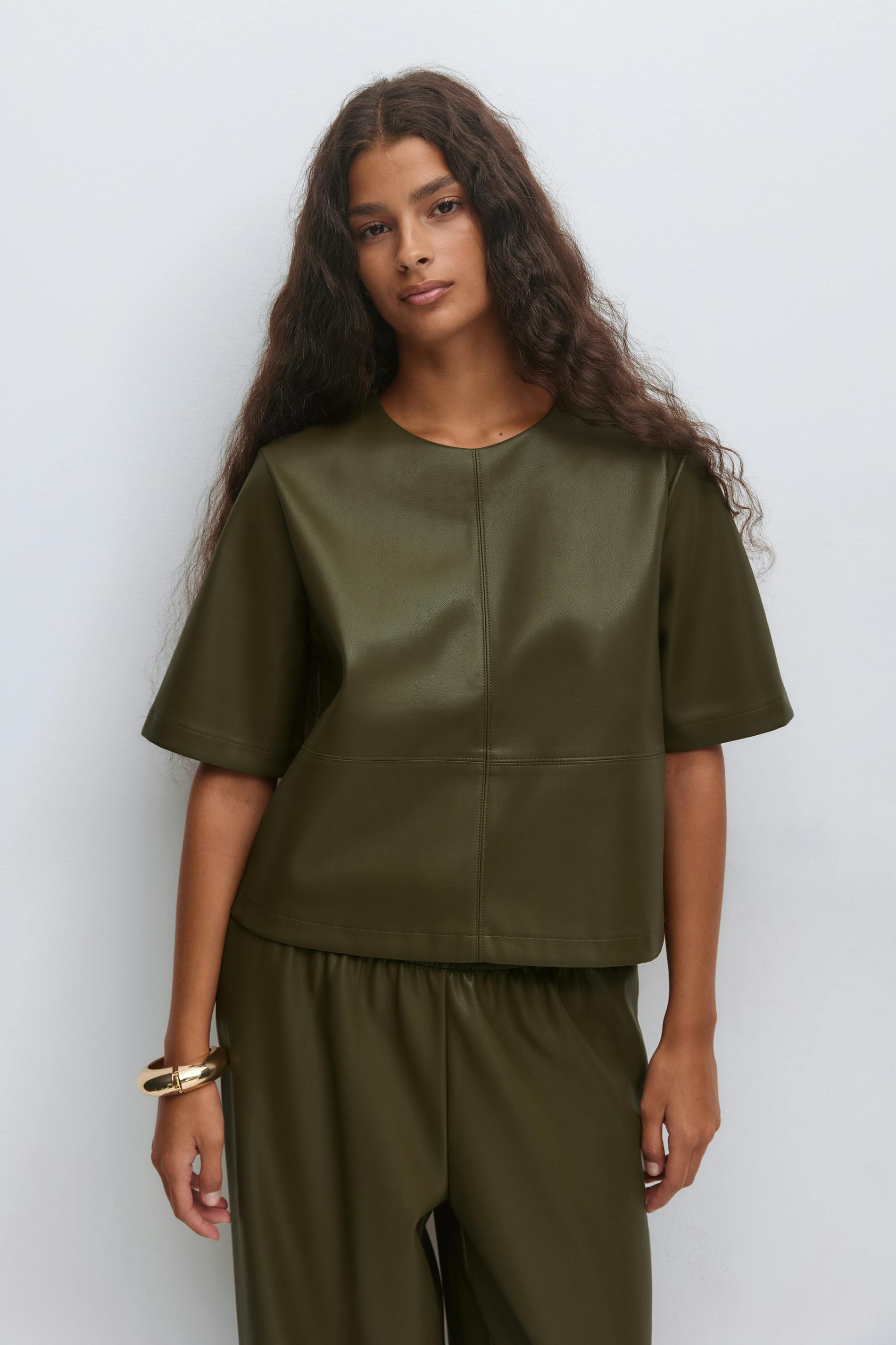 Boxig t-shirt i skinnimitation med korta ärmar. T-shirten är grön och har lös passform. Den har rund halsringning och dekorativa sömdetaljer fram och bak.