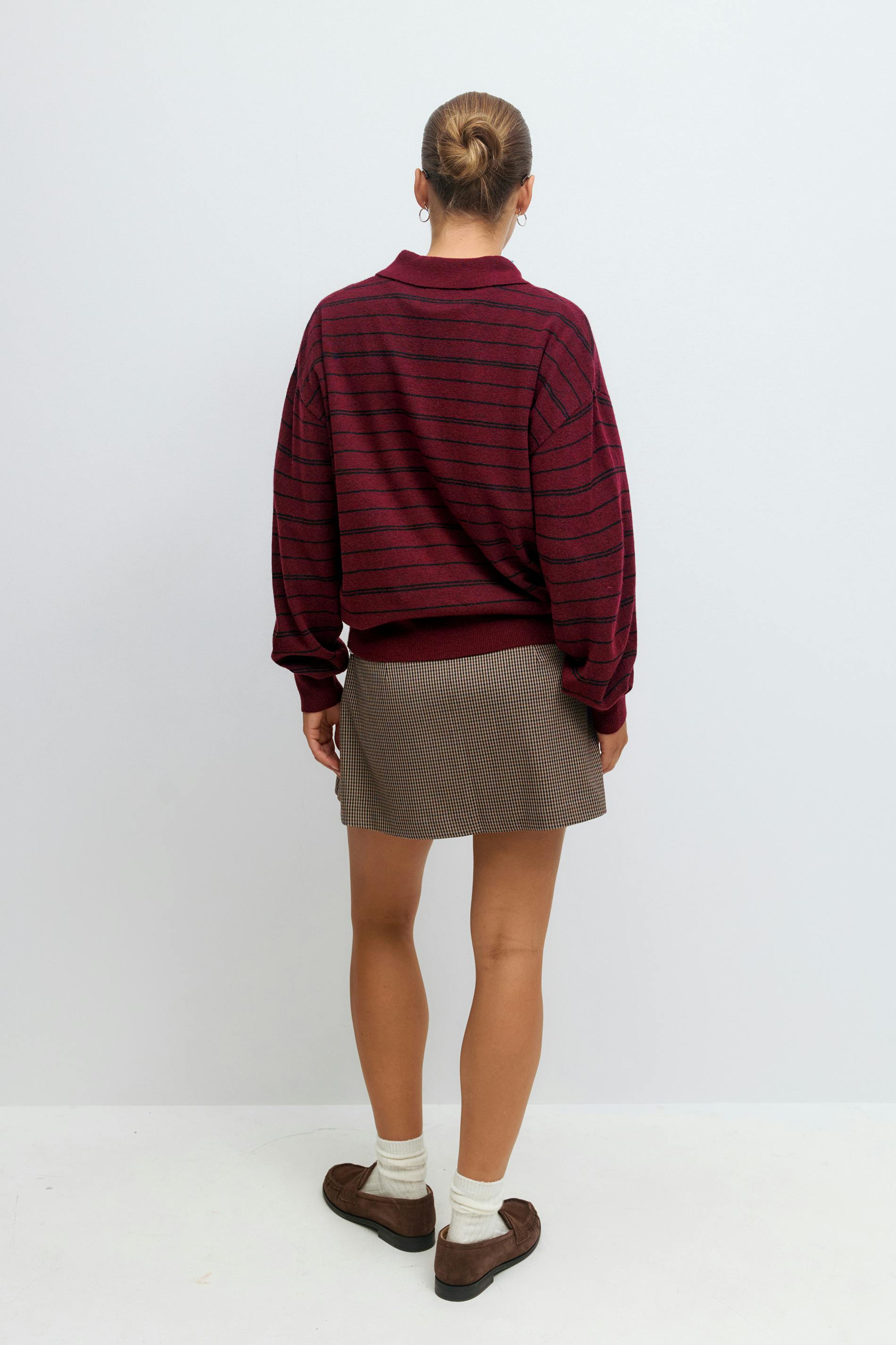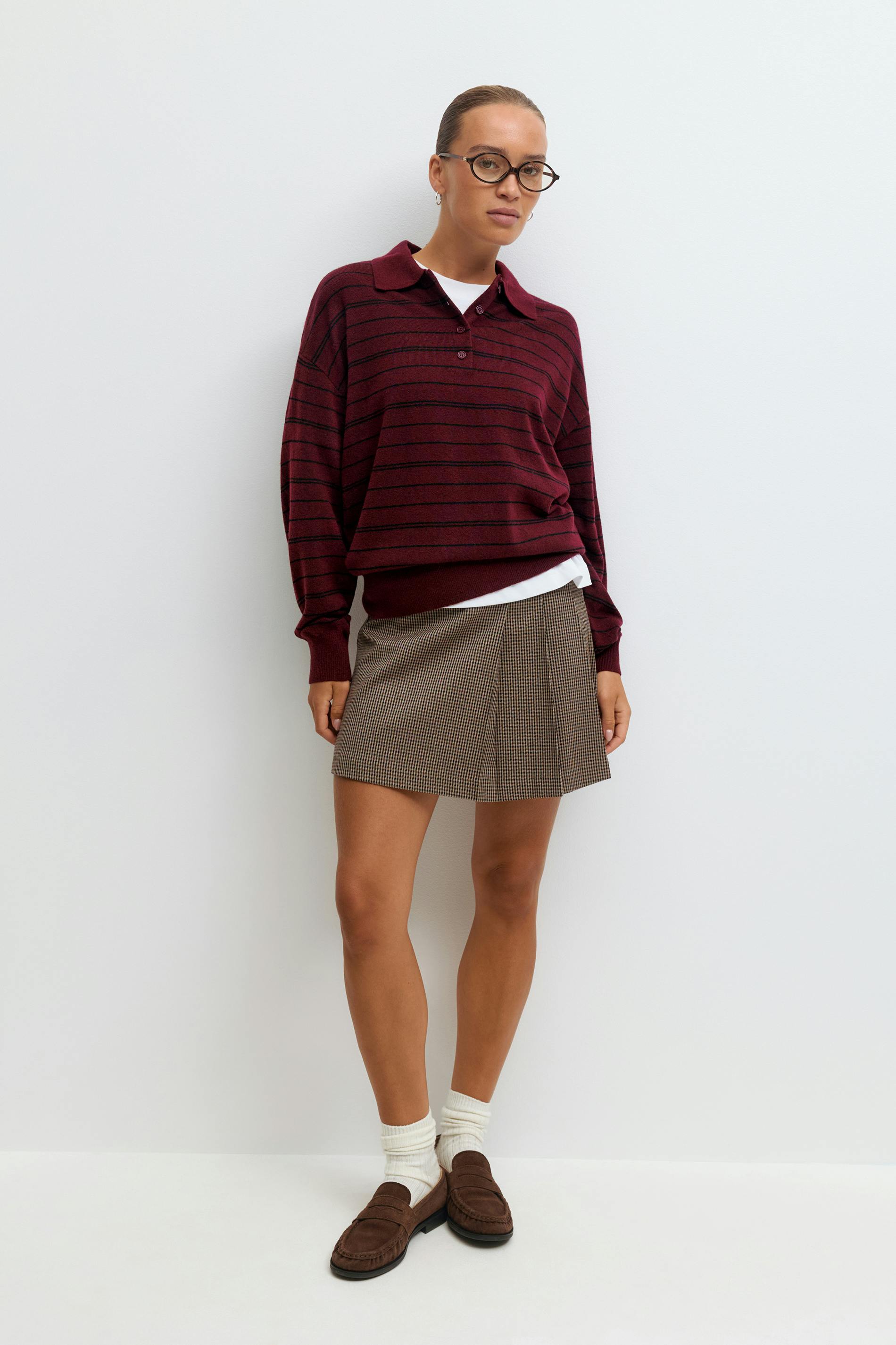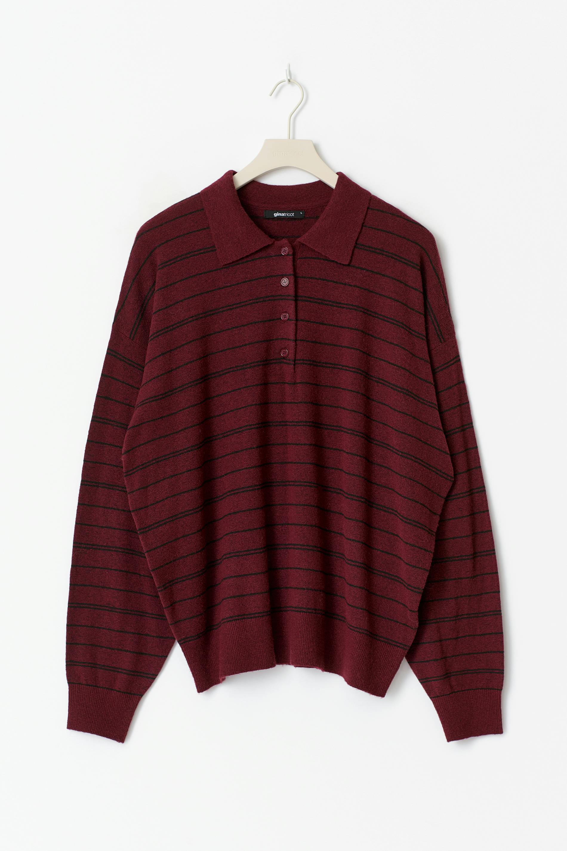 Randig pikétröja med krage. Pikétröjan är vinröd och har knappar upptill. Den har oversize fit, långa ärmar, finstickad kvalitet och ribbad mudd vid ärmslut och i nederkant.