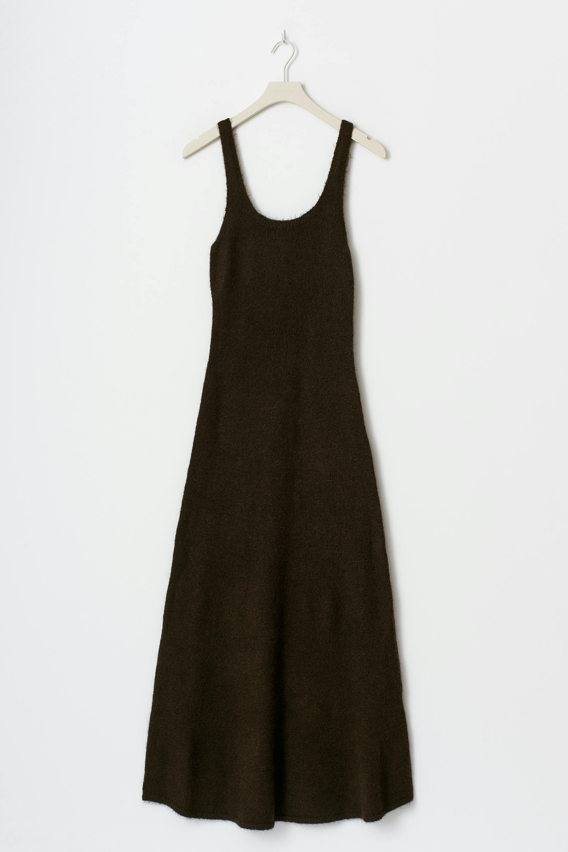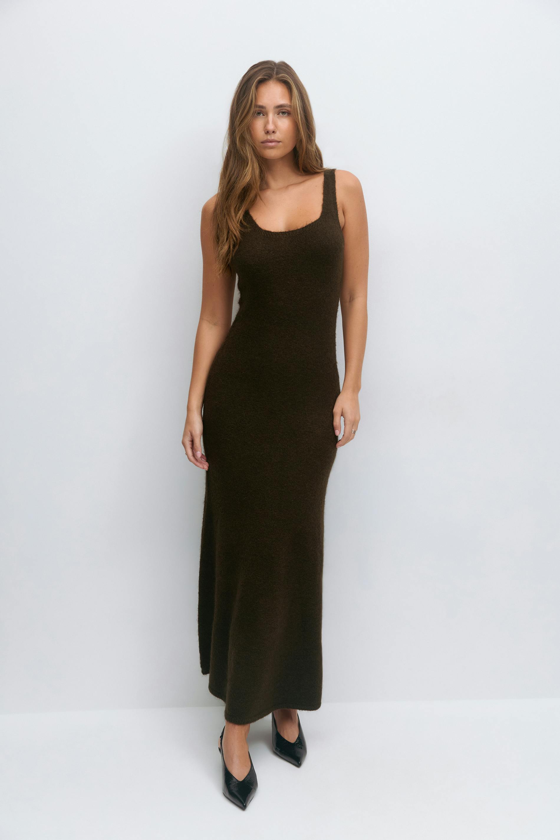 Lång stickad klänning med axelband. Klänningen är brun och har figurnära passform. Den har ärmlös design och utställd nederkant.
