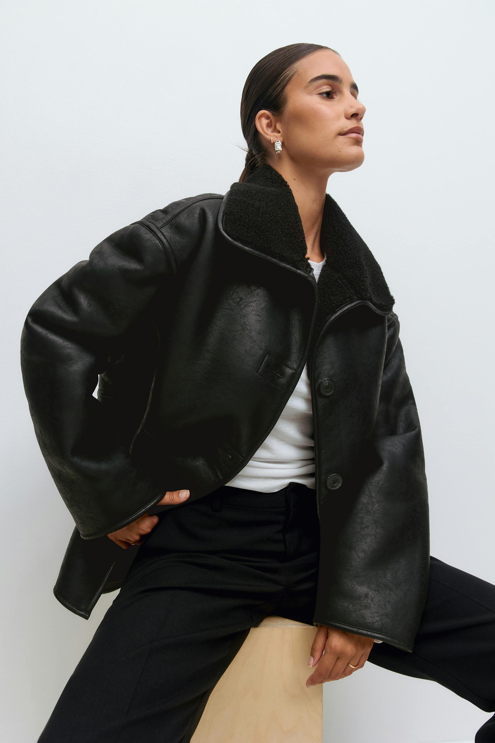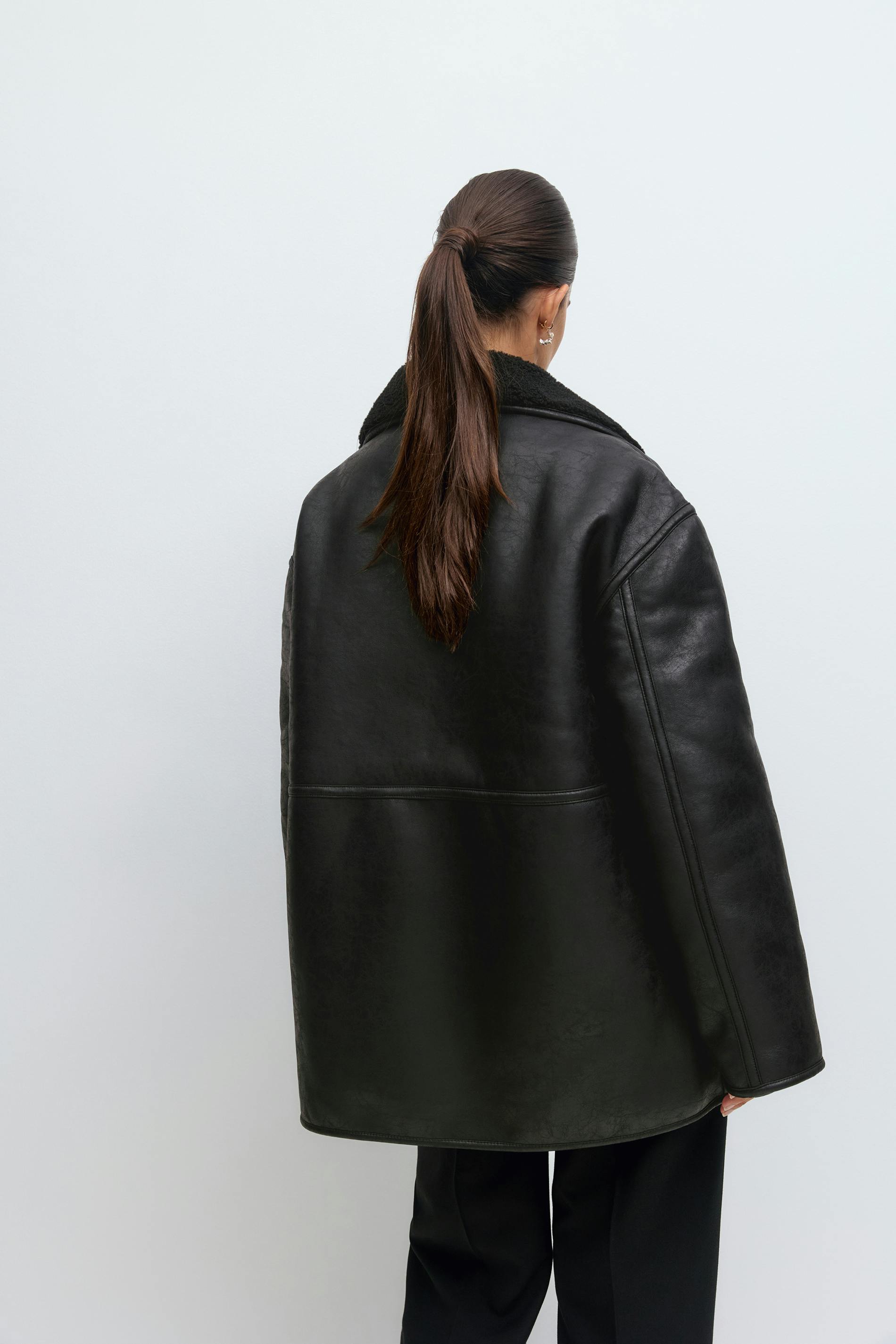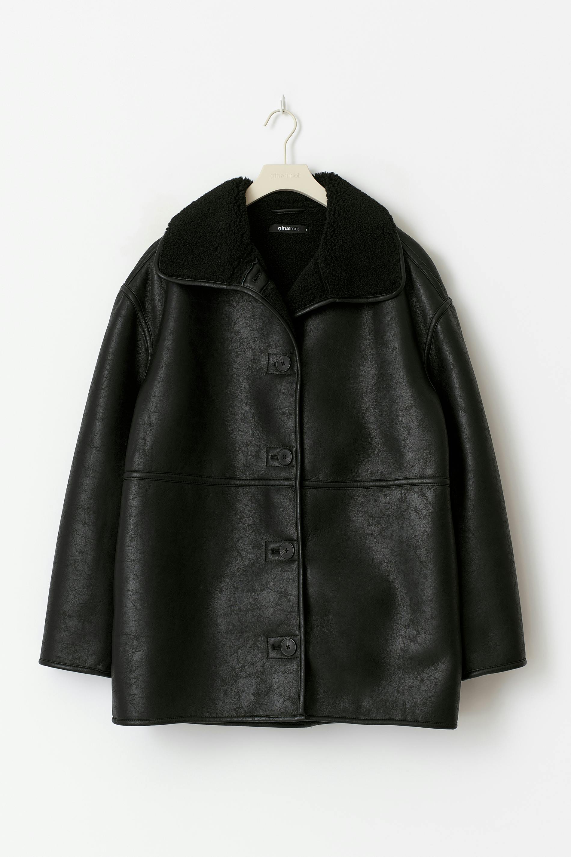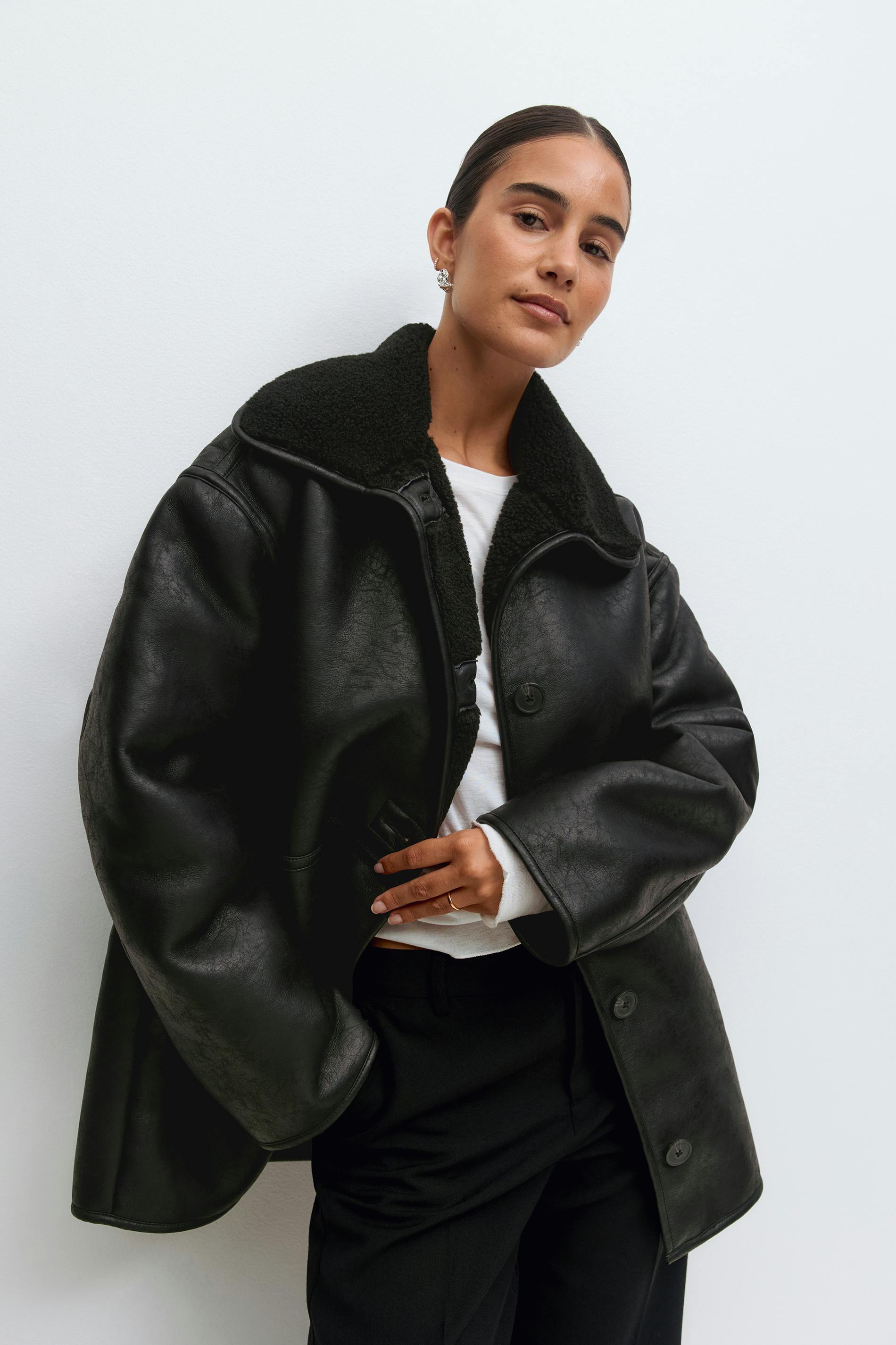 Skinnjacka i läderimitation med teddykrage. Jackan är svart och har oversize fit. Den har lång ärm, knäppning och fickor i sidorna.