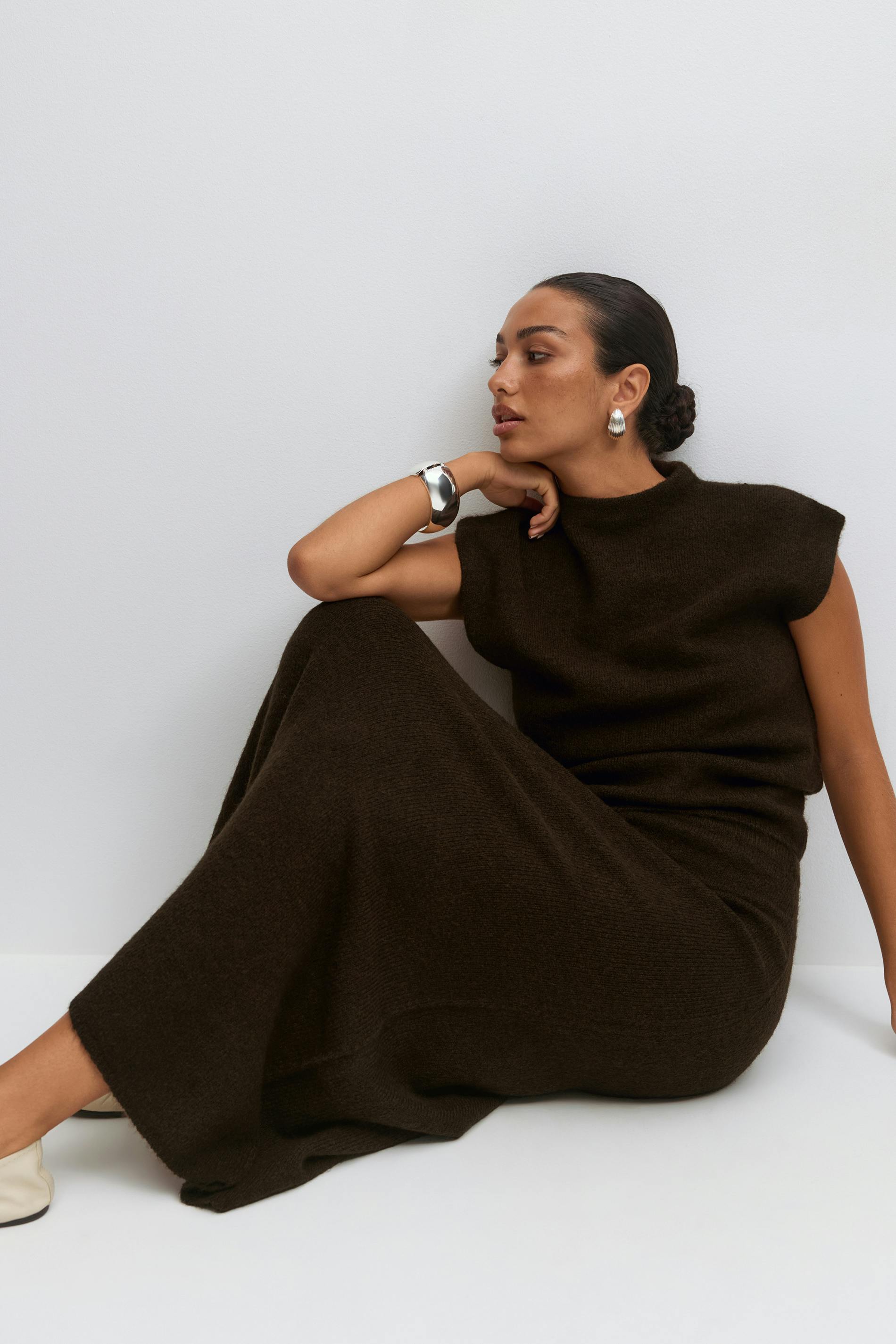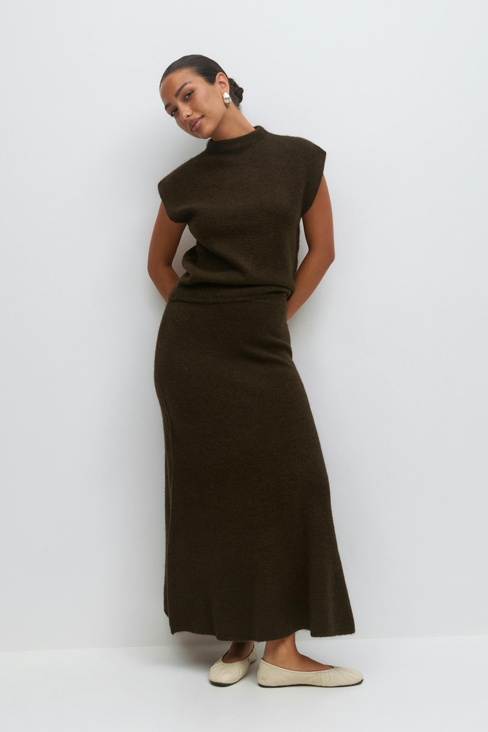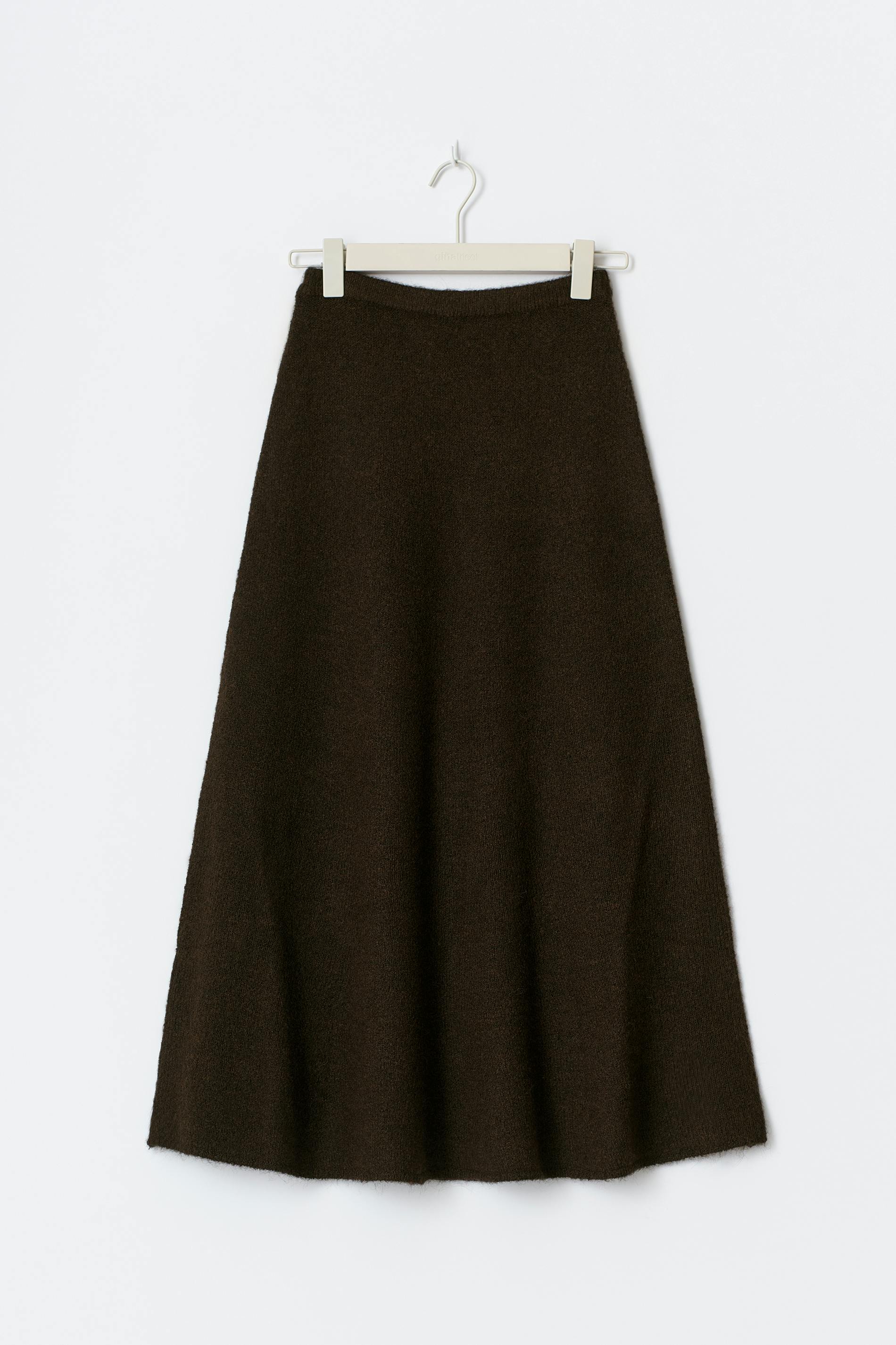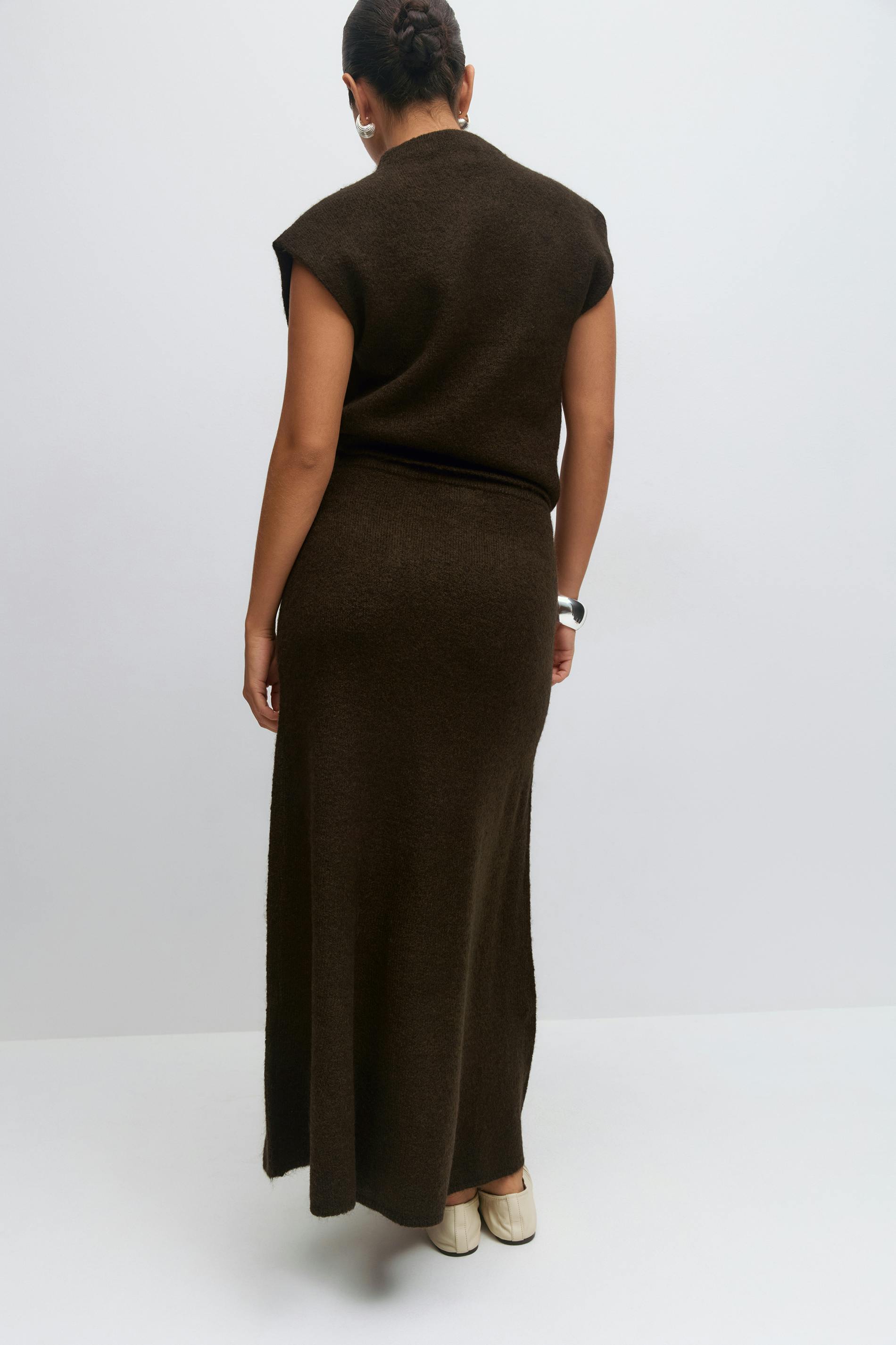 Knitted maxi skirt with soft elastic at the waist. The skirt is brown and has wide fit.