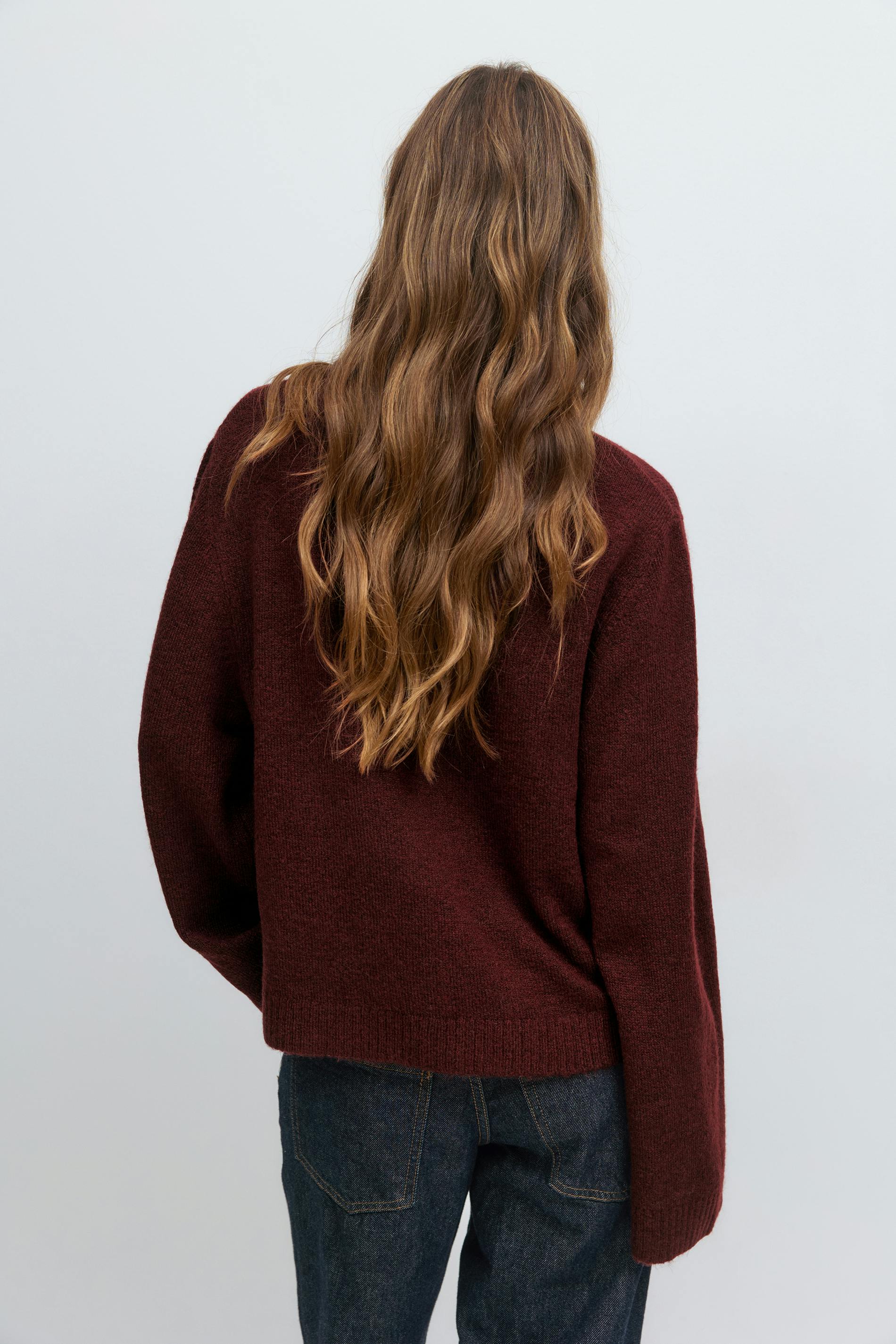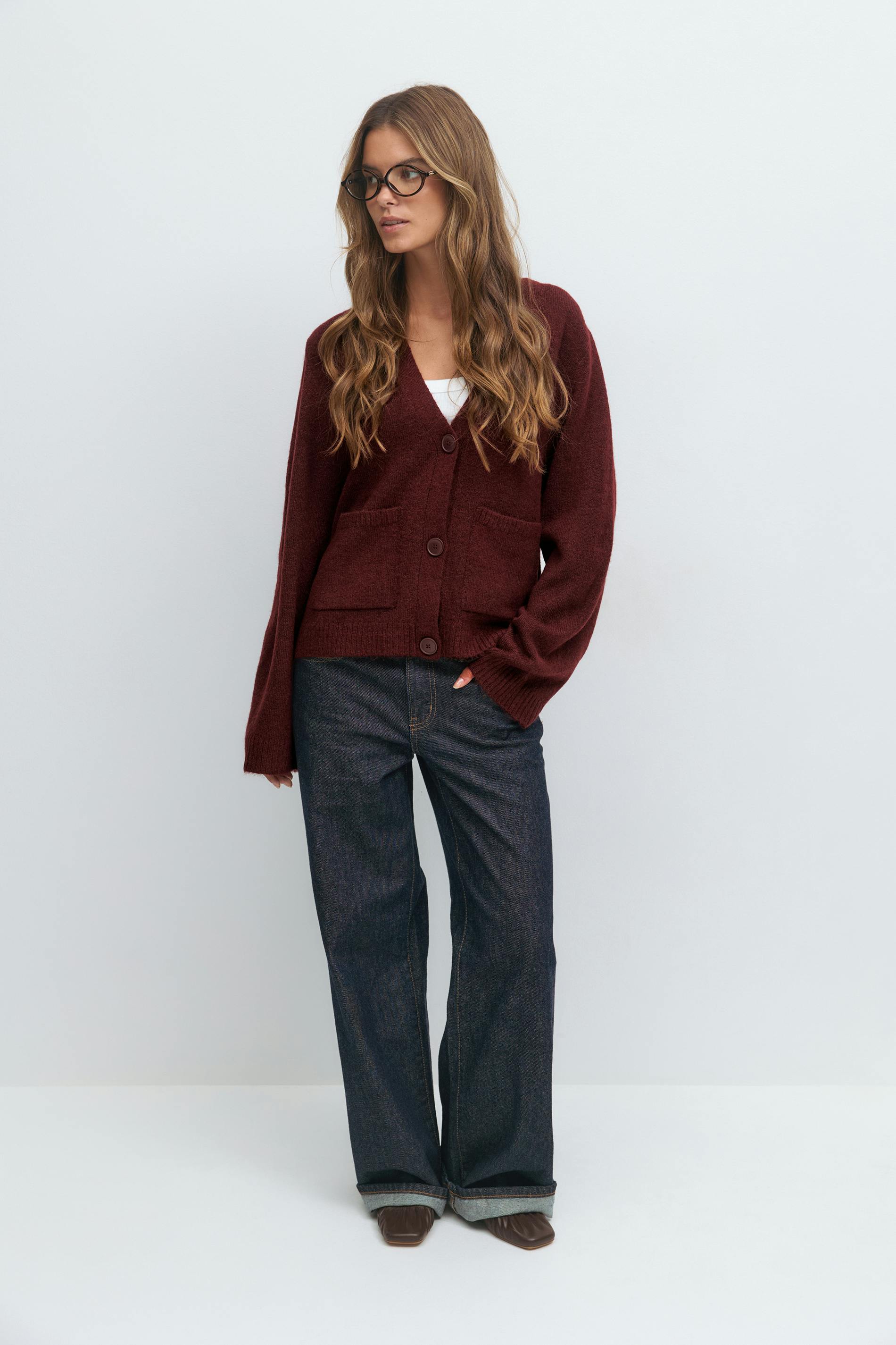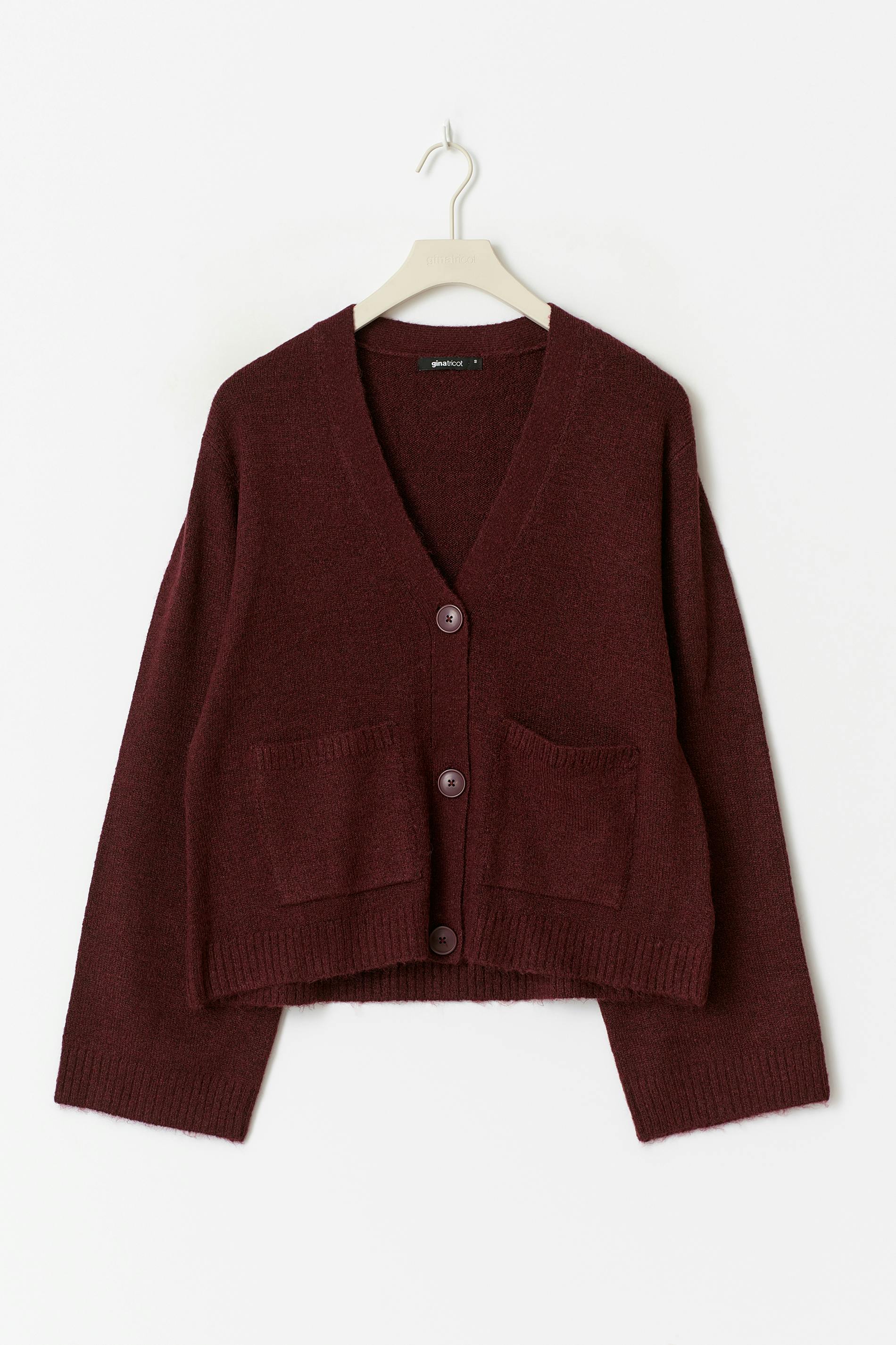 Stickad kofta med stora fickor framtill. Cardigan är vinröd och har djup v-ringning. Den har knappar fram, långa ärmar, normal passform och ribbad nederkant.
