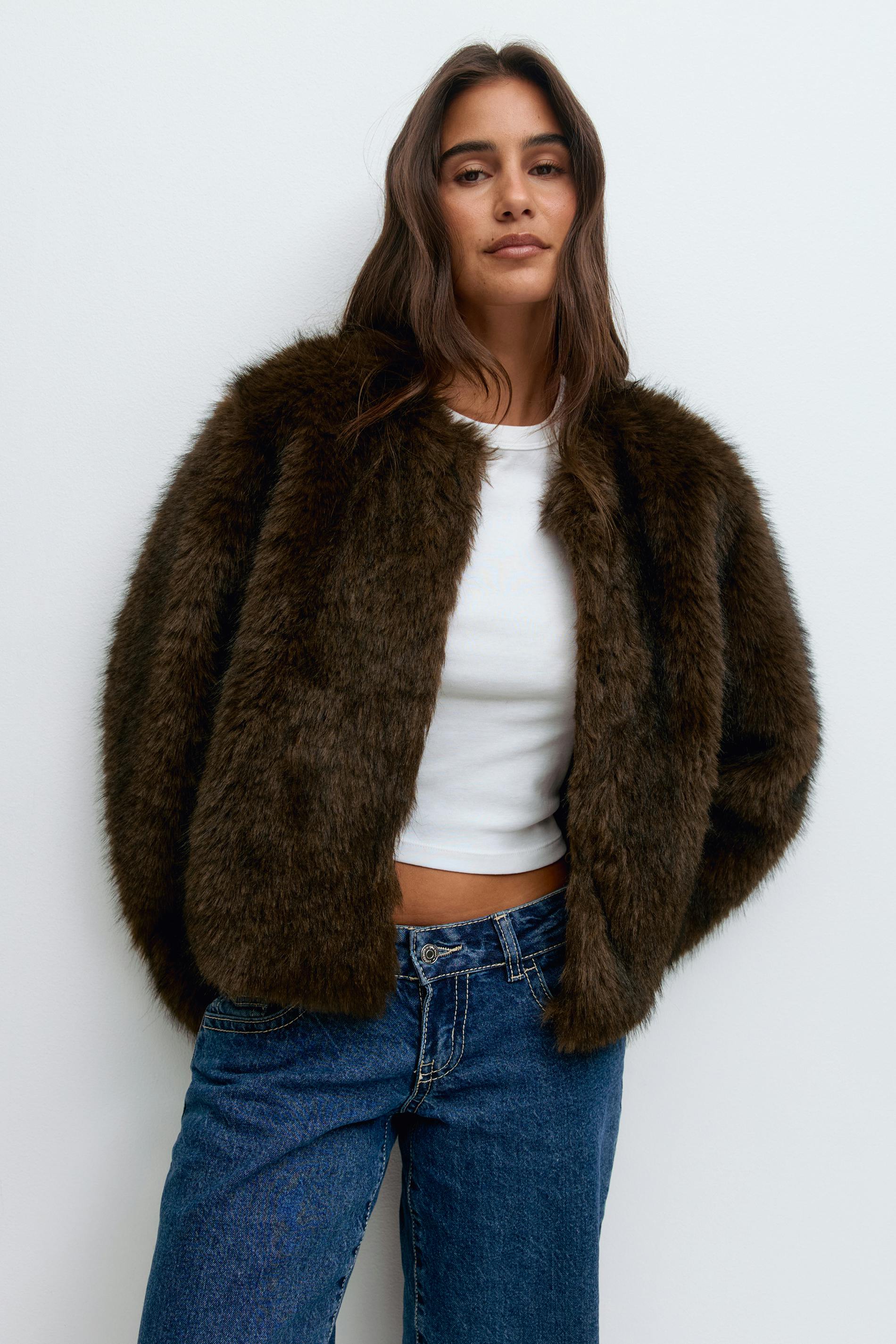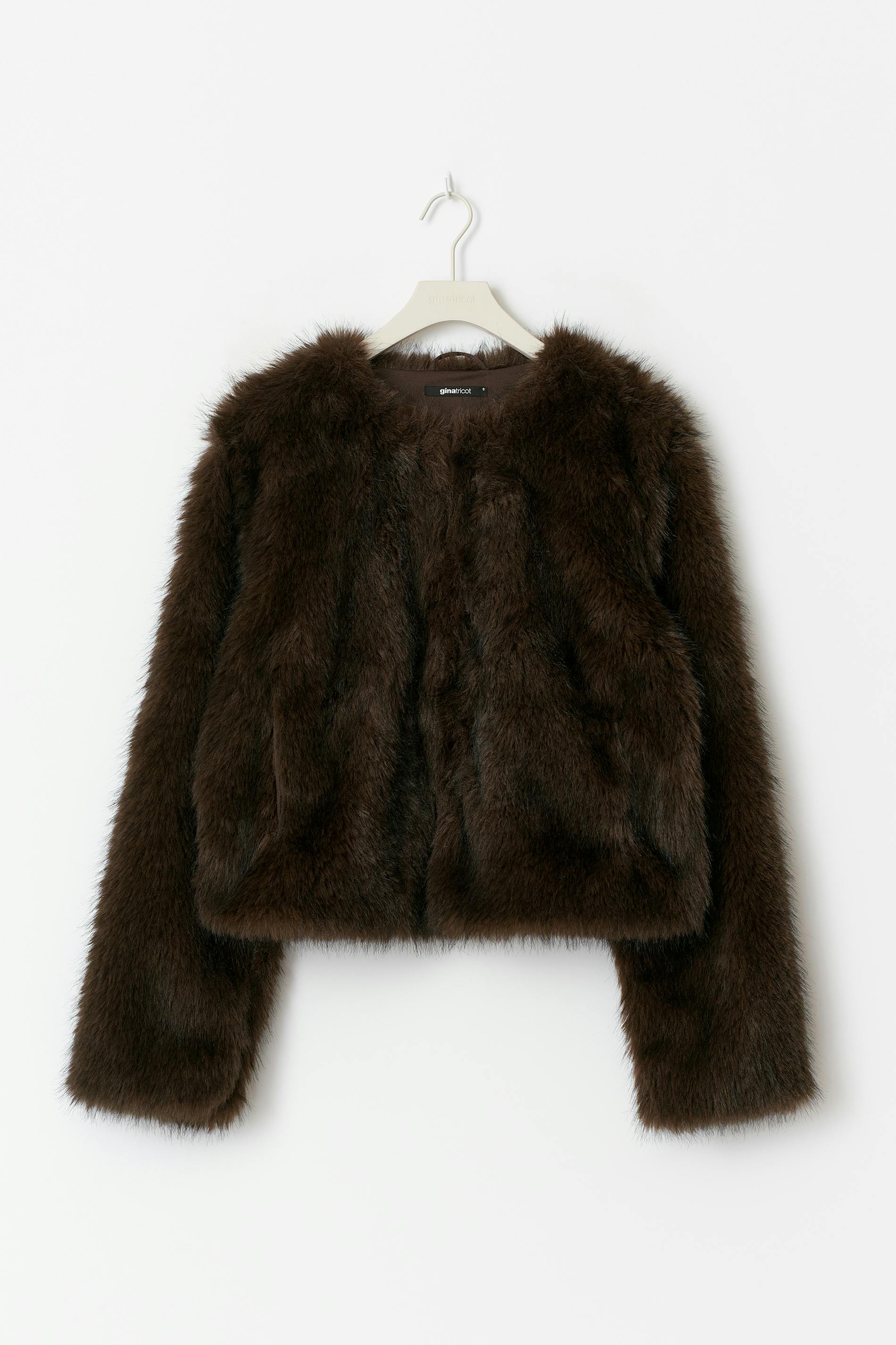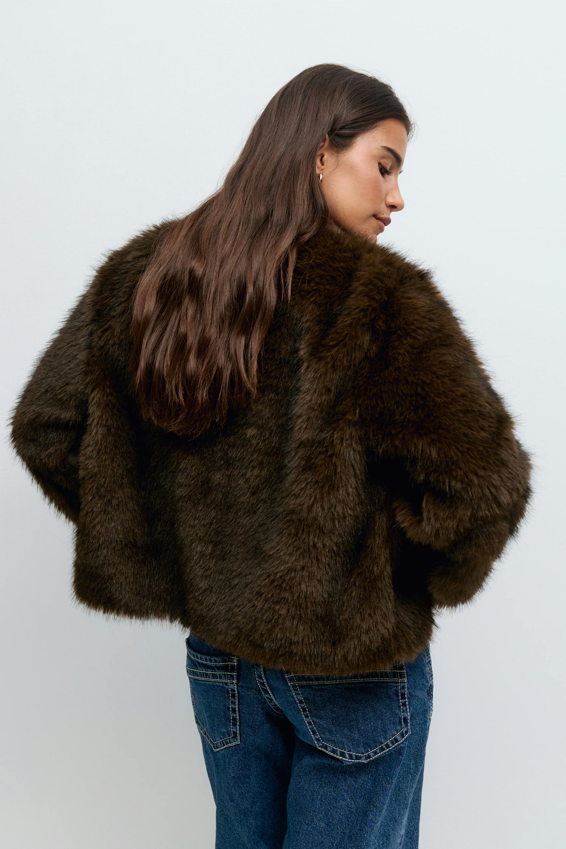 Kort pälsjacka i fuskpäls med dold knäppning framtill. Jackan är brun och har fickor i sidorna. Den har rund halsringning, rak passform och långa ärmar. Fodrad.