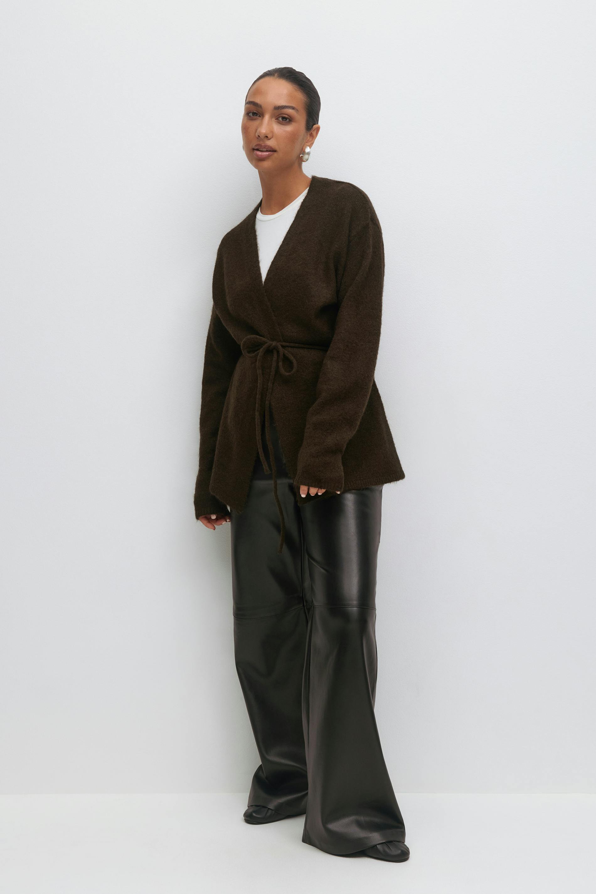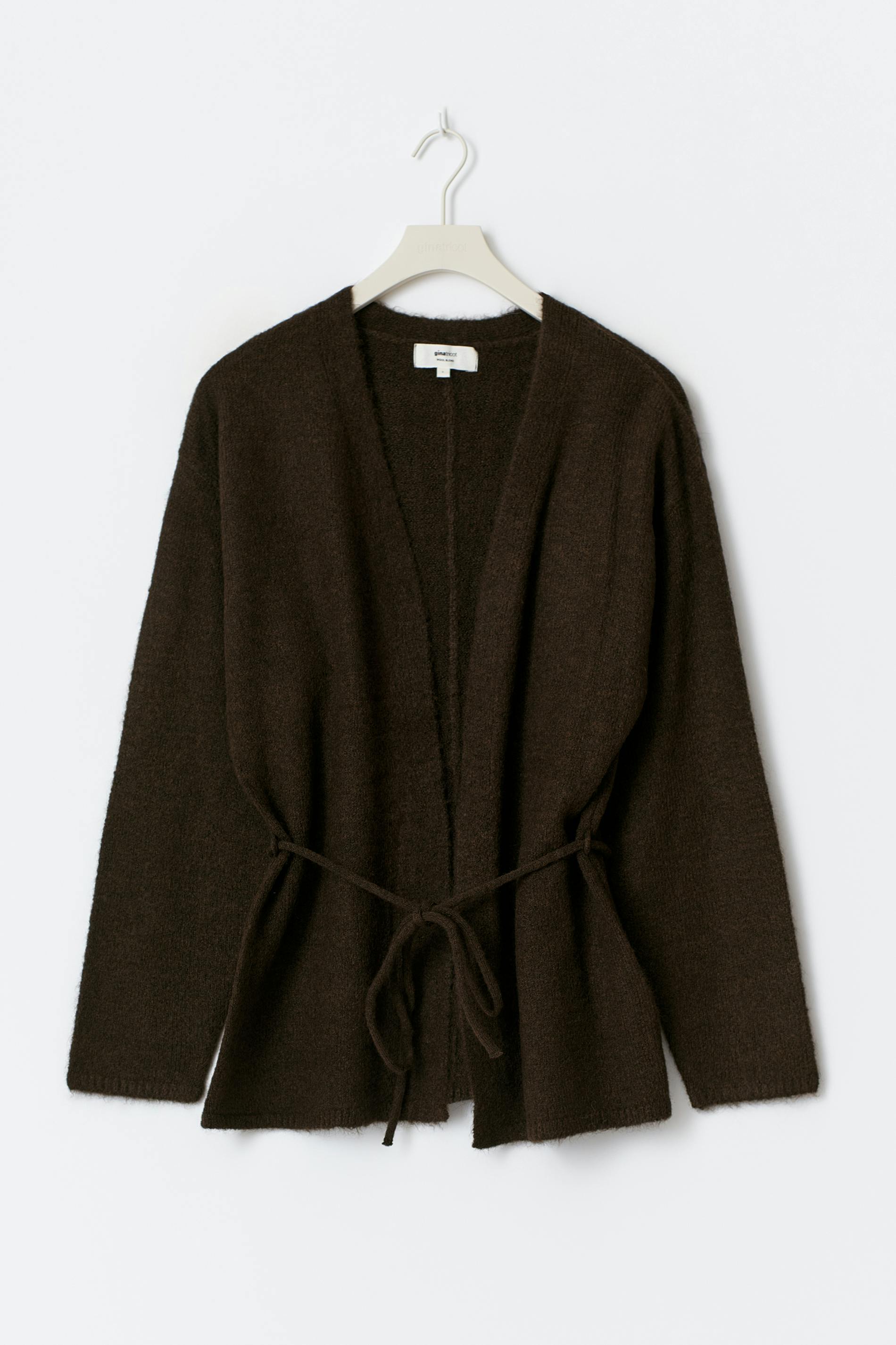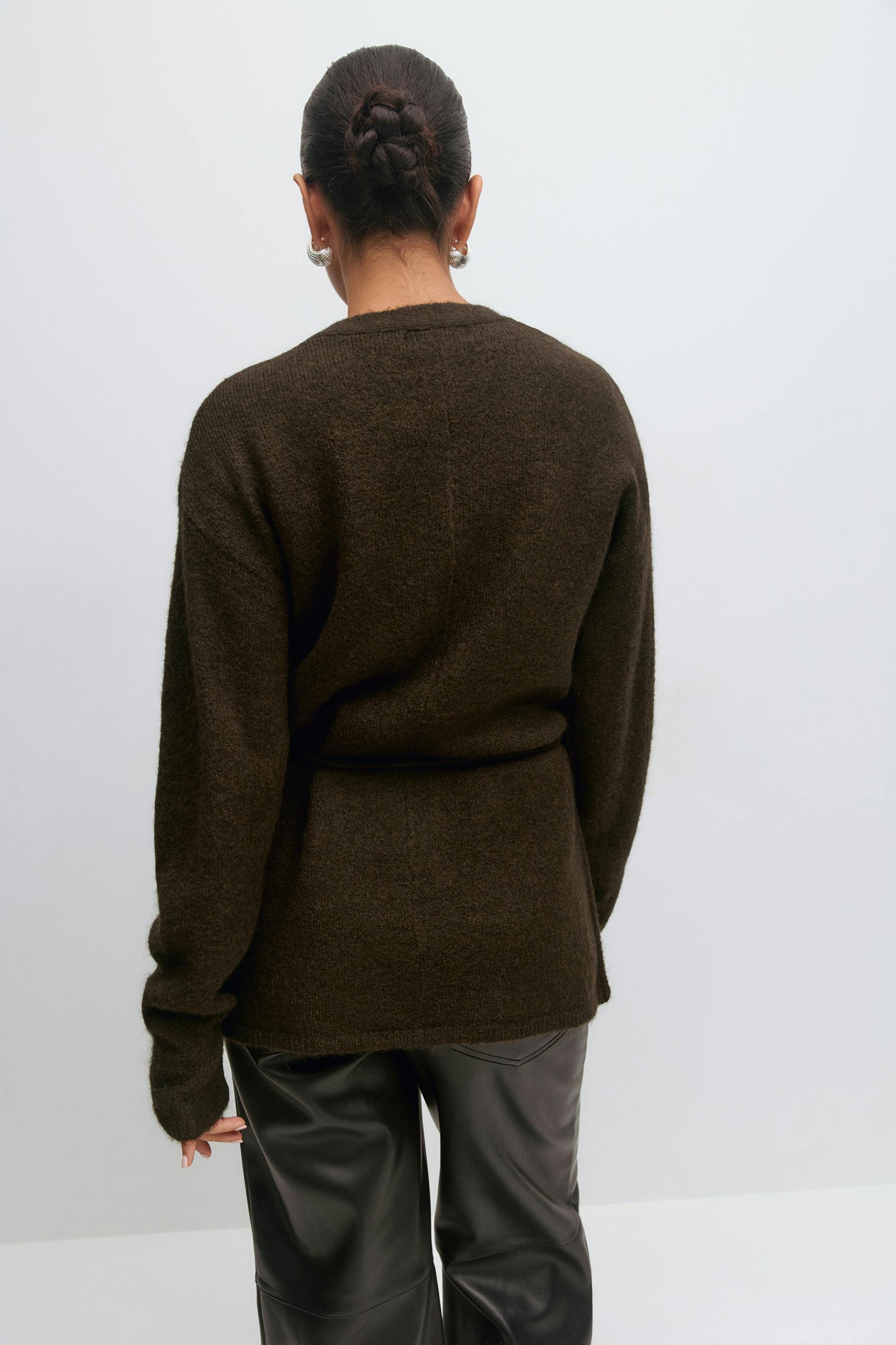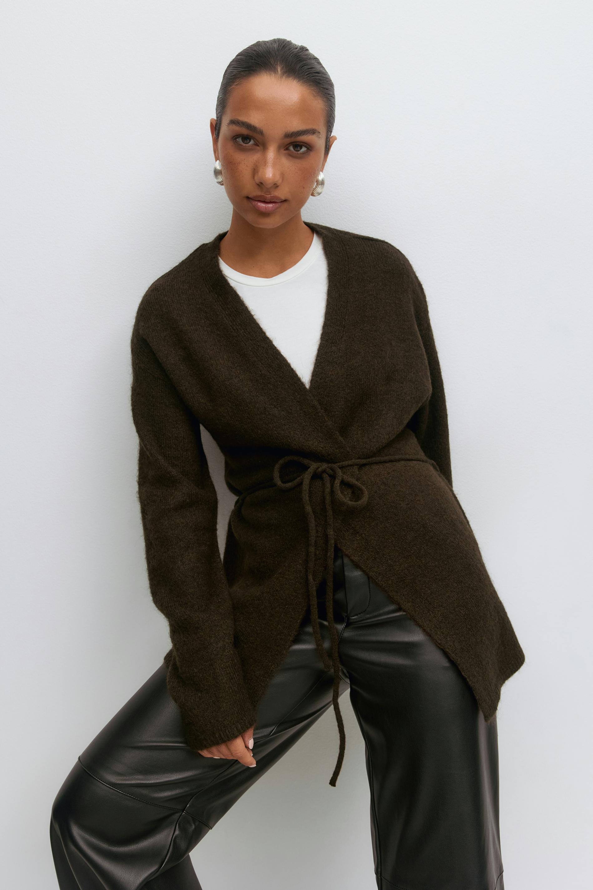 Stickad omlottkofta med knytning i midjan. Koftan är brun och har v-ringning. Den har lös passform och lång ärm.