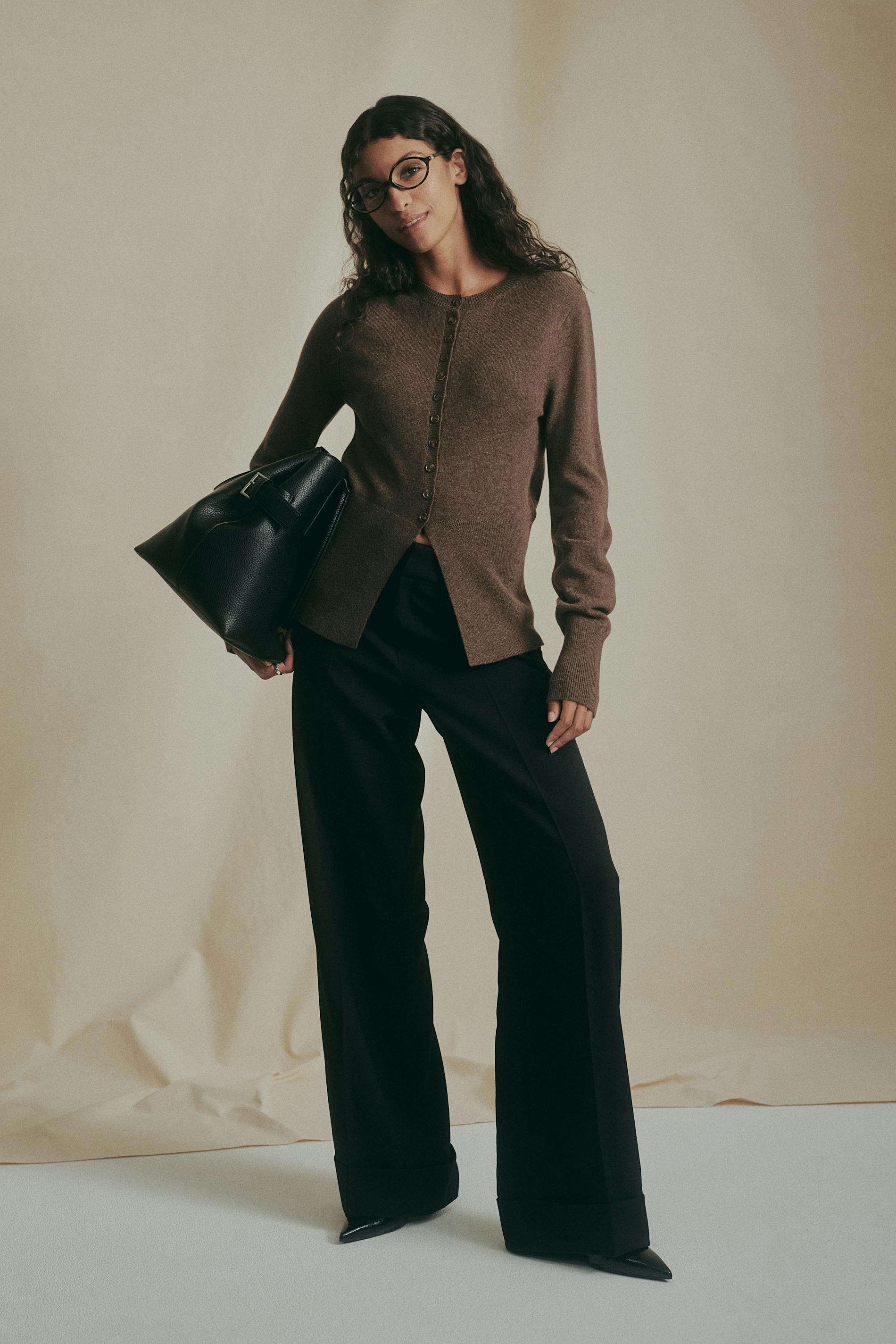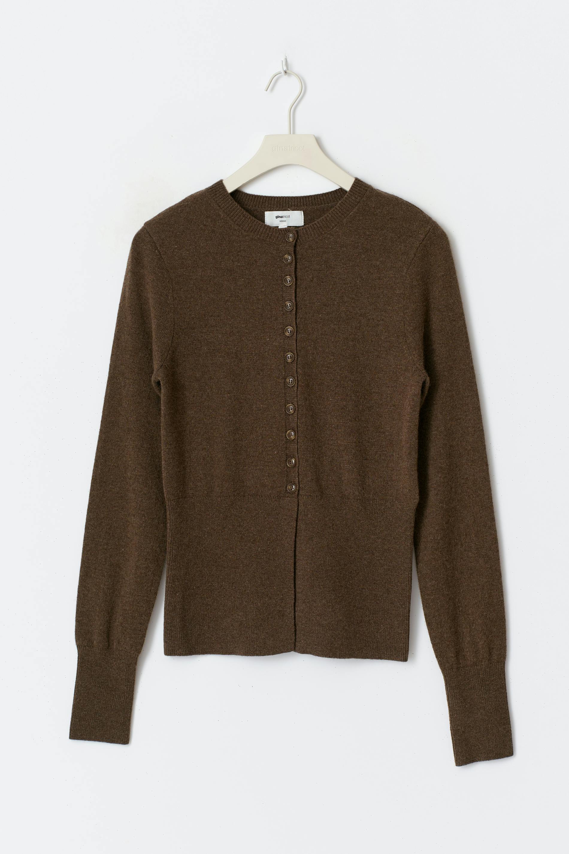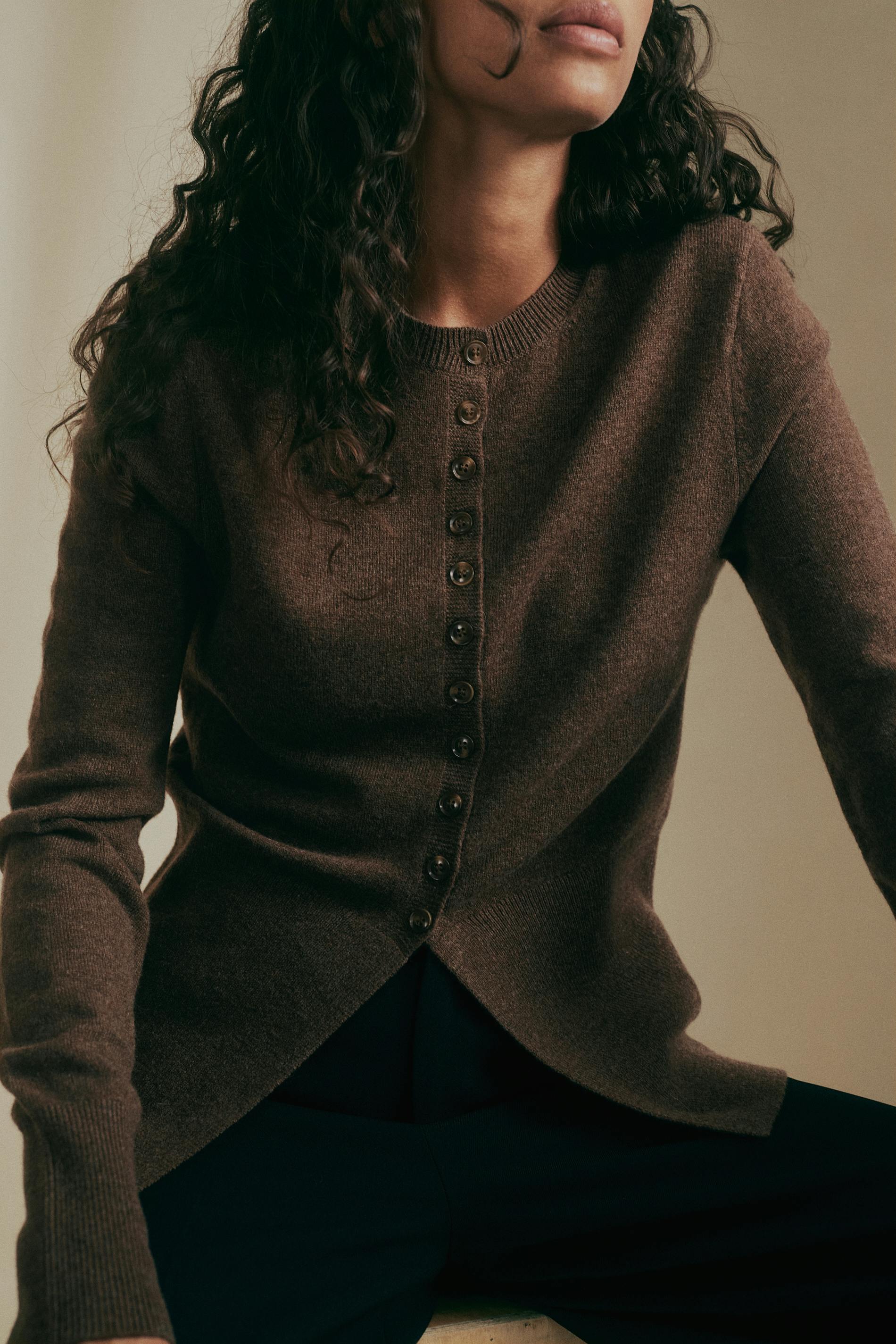 Figursydd kofta i merinoull med knappar framtill. Koftan är brun och har rund halsringning. Den har normal passform, långa ärmar och ribbad mudd vid ärmslut och i nederkant.