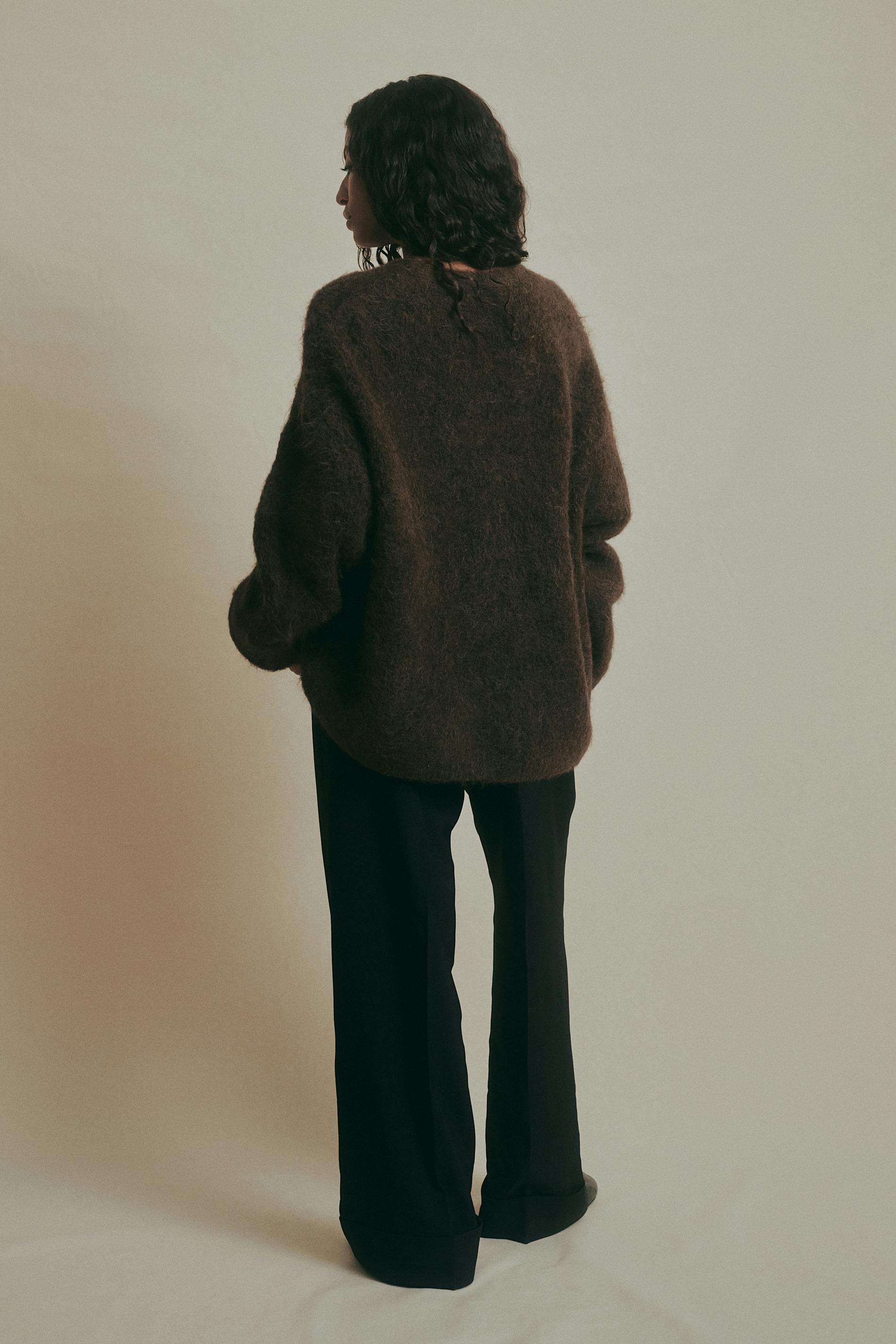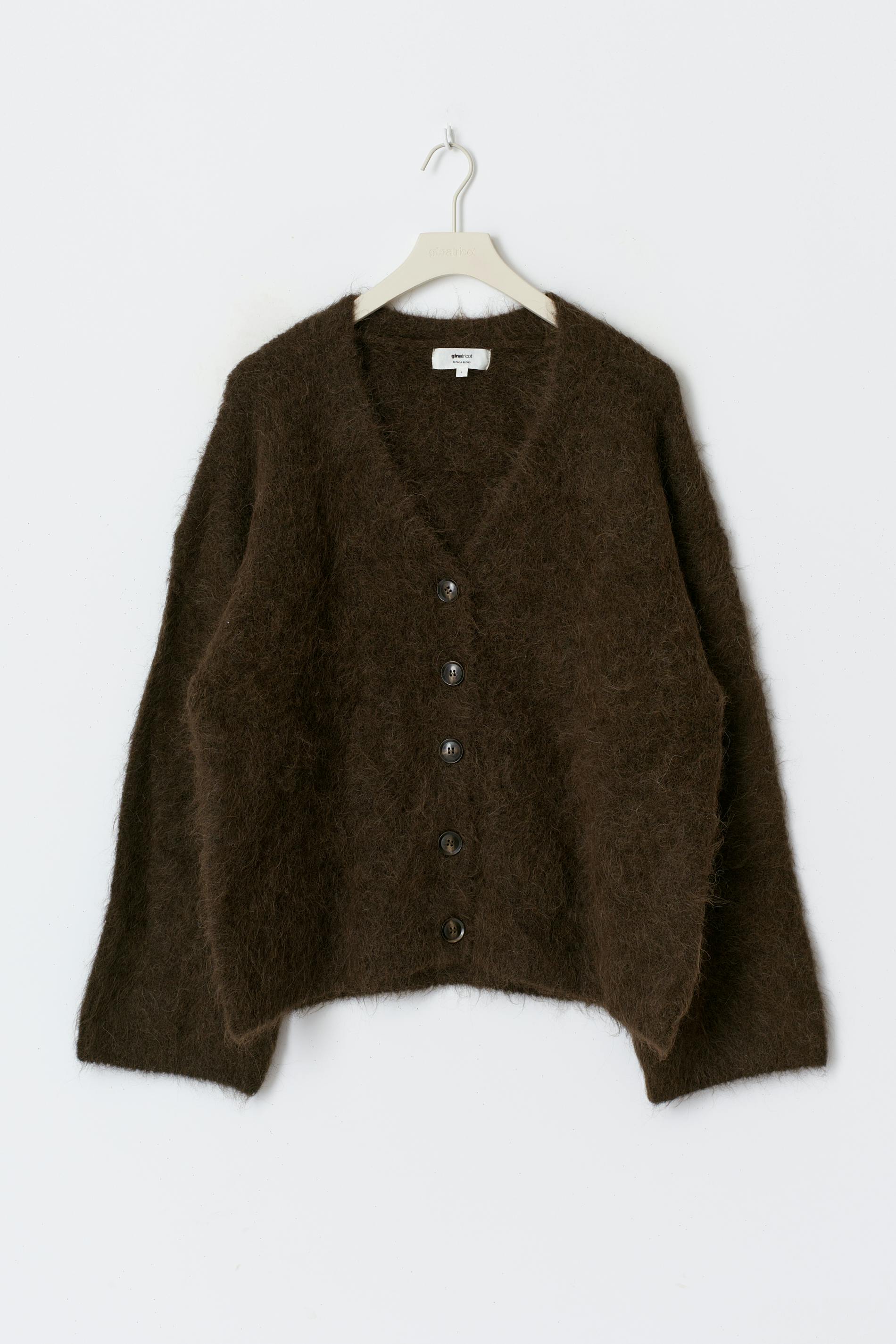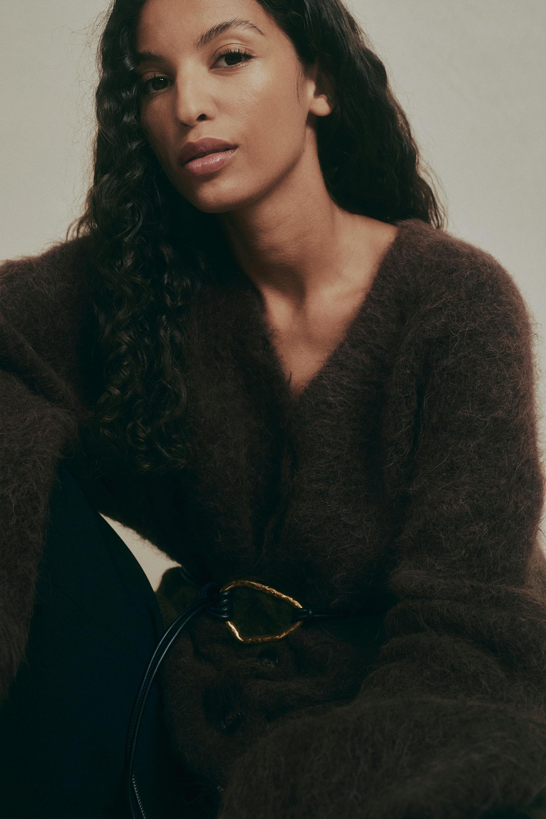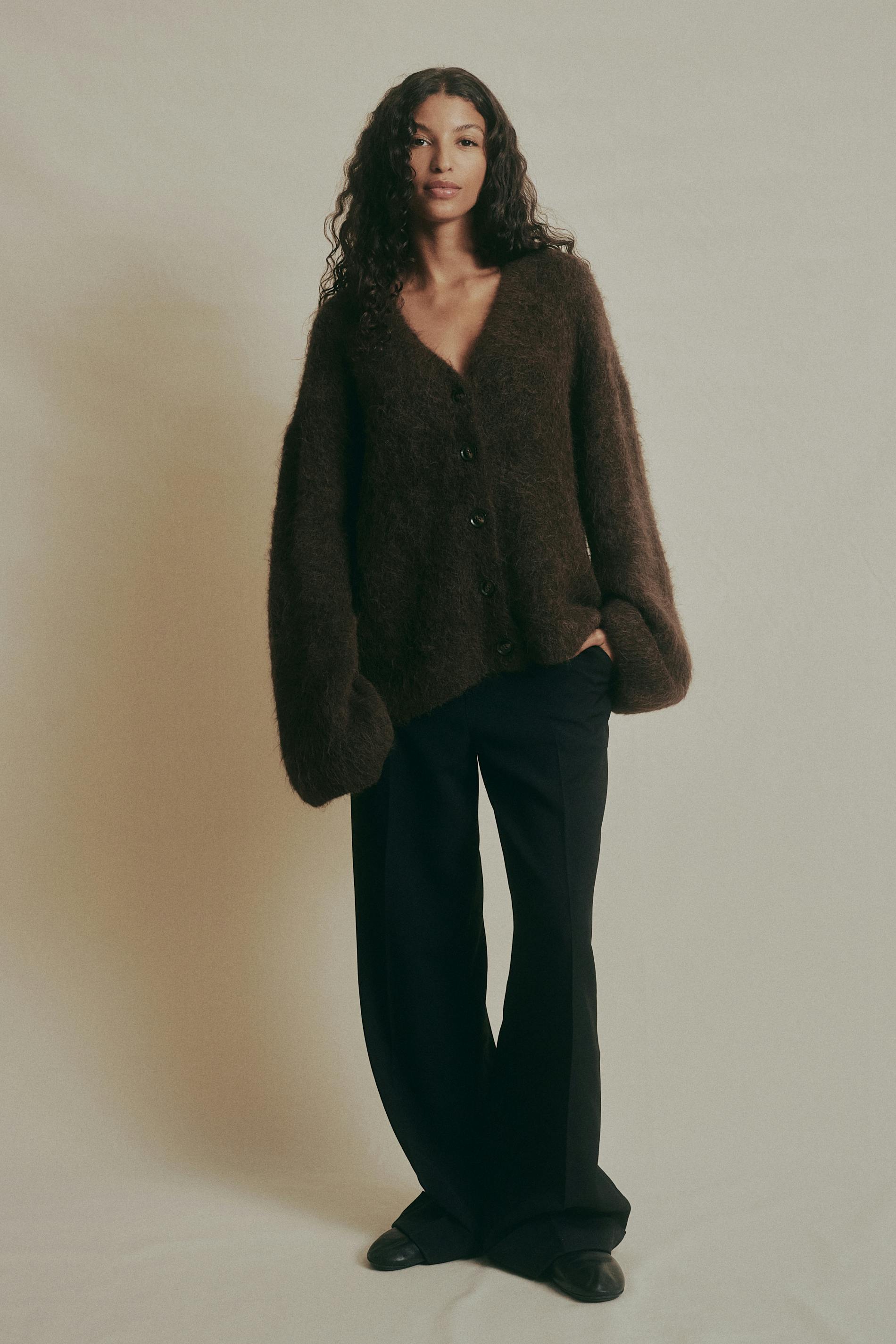Fluffig kofta med oversize fit. Koftan är brun och har knappar framtill. Den har v-ringning, långa ärmar och ribbstickning vid ärmslut och i nederkant.