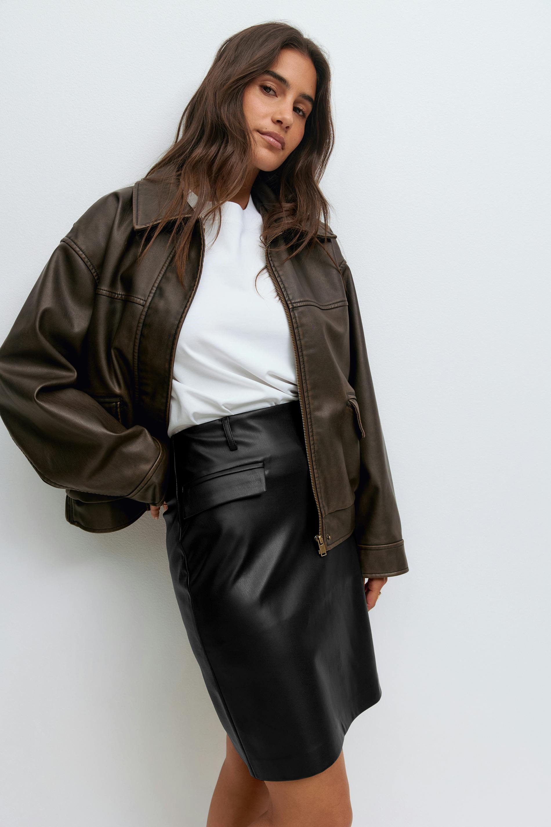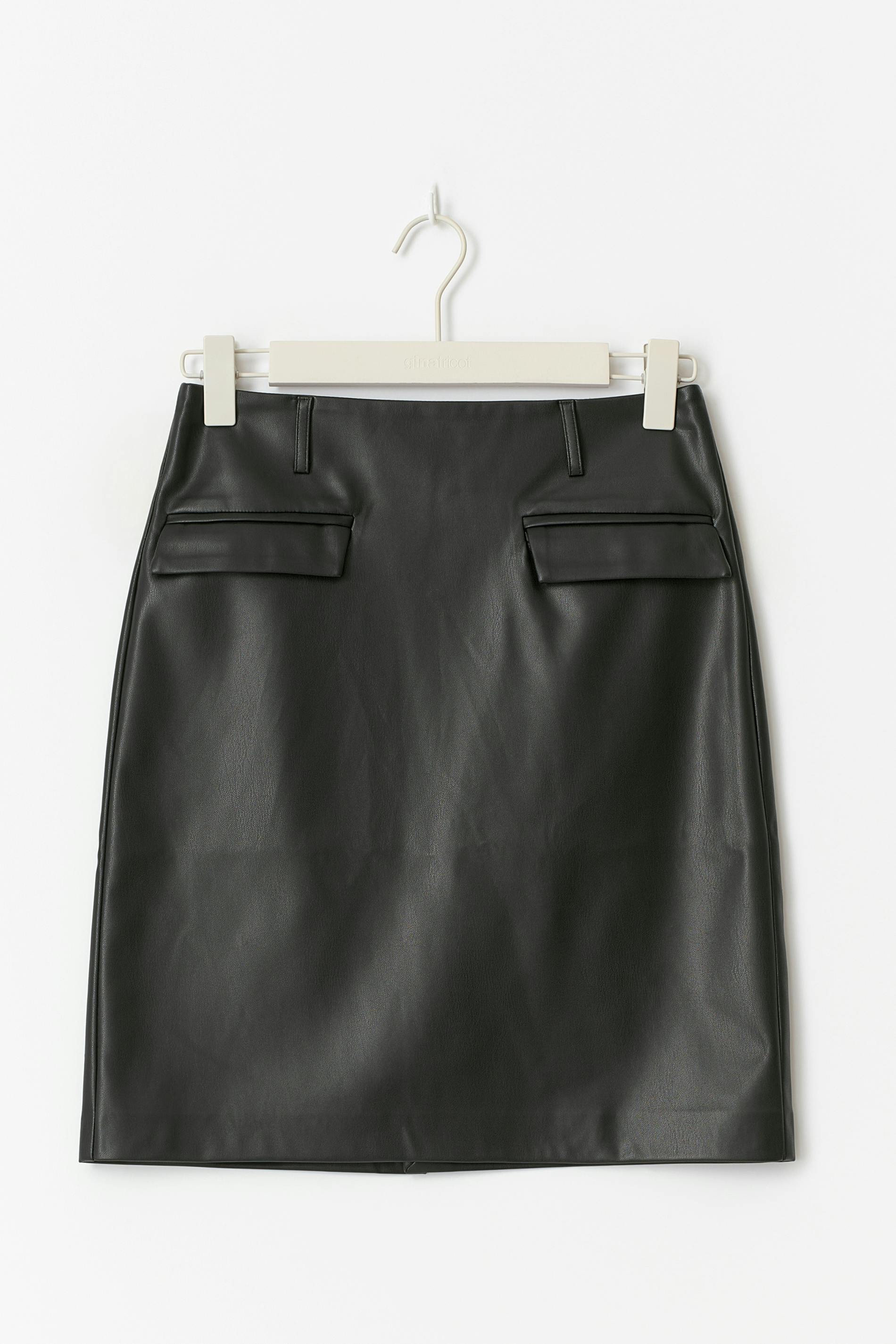 Minikjol i läderimitation med fejkade fickor med lock fram. Kjolen är svart och har en slits baktill. Den har en dragkedja bak i midjan, en medelhög midja och en normal passform.