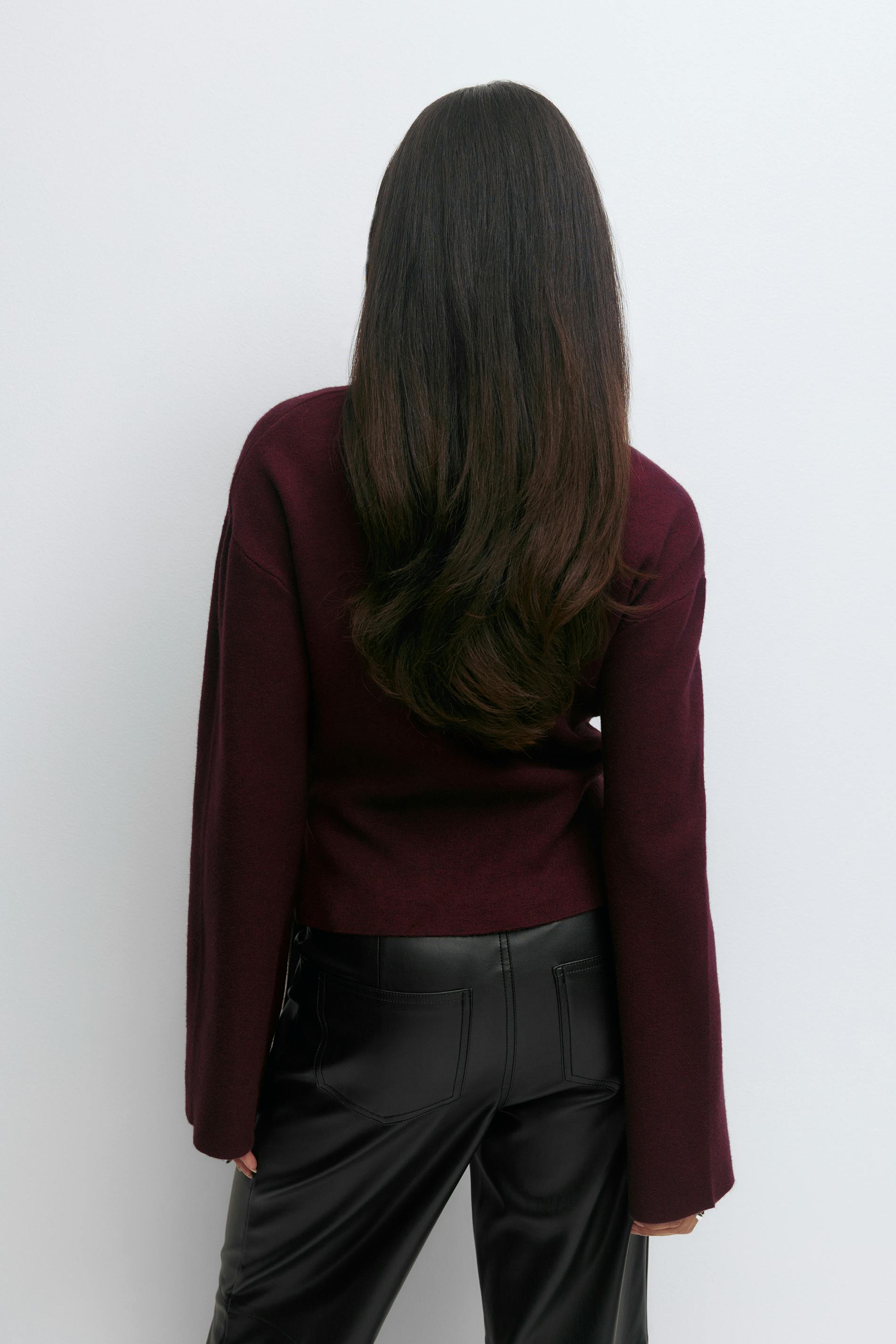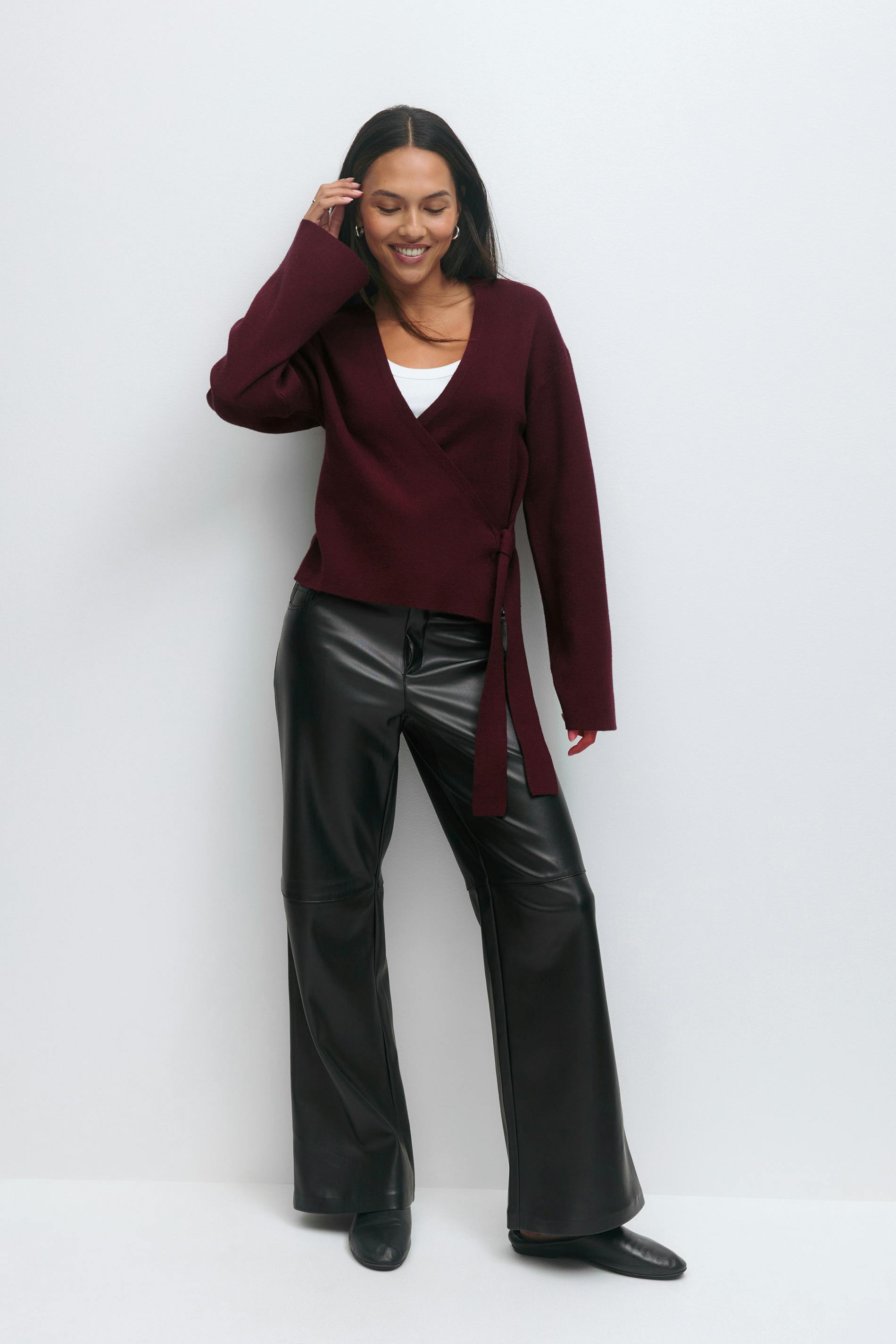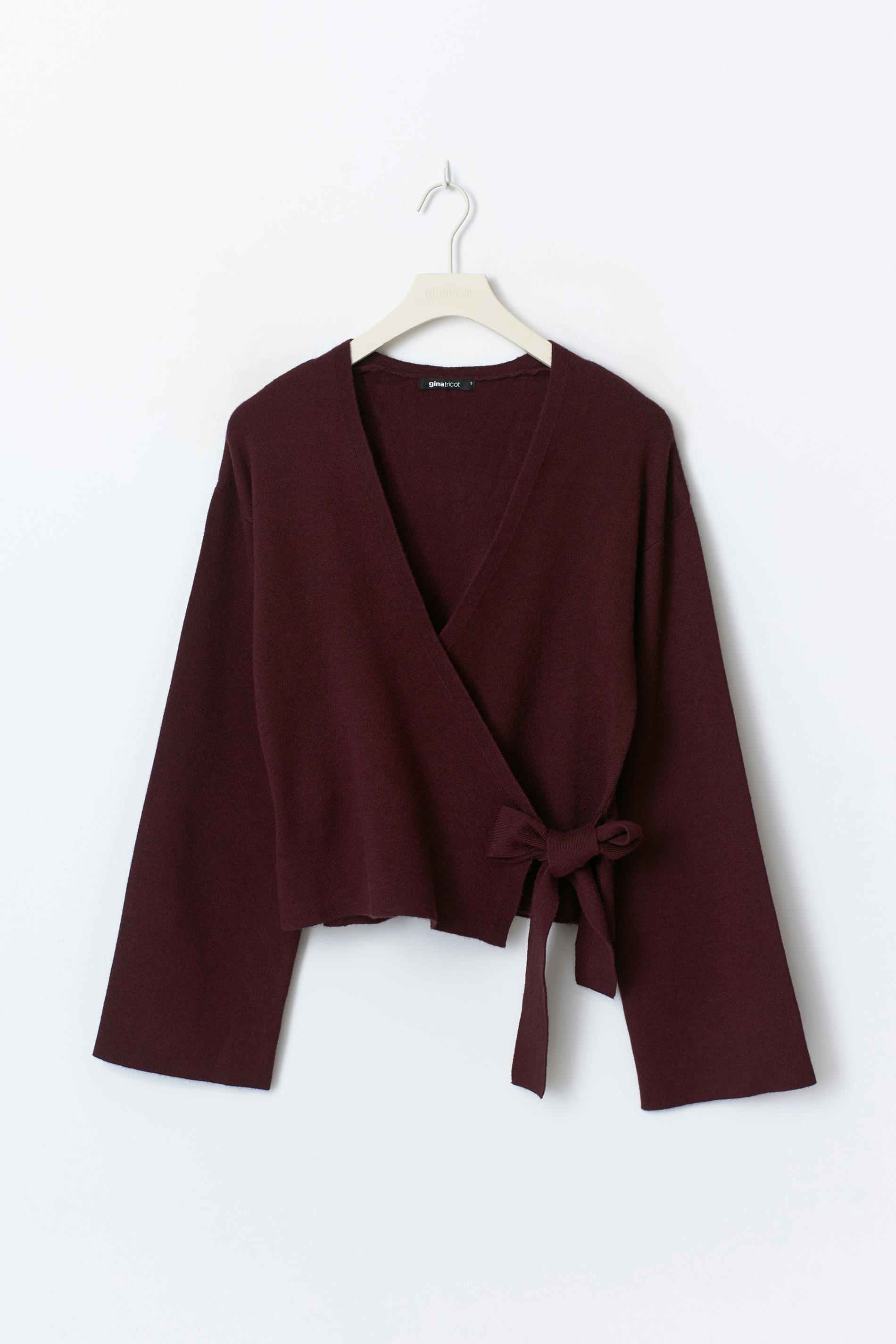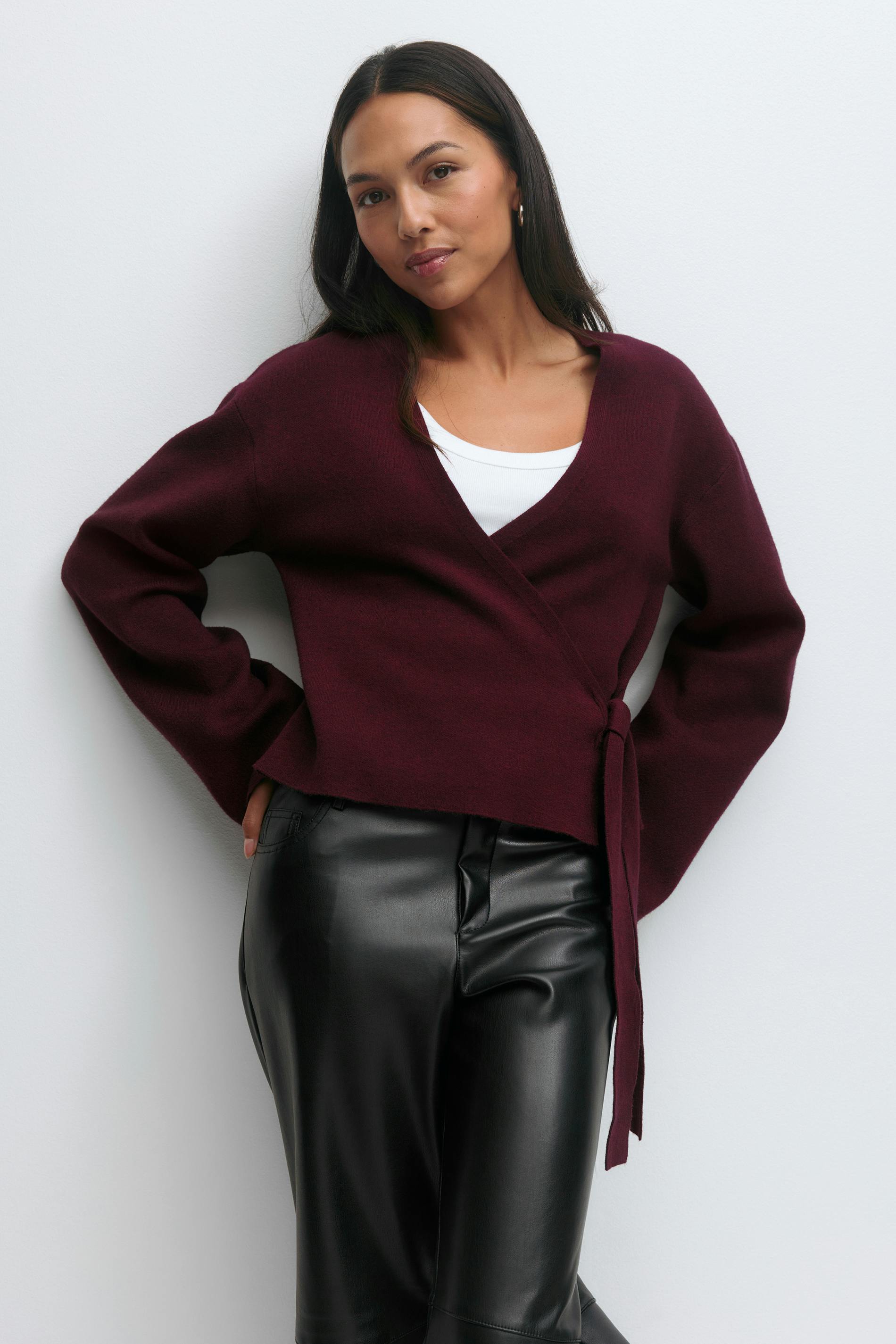 Omlottkofta med v-ringning. Koftan är mörkröd och har en knytning i midjan. Den har en lång ärm och en normal passform.