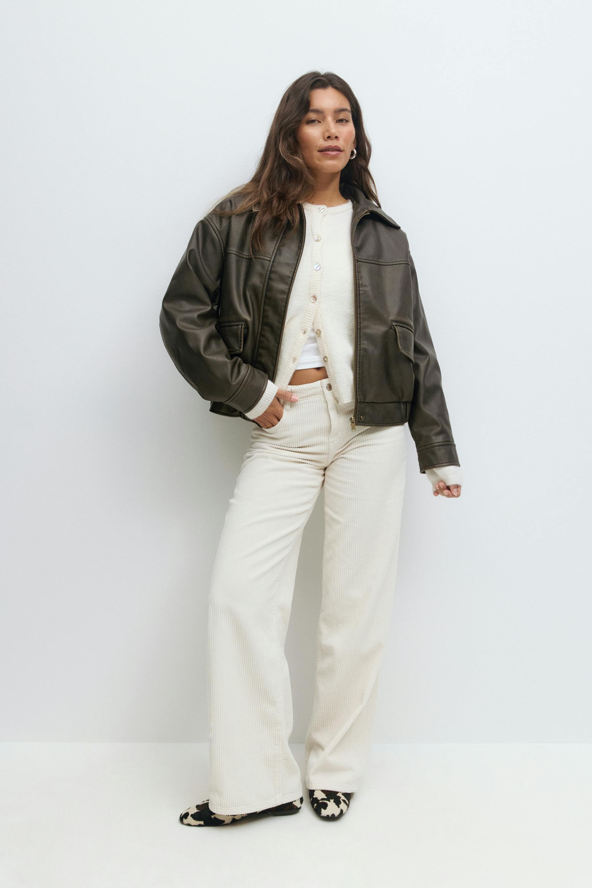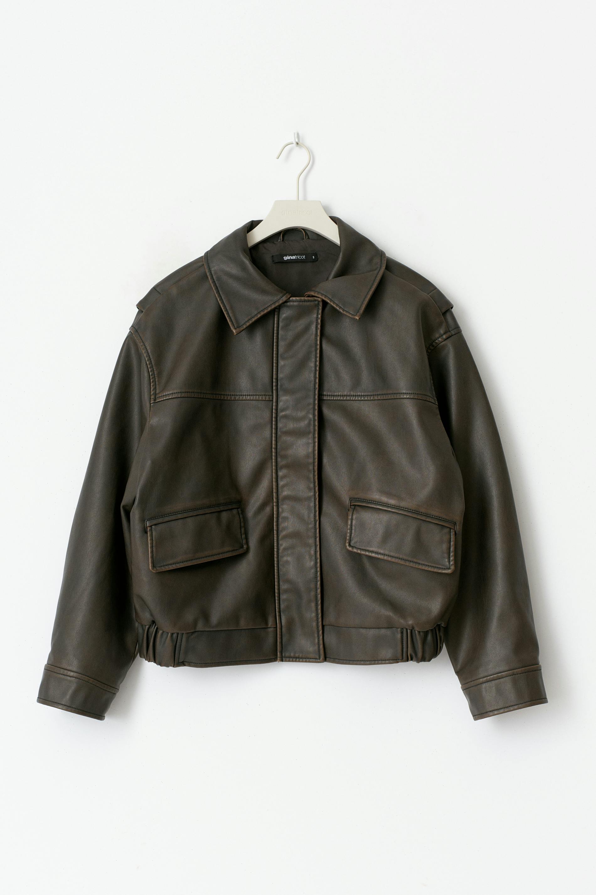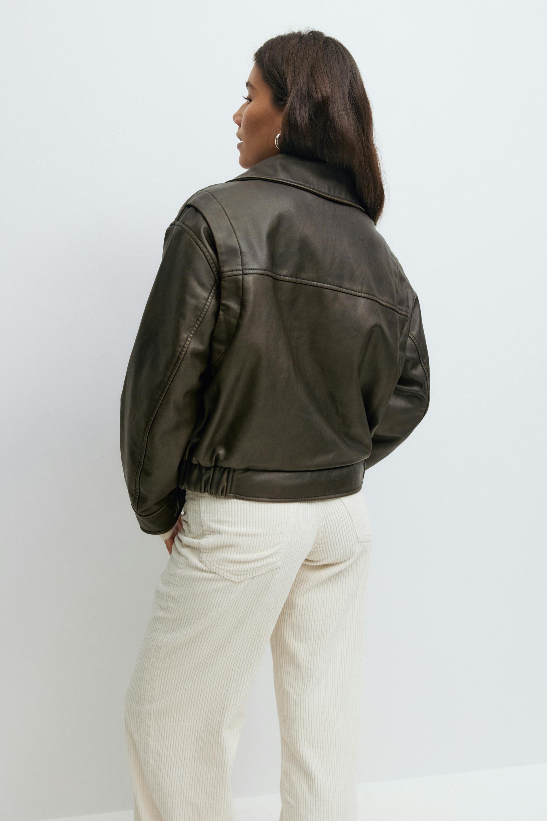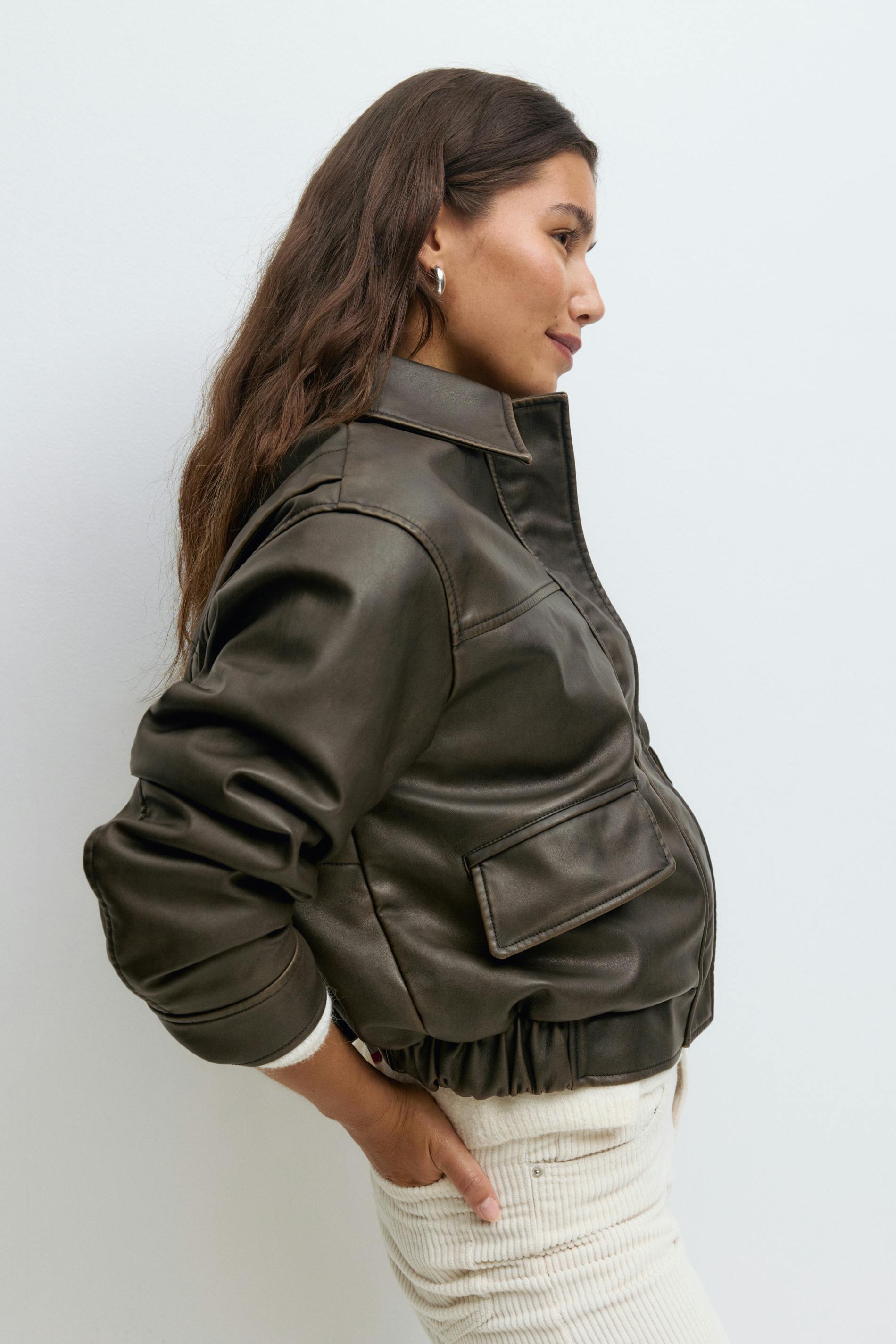 Skinnjacka i läderimitation med oversize fit. Jackan är mörkbrun och har fickor. Den har en dragkedja fram och en rund halsringning med en krage.