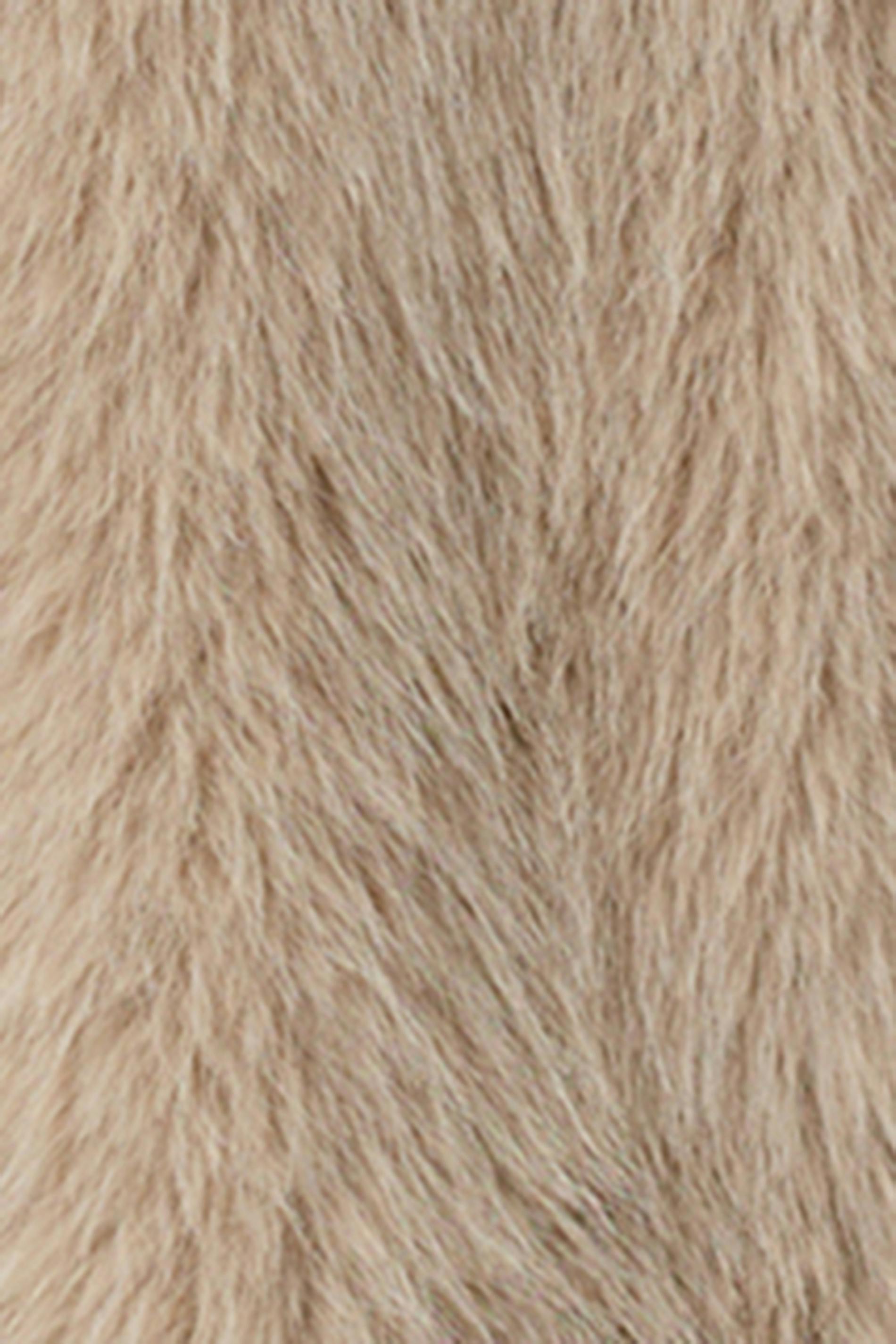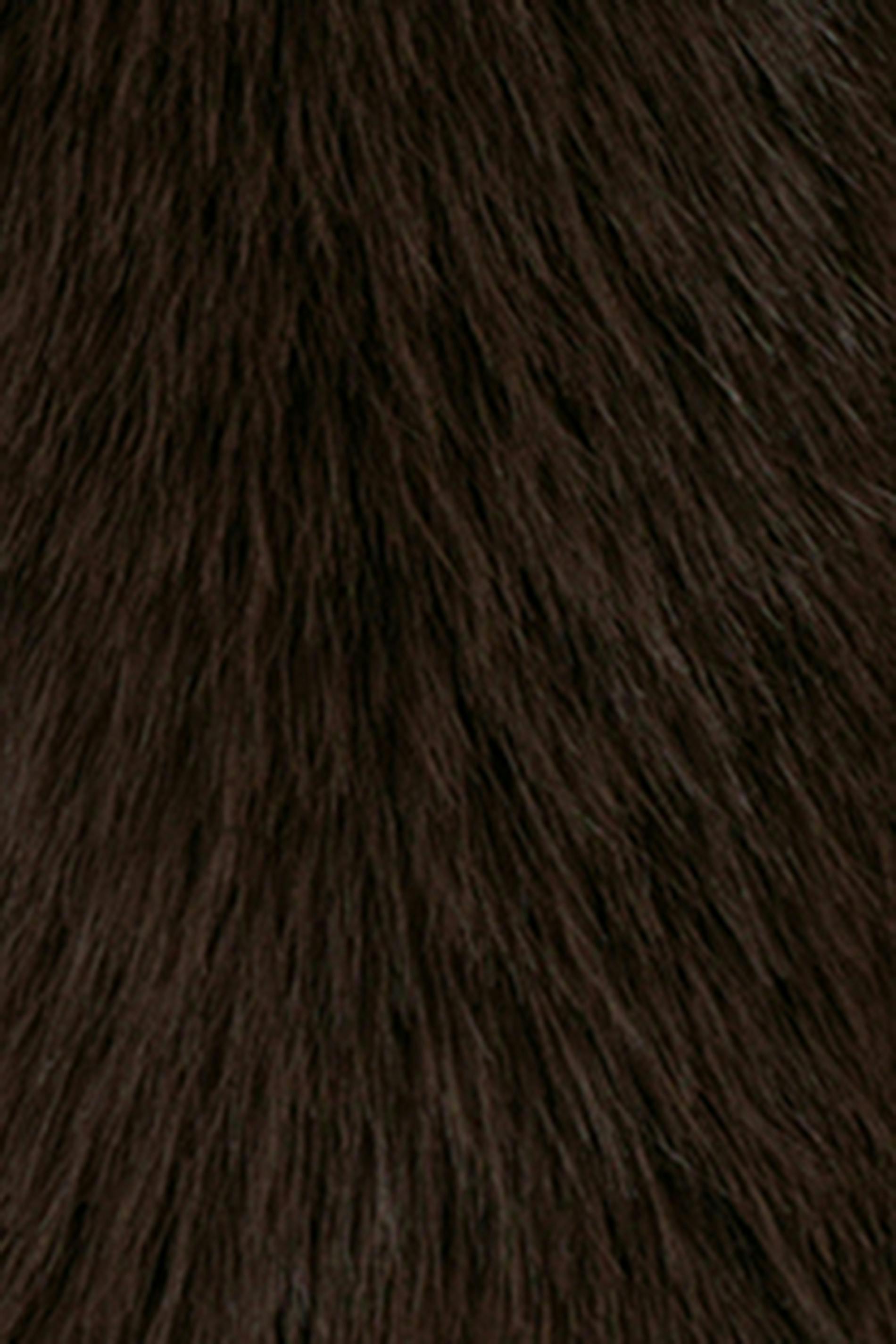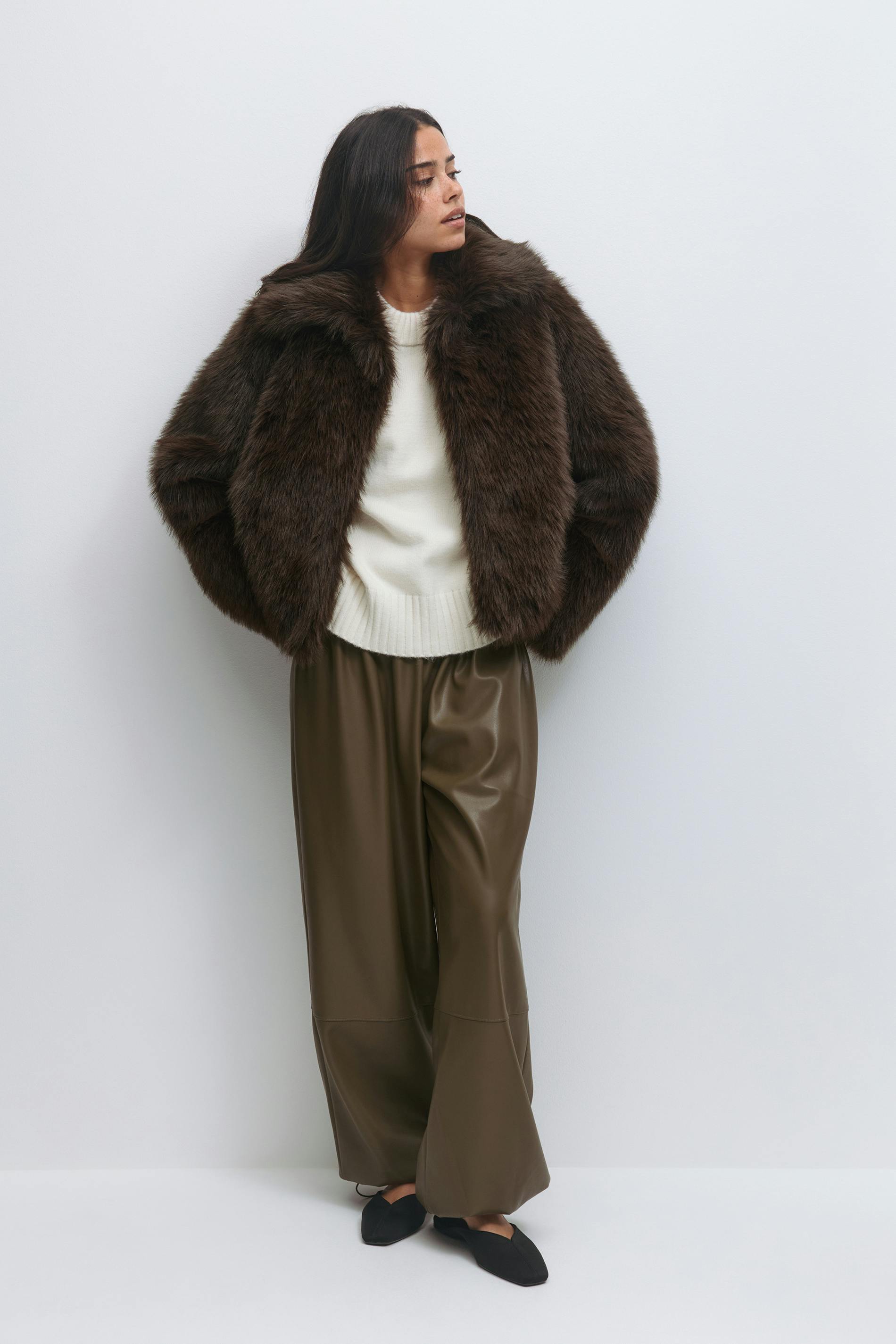 Kort pälsjacka med långa ärmar. Jackan är brun och har en stor krage. Den har fickor i sidorna och ett fluffigt material.