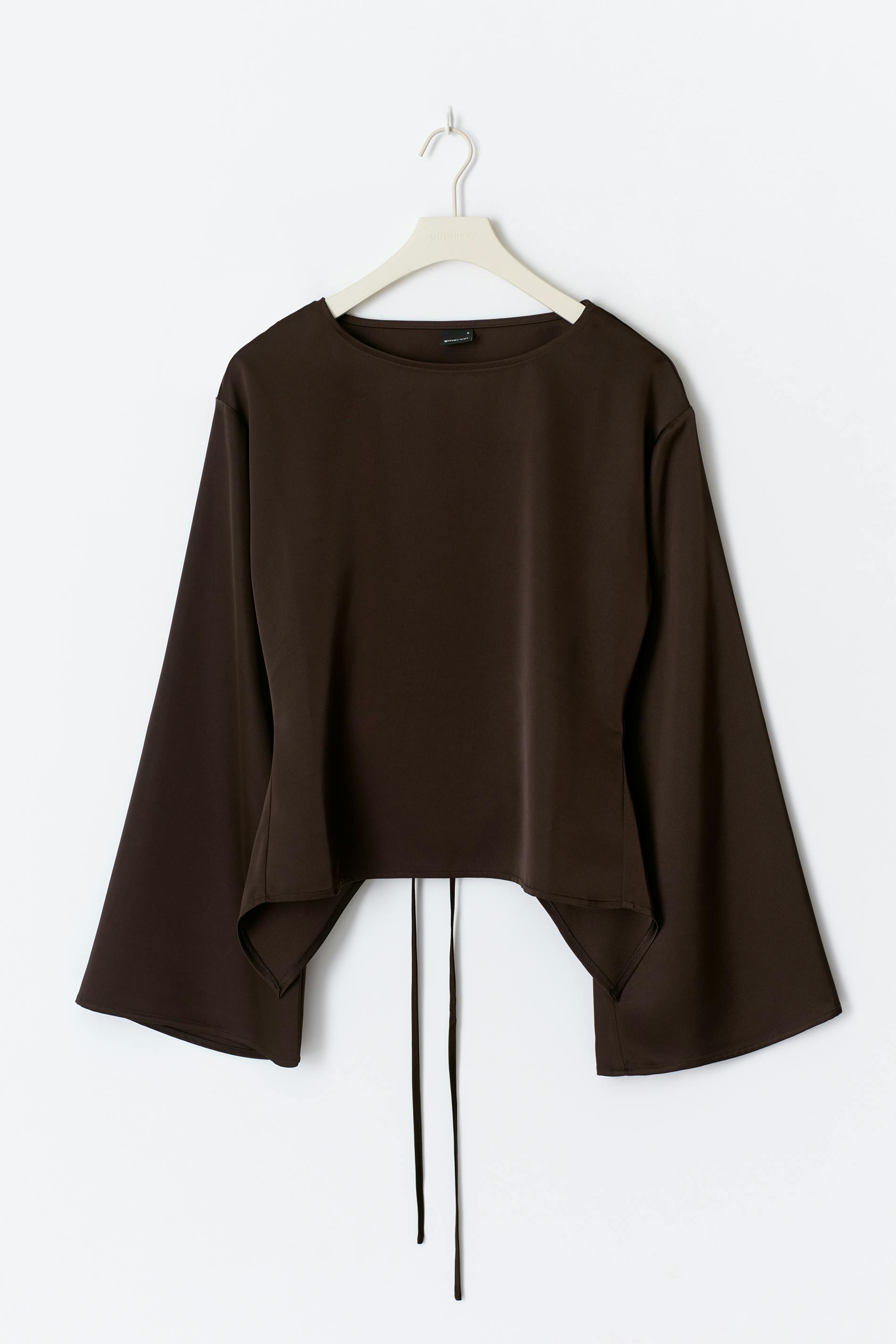 Långärmad topp i satin med knytdetalj i ryggen. Toppen är brun och har båtringning. Den har en vid ärm, öppen rygg och en normal passform.