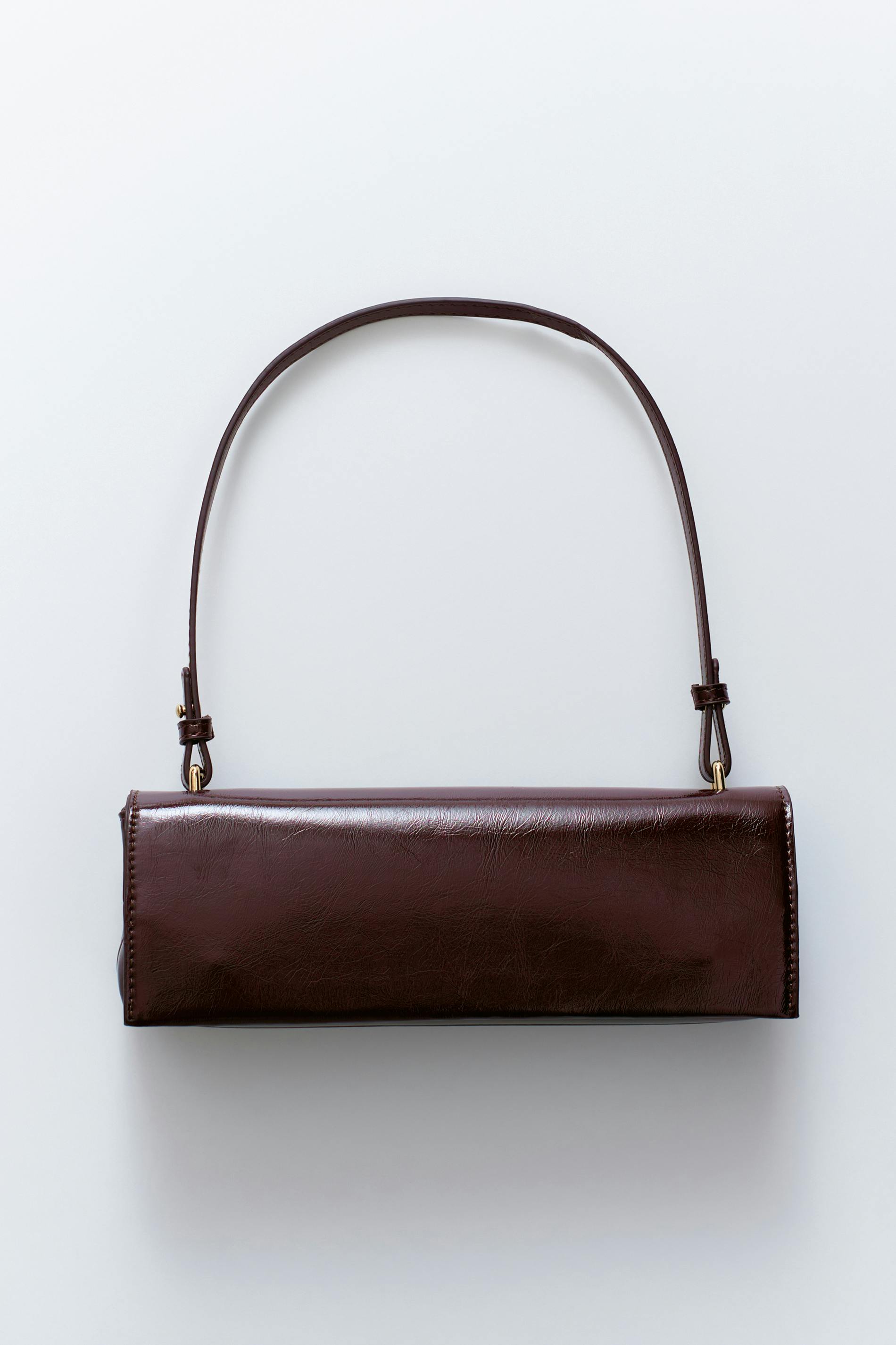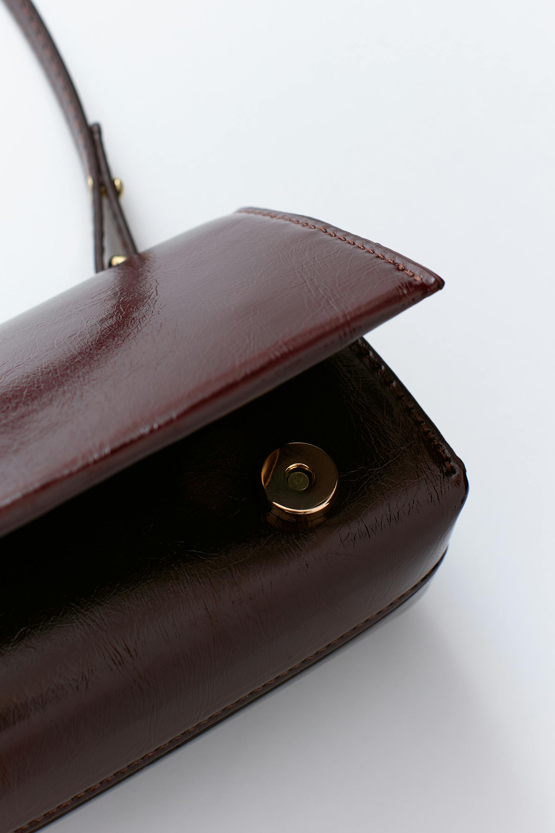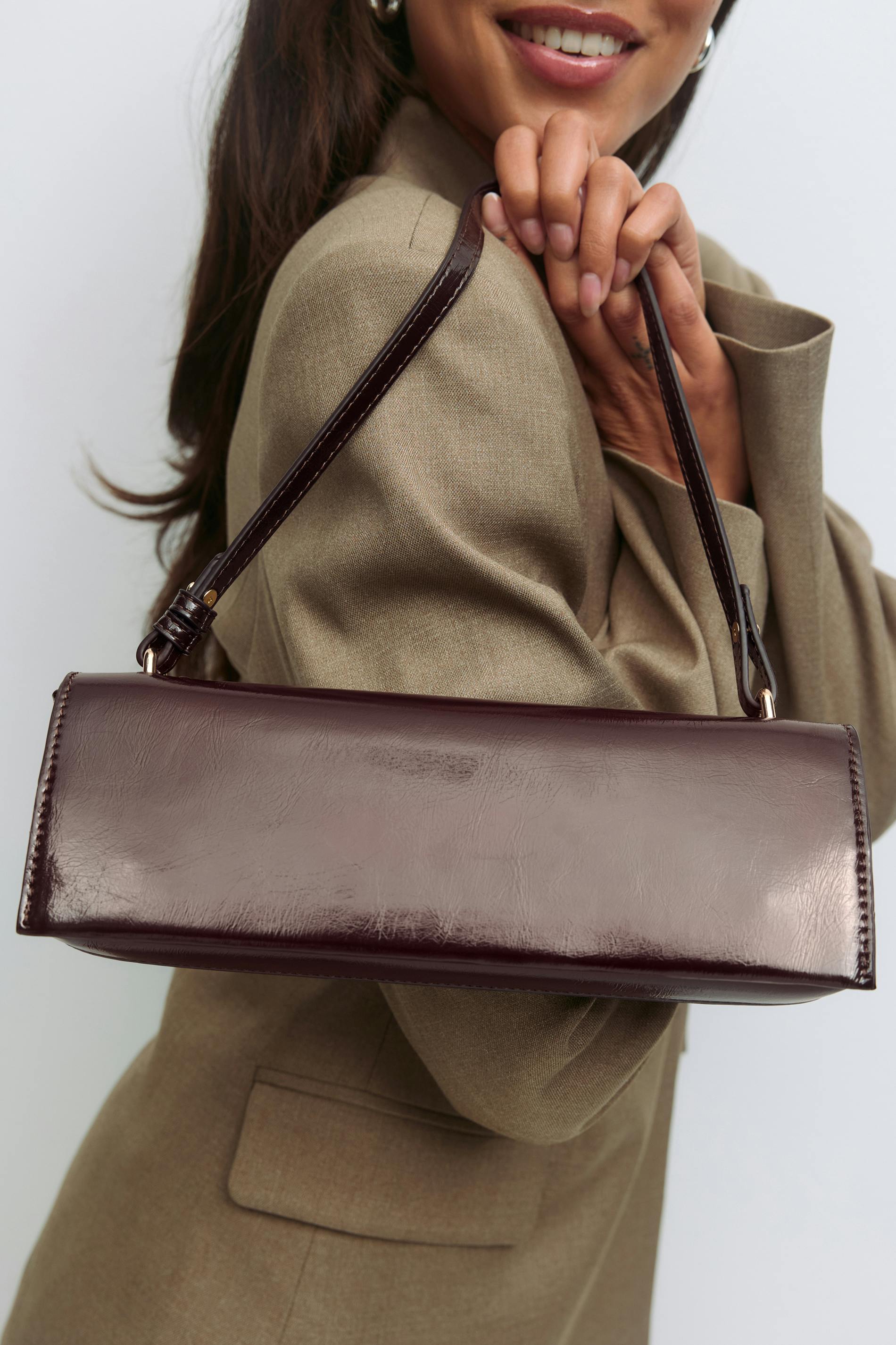 Liten axelremsväska i skinnimitation med en rektangulär design. Väskan är röd och glansig och har magnetknäppning. Den har en innerficka med dragkedjestängning.