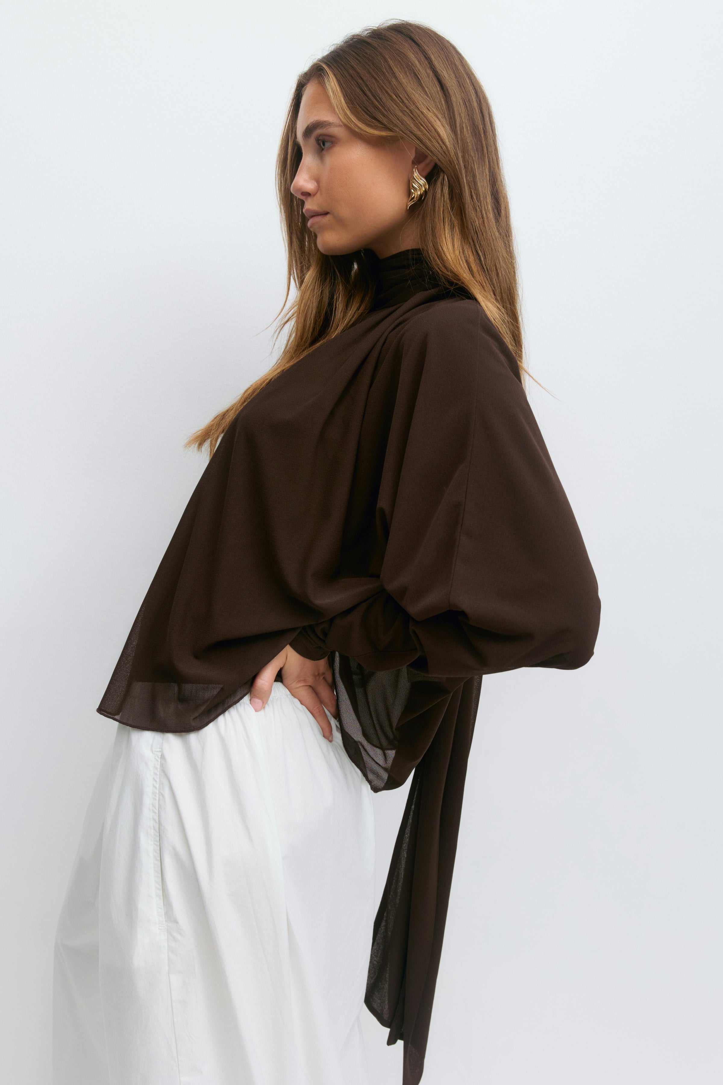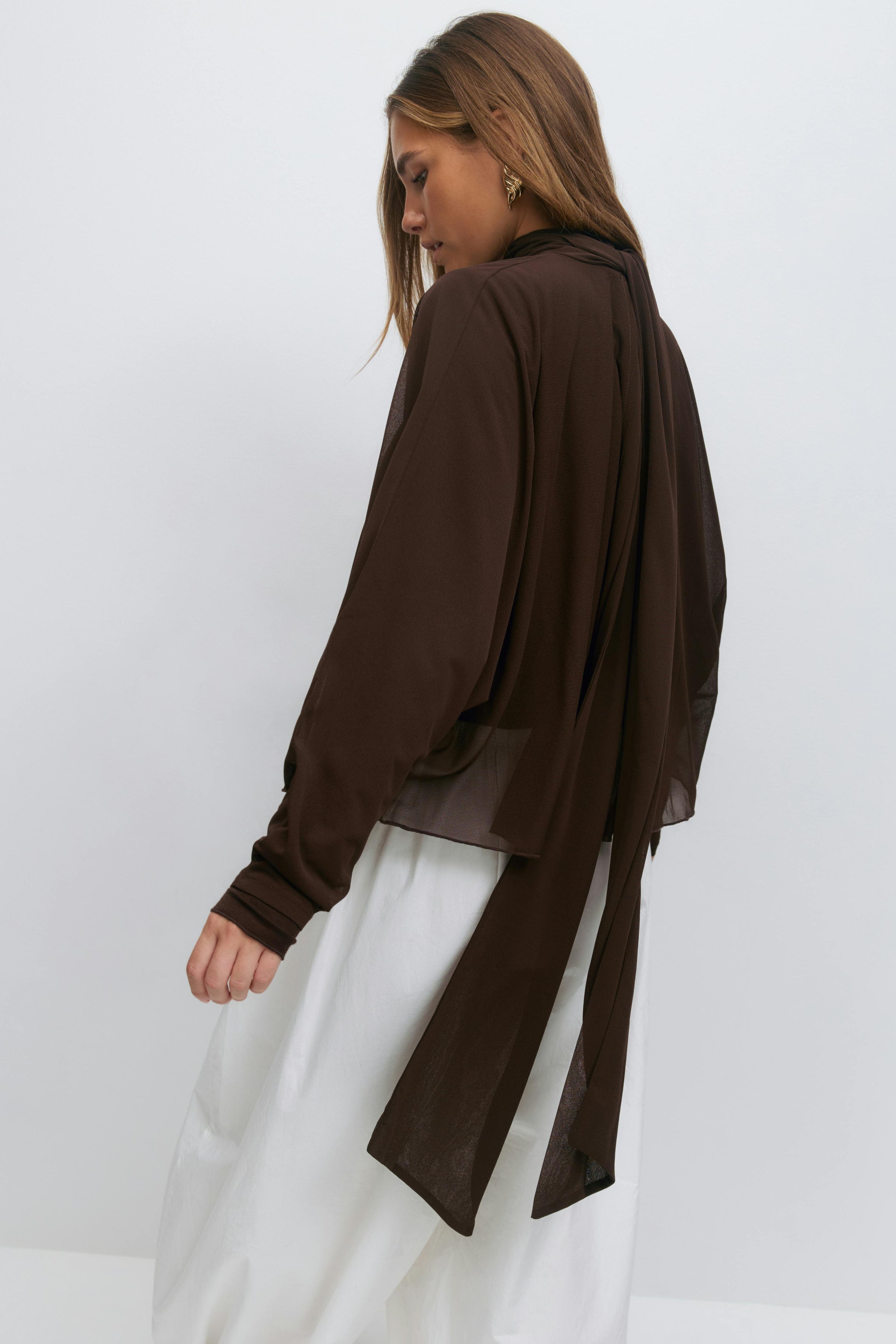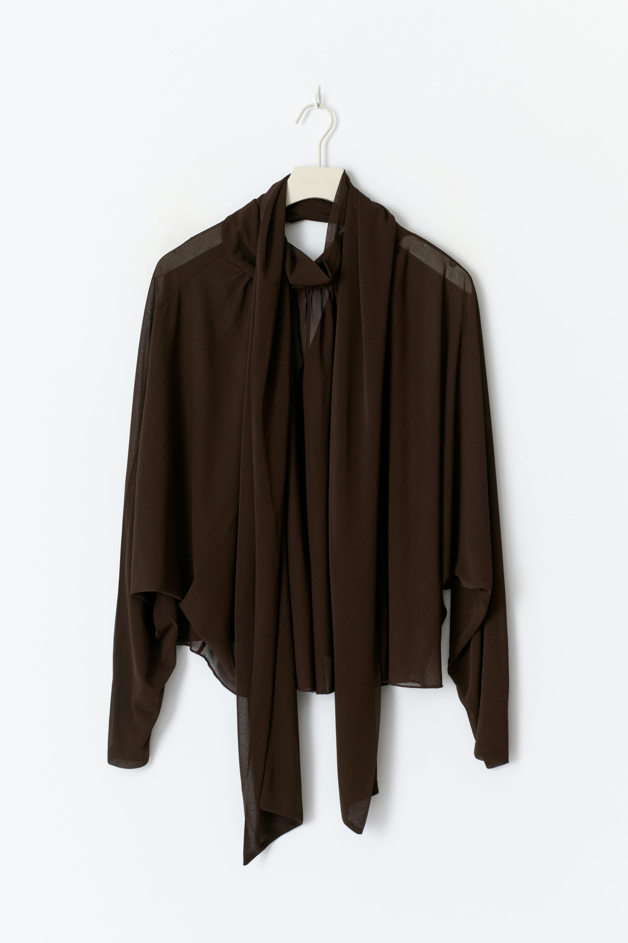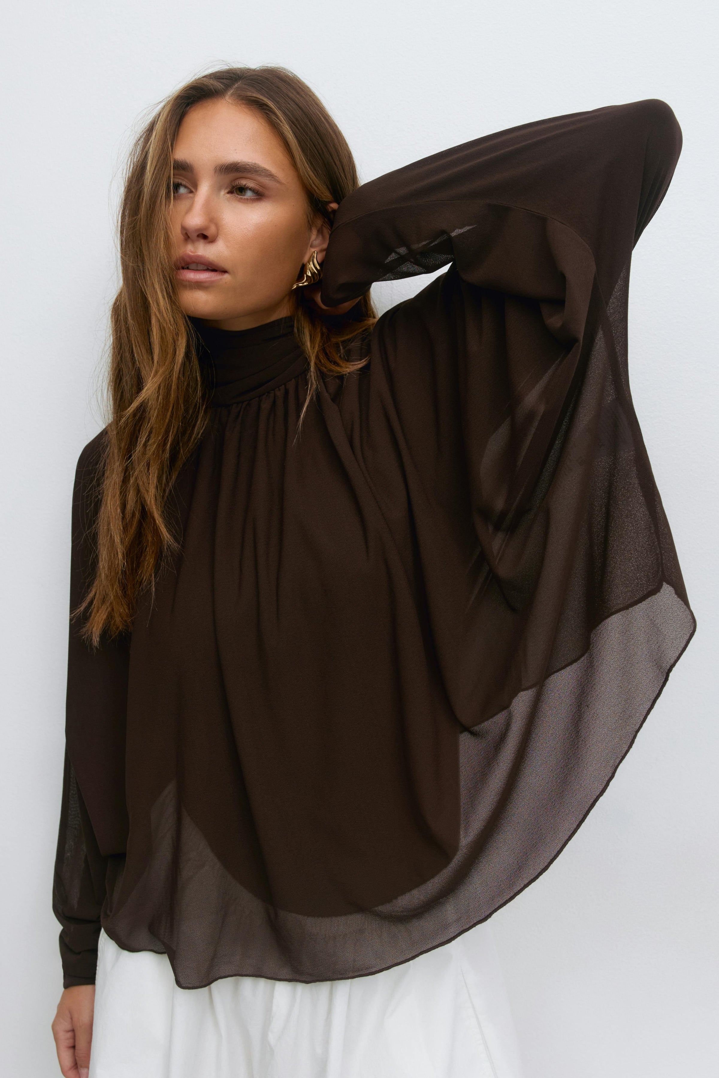 Transparent blus i chiffong med scarfdetalj. Blusen är brun och har lös passform. Den har krage, fladdermusärmar och rynkade sömmar upptill. Fodrad.