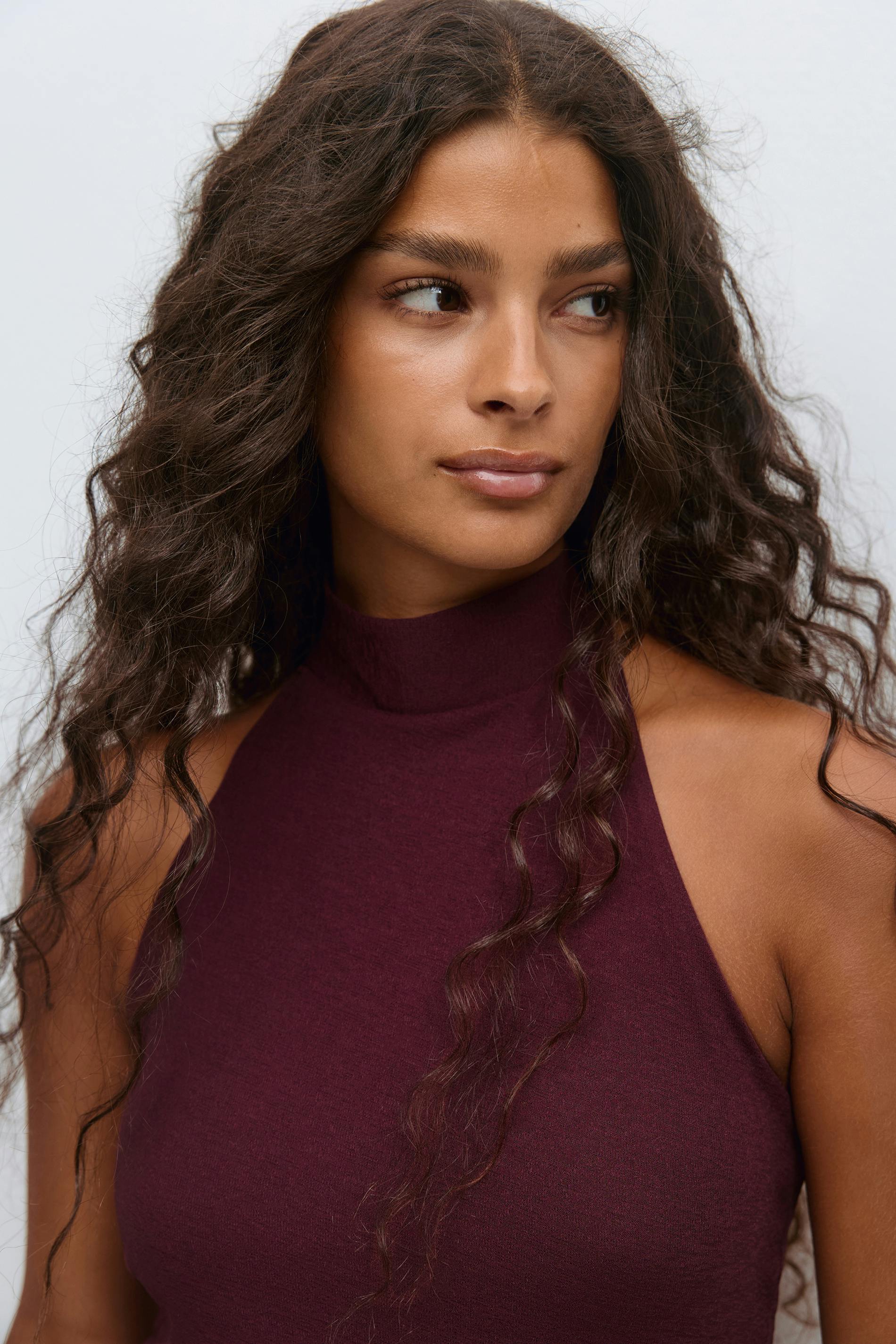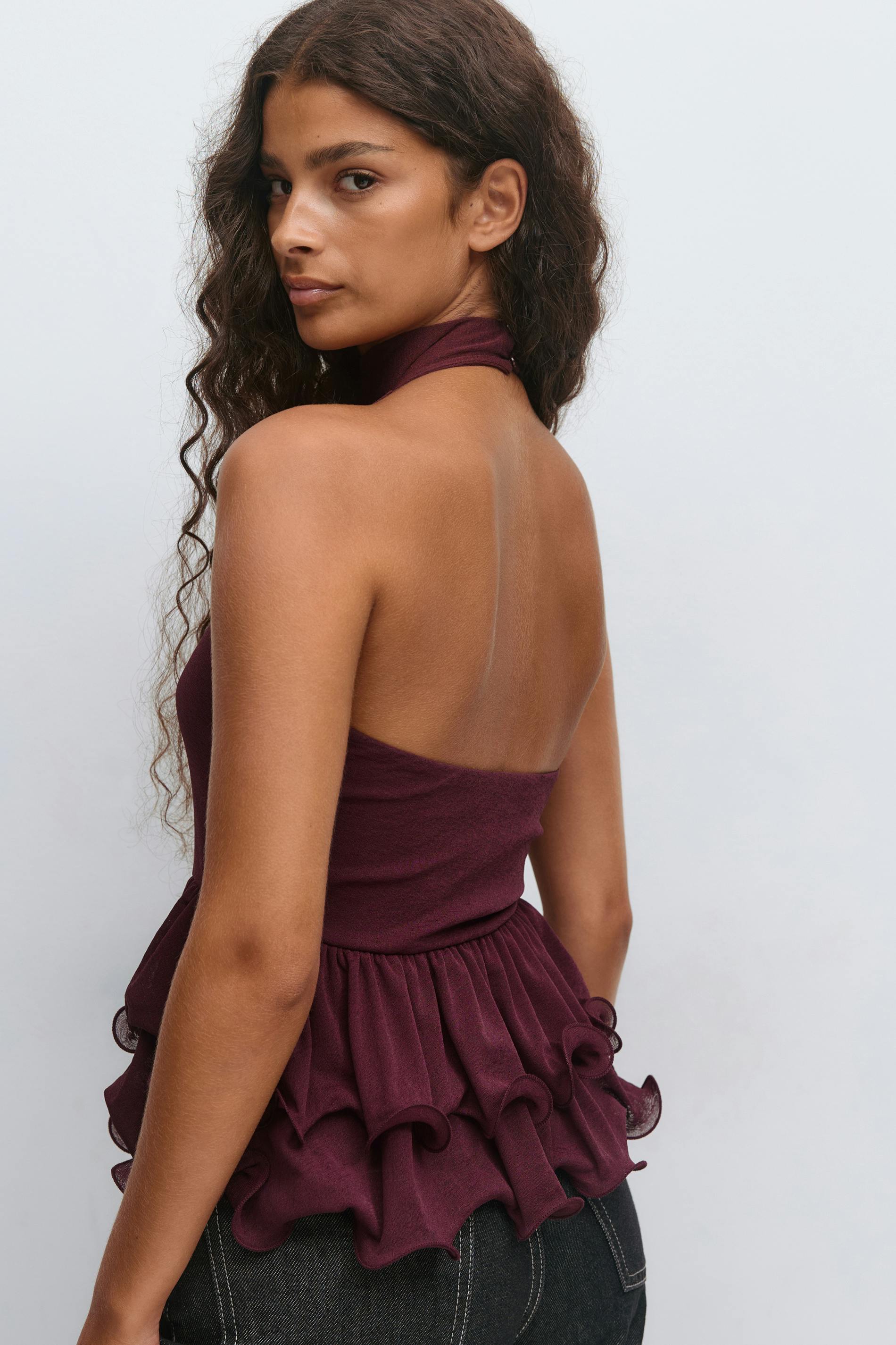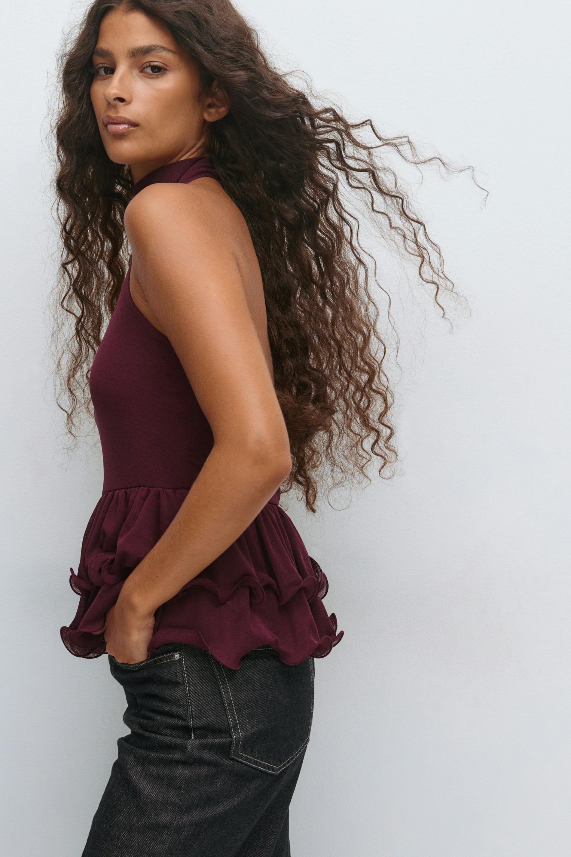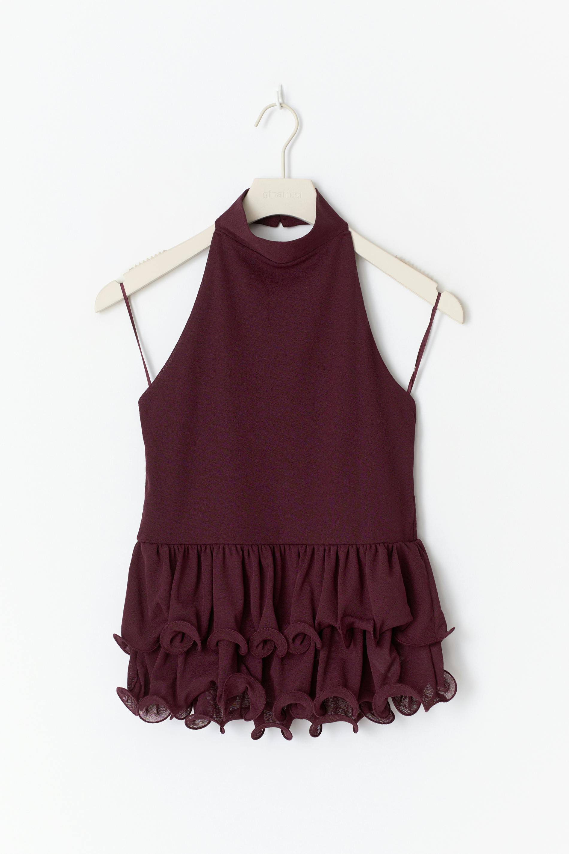 Ärmlös halternecktopp med volanger nedtill. Toppen är vinröd och har öppen rygg. Den har hög krage, figurnära passform och knäppning i nacken.