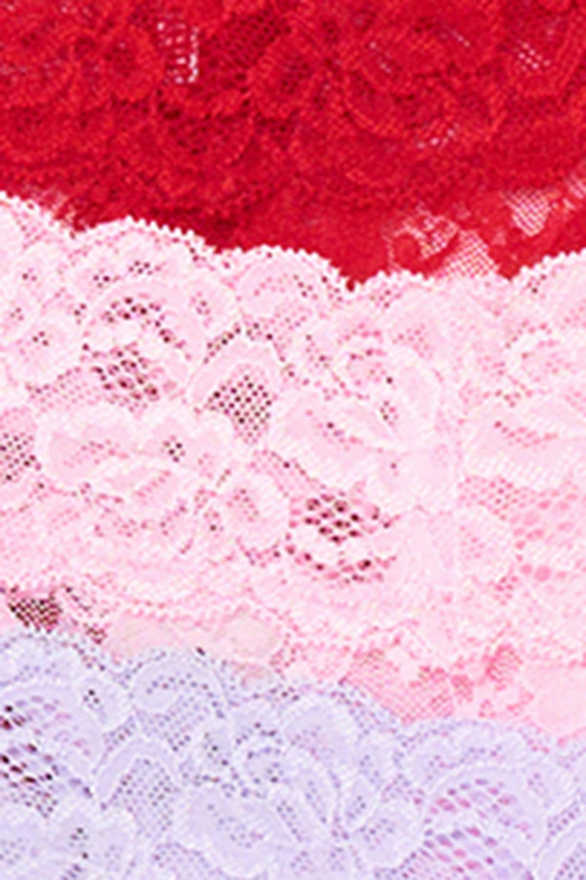 3-pack stringtrosor i spets med låg midja. Stringtrosorna är röda, rosa och lila och har fodrad gren i bomull.