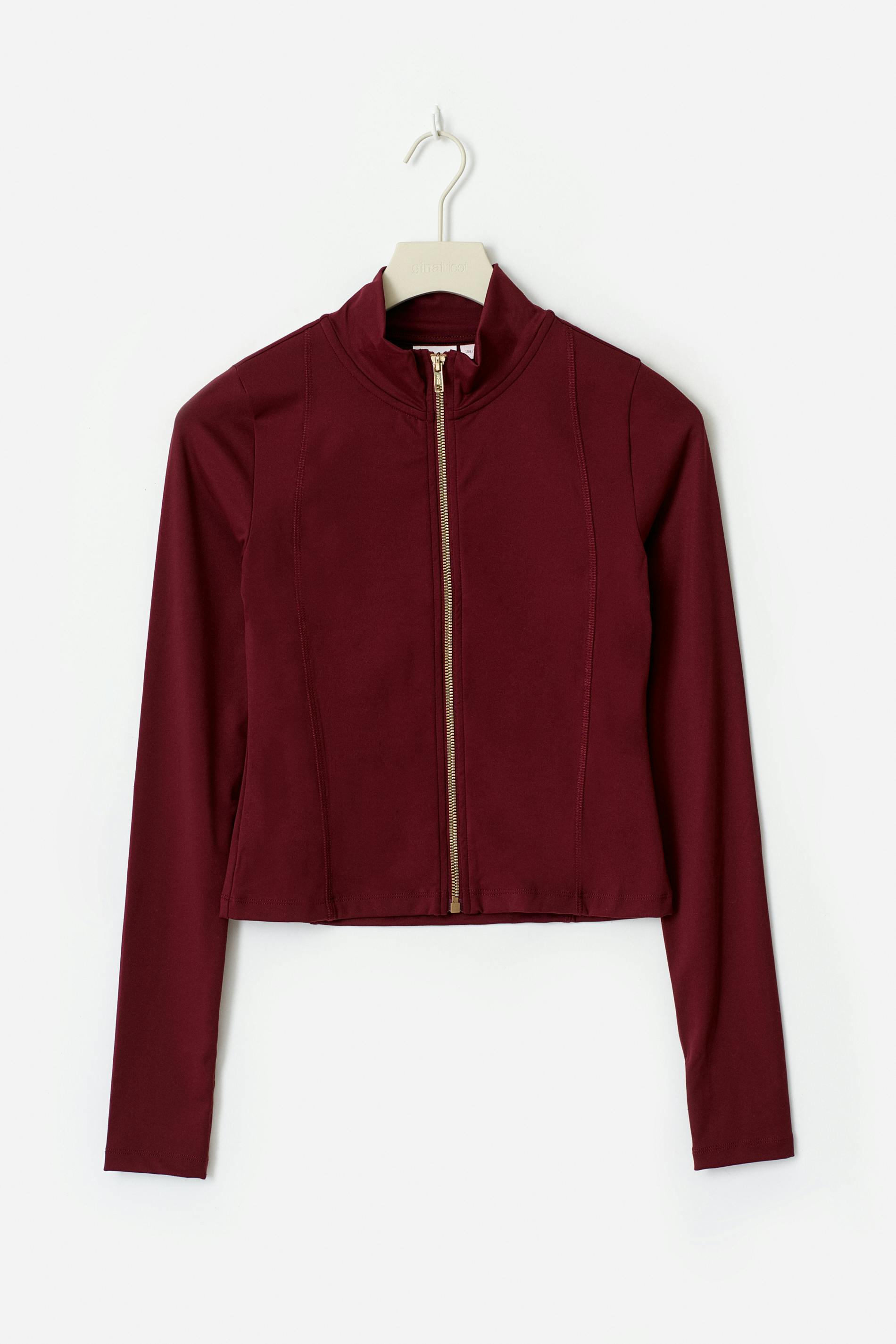 Sportig jacka i trikå med tumhål. Jackan är vinröd och har dragkedja fram. Den har fuktavledande funktion, figurnära passform, långa ärmar och mjuk, stretchig kvalitet.