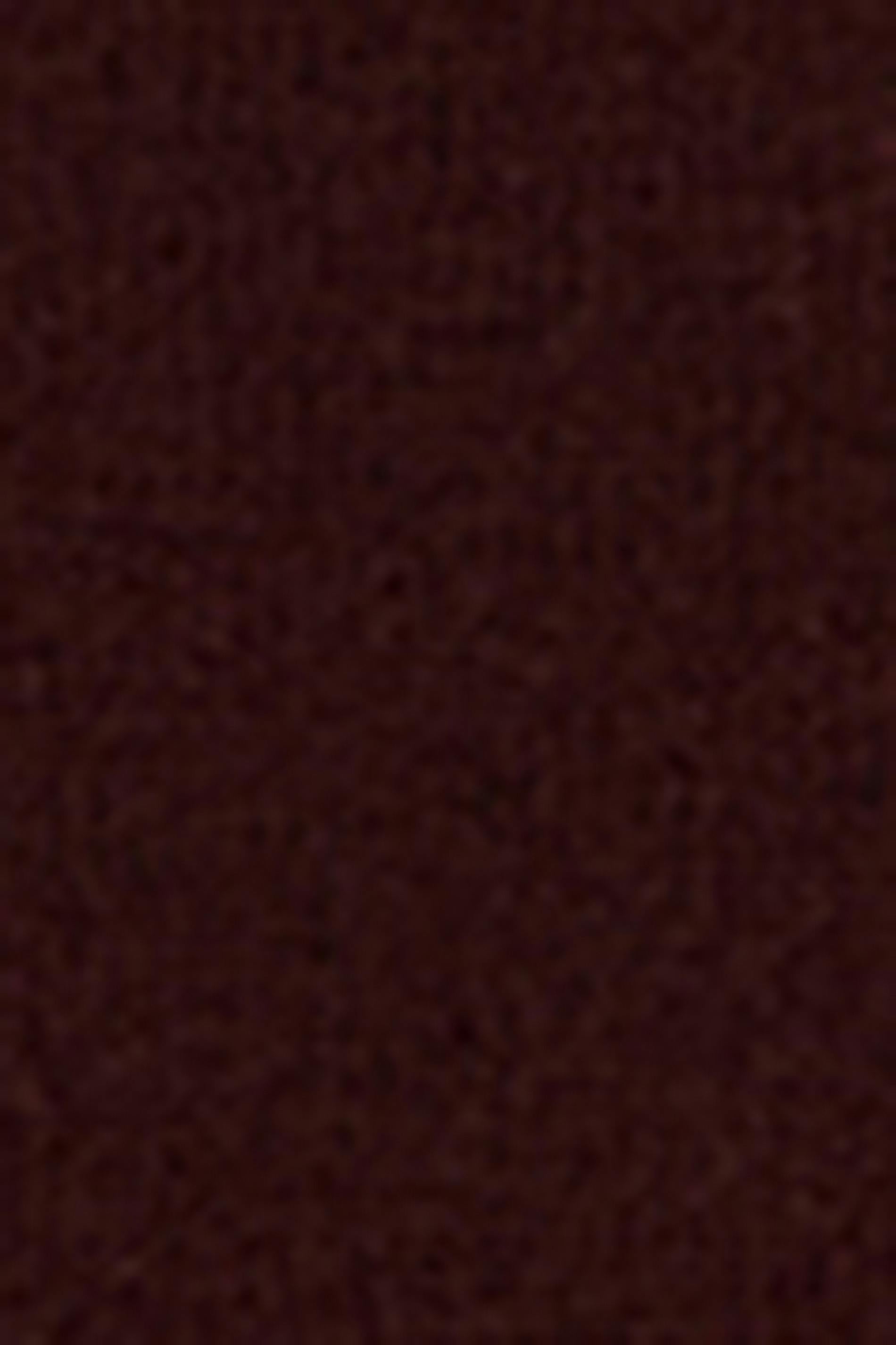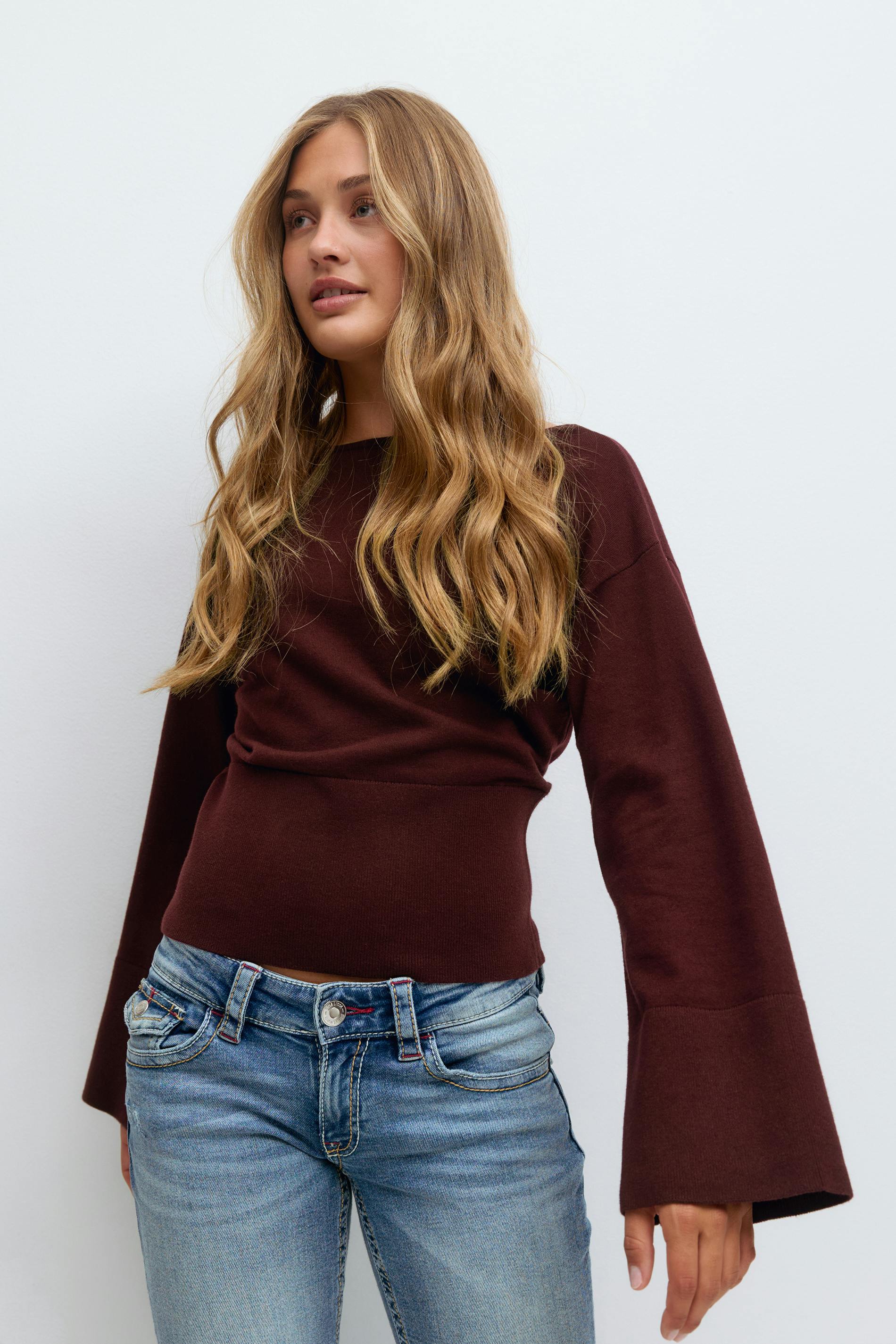 Stickad tröja med djup rygg. Tröjan är vinröd och har figurnära midja. Den har hög halsringning, långa, vida ärmar, ribbstickad nederkant och normal passform.