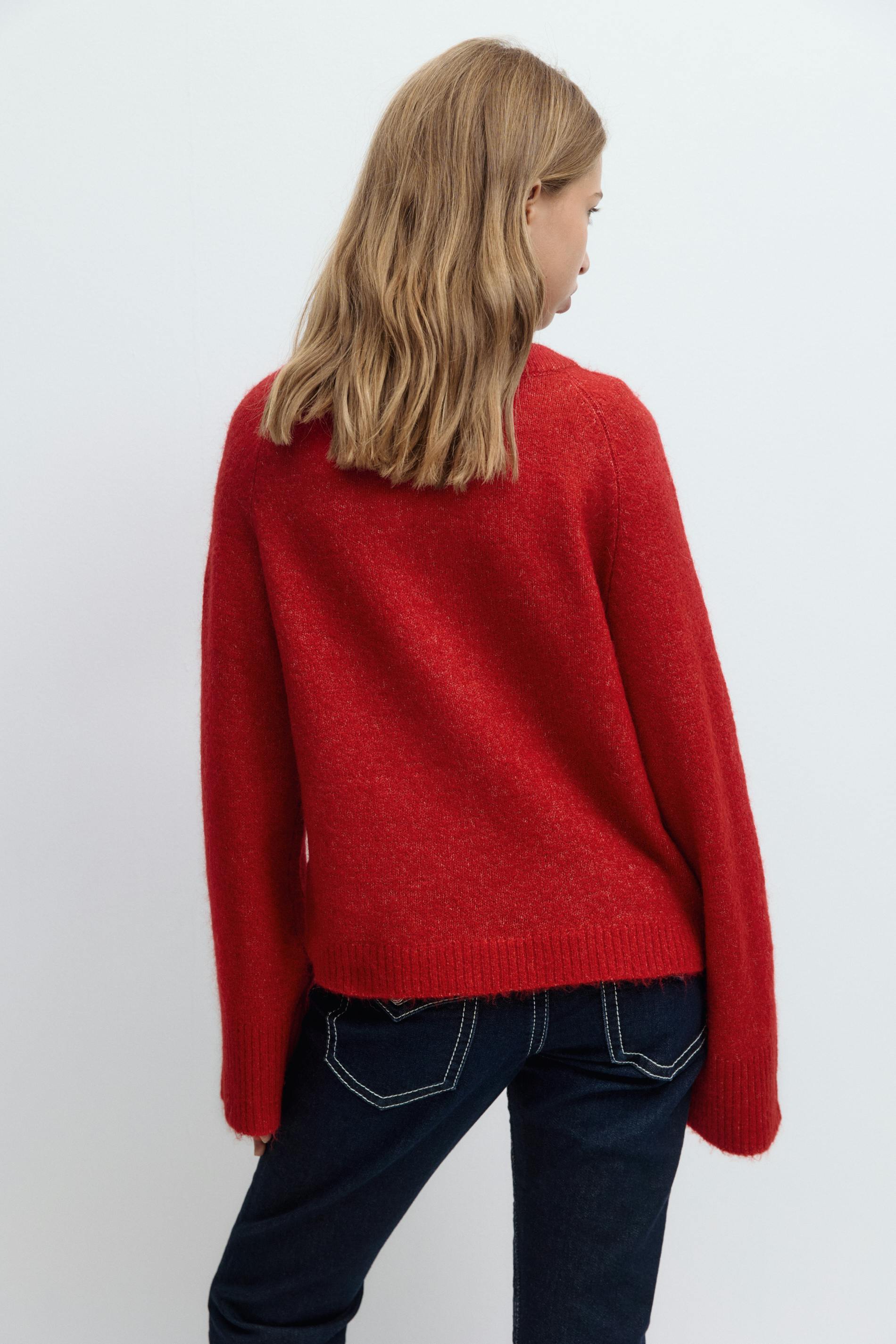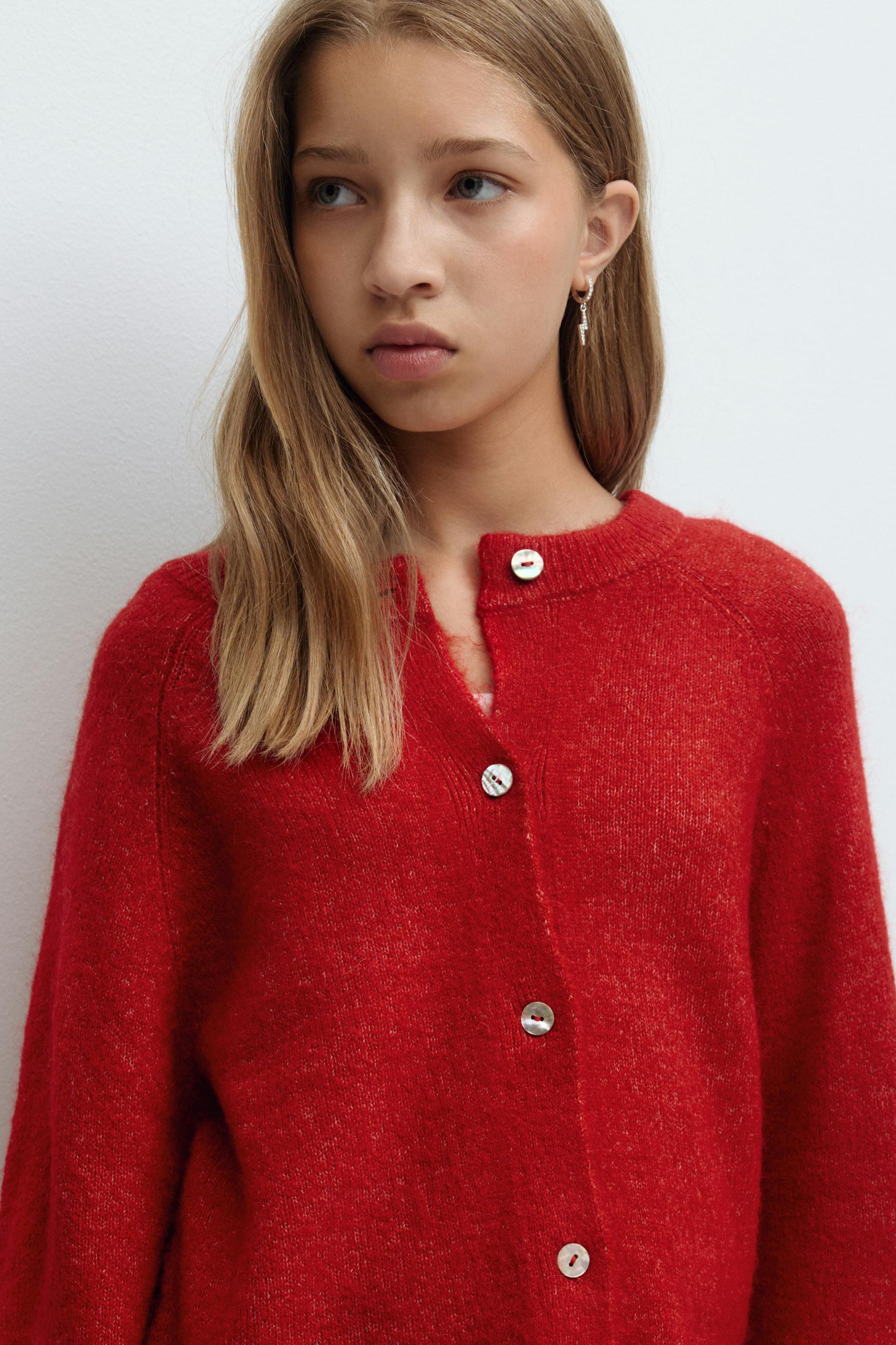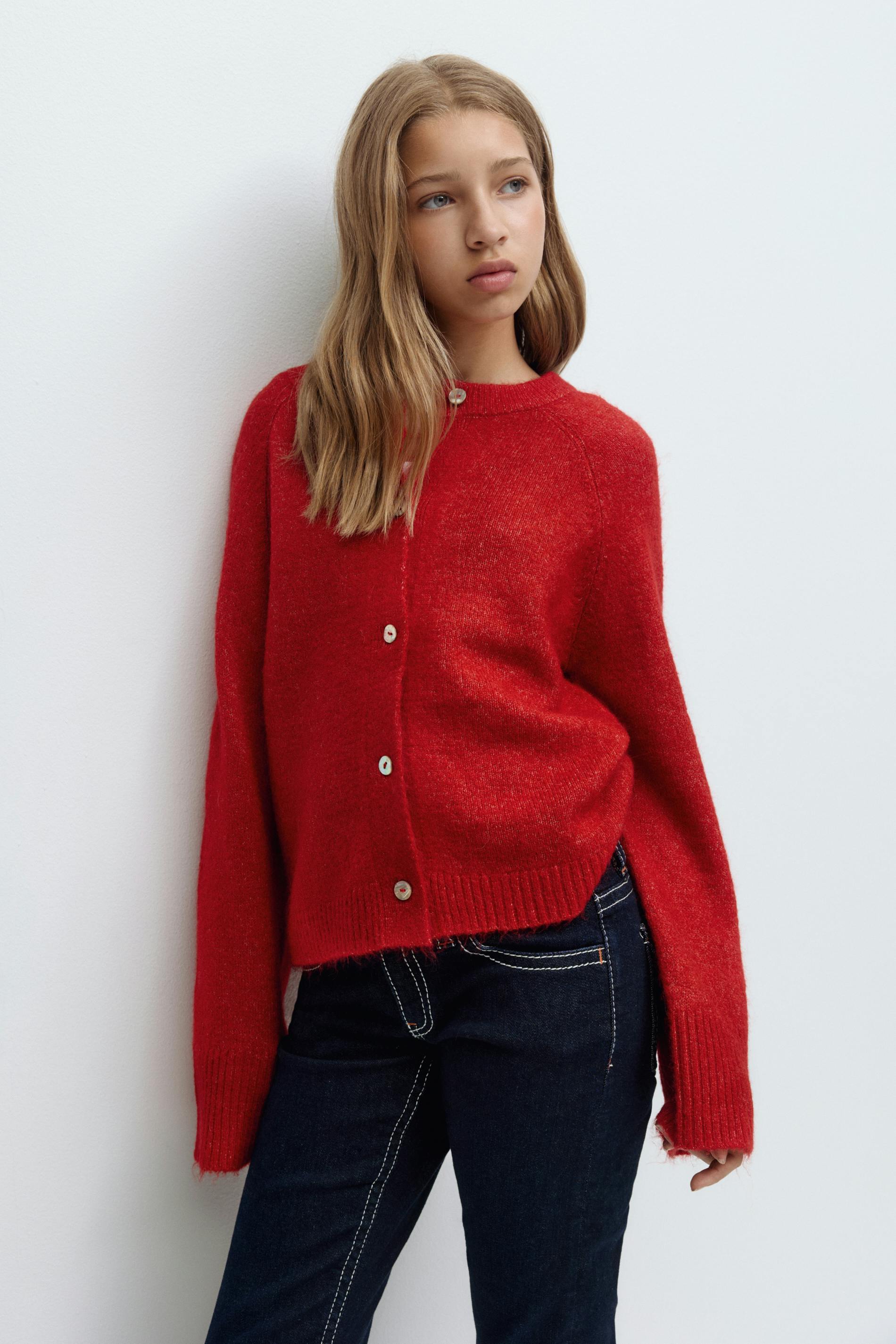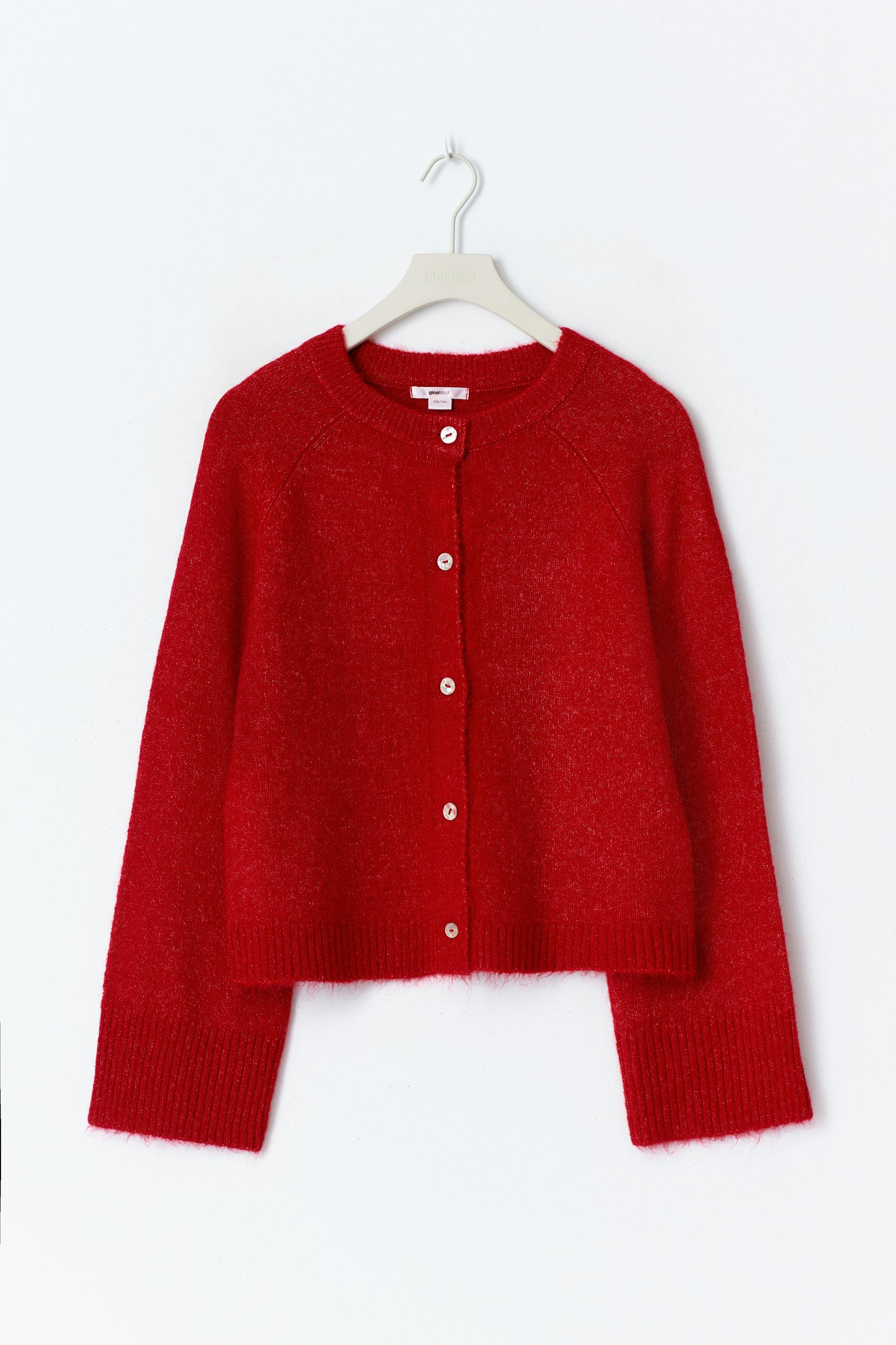 Stickad kofta i ullblandning med knappar framtill. Cardigan är röd och har långa ärmar. Den har normal passform, rund halsringning och ribbstickning vid ärmslut.