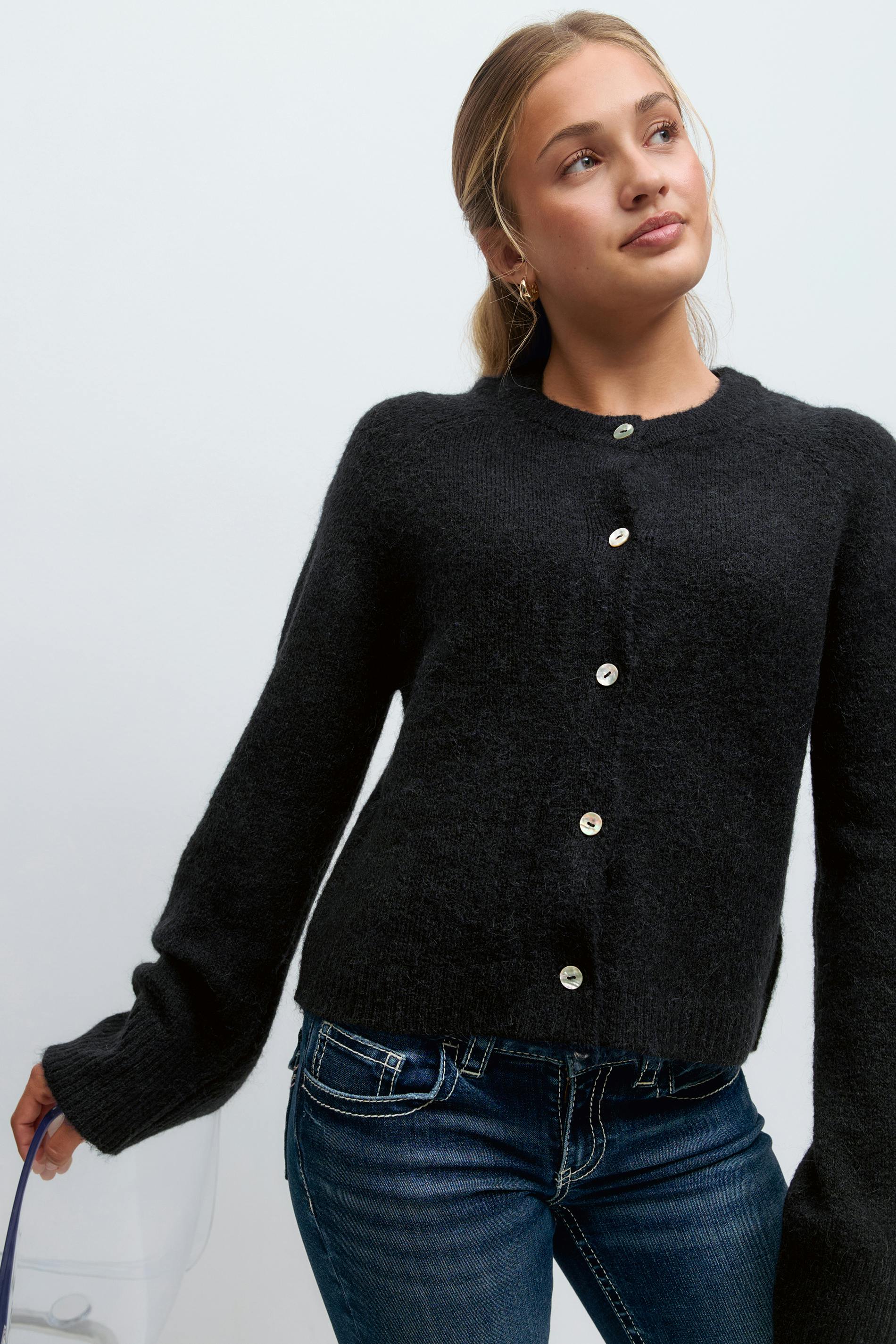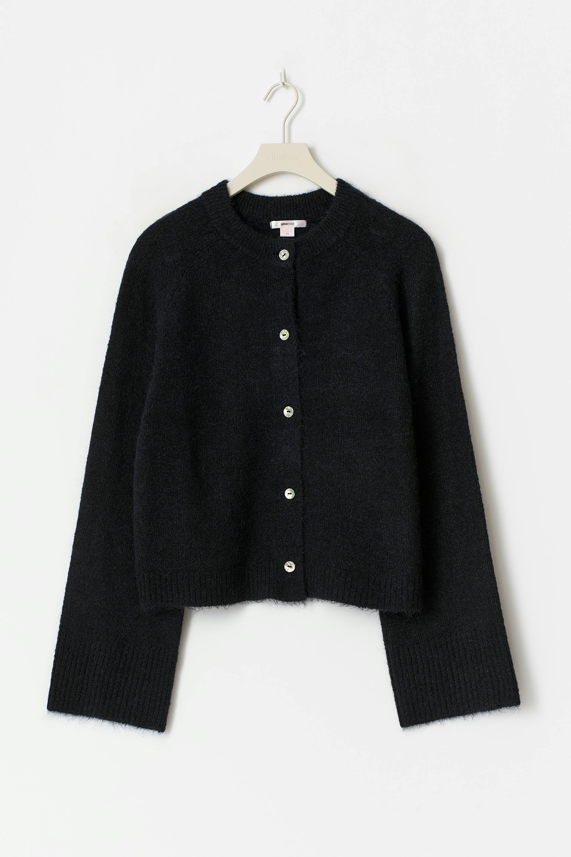 Stickad kofta i ullblandning med knappar framtill. Cardigan är marinblå och har långa ärmar. Den har normal passform, rund halsringning och ribbstickning vid ärmslut.