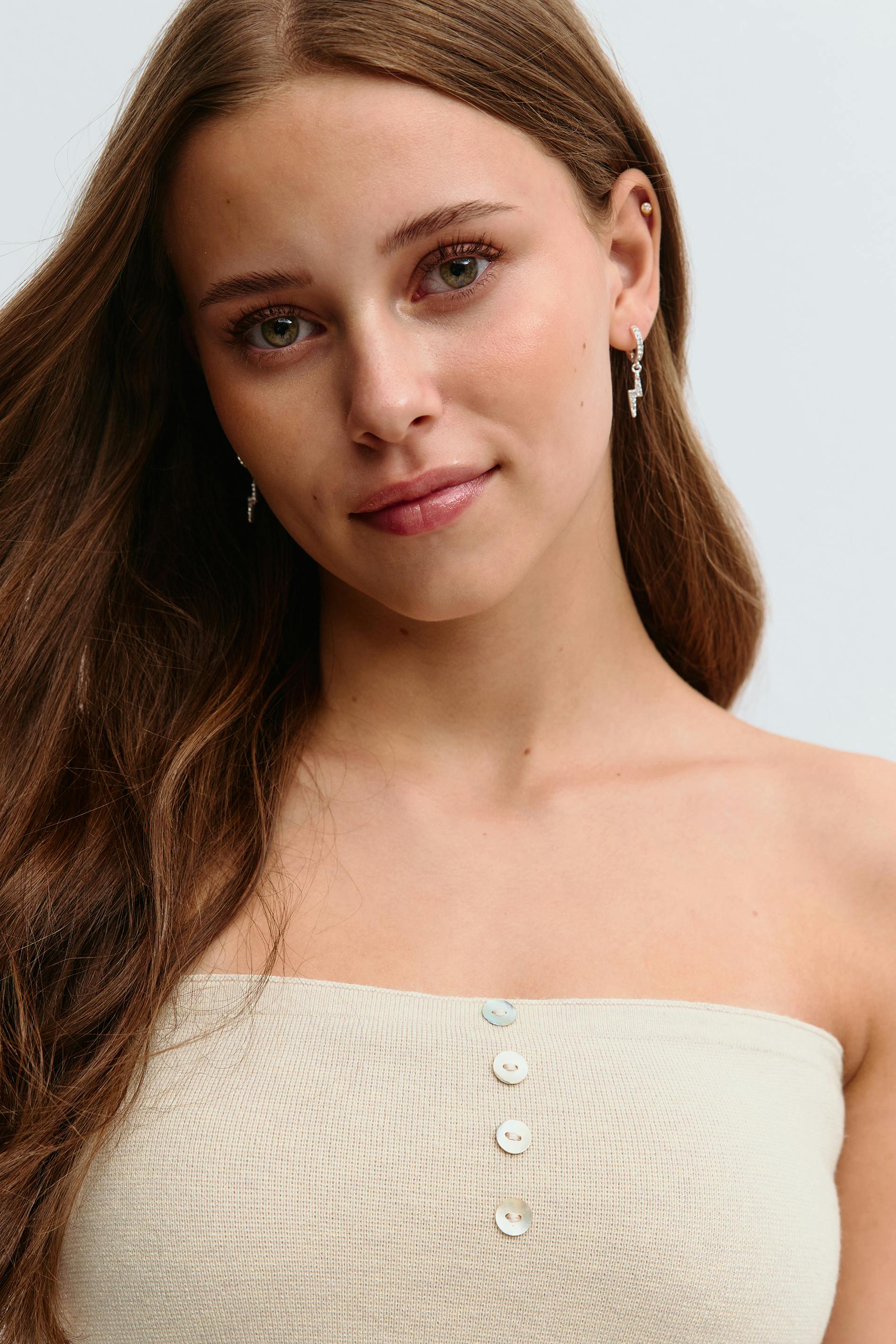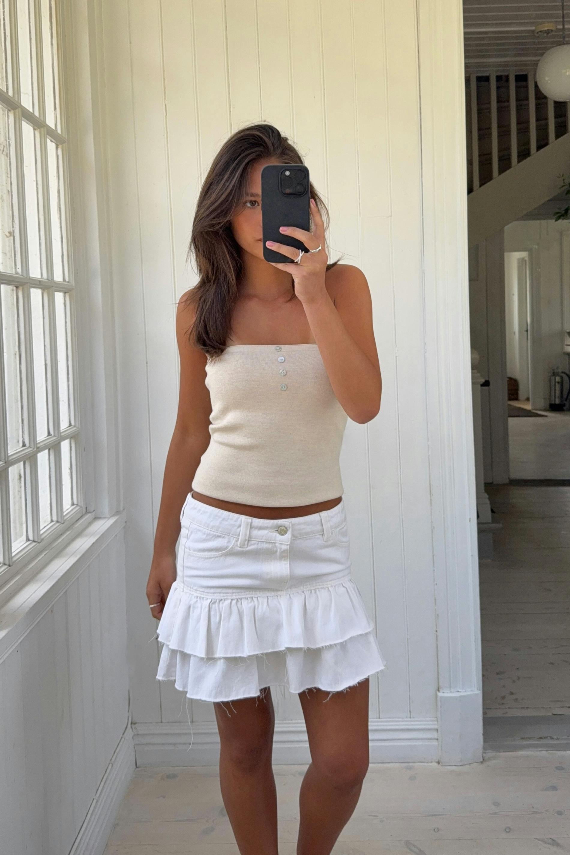 Stickad tubtopp med knappdetaljer framtill. Toppen är beige och har normal passform. Den har foder.
