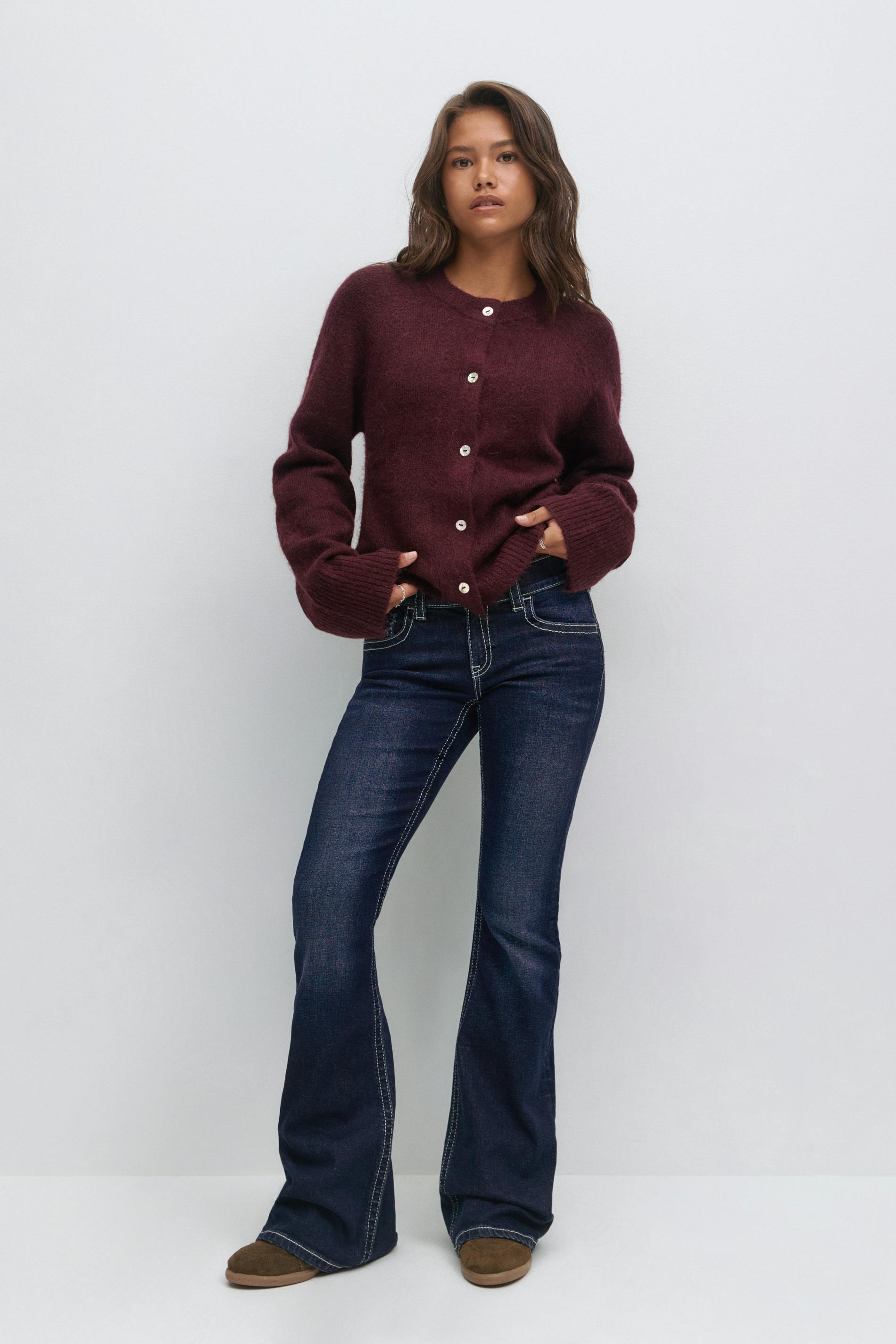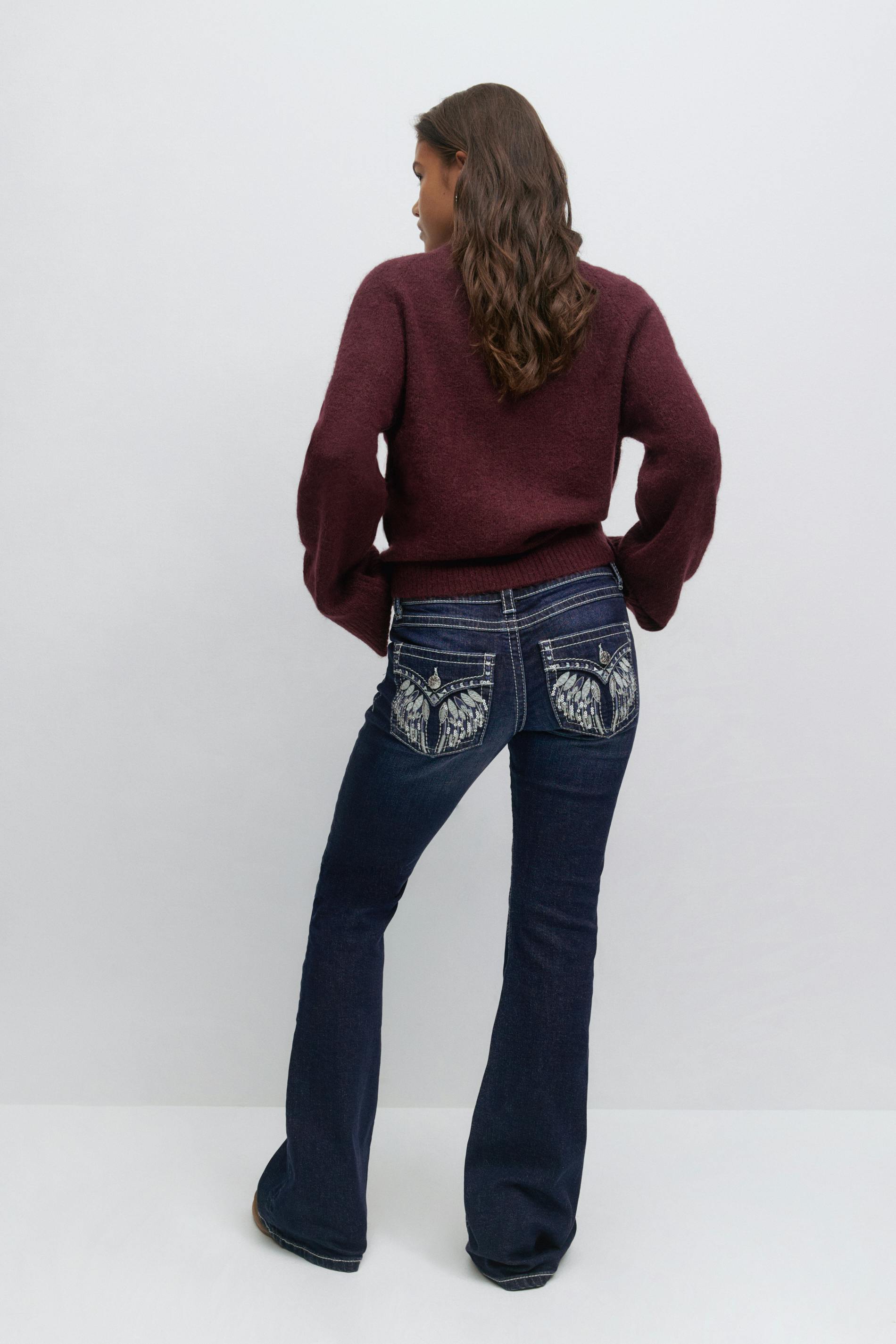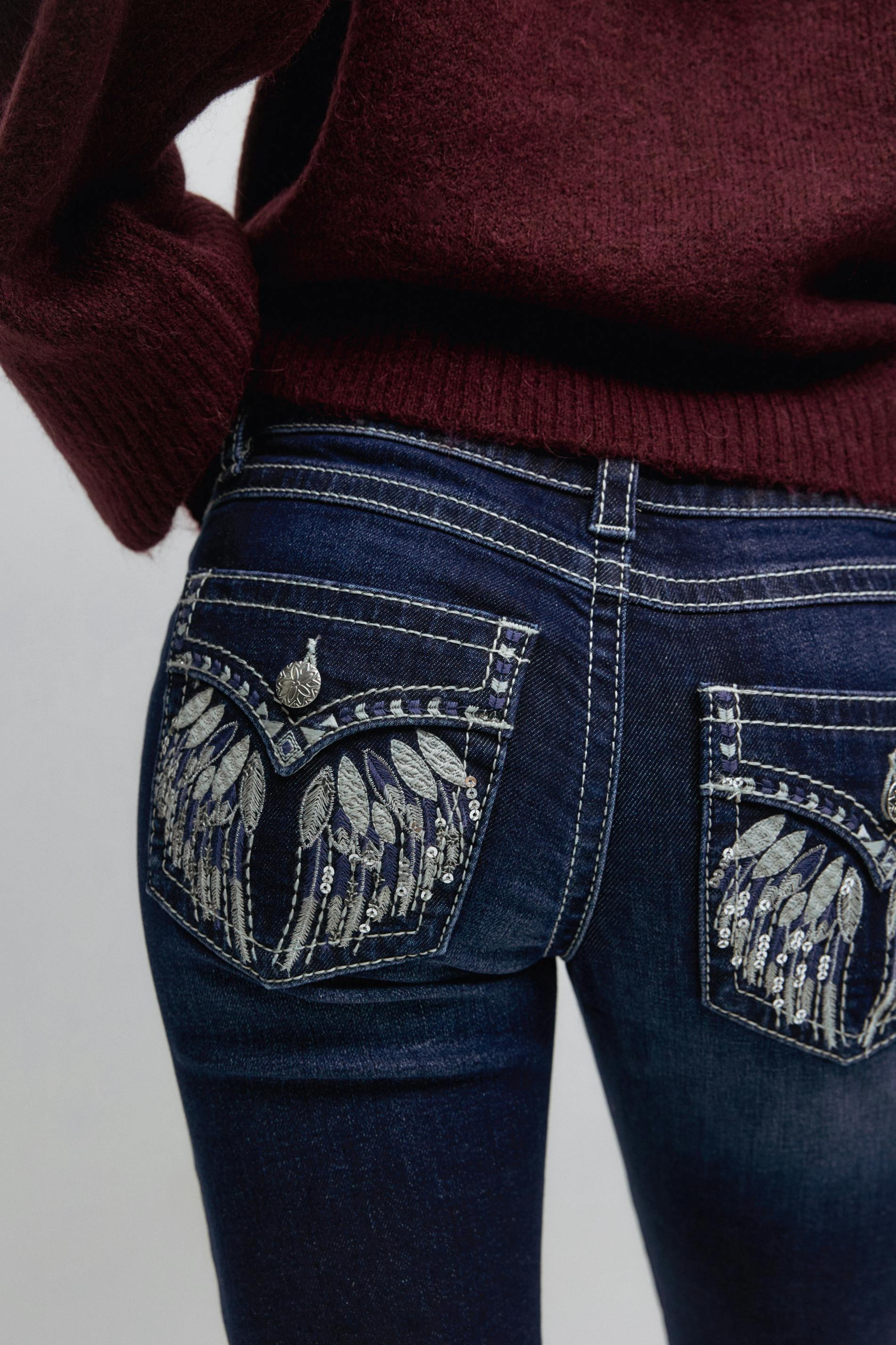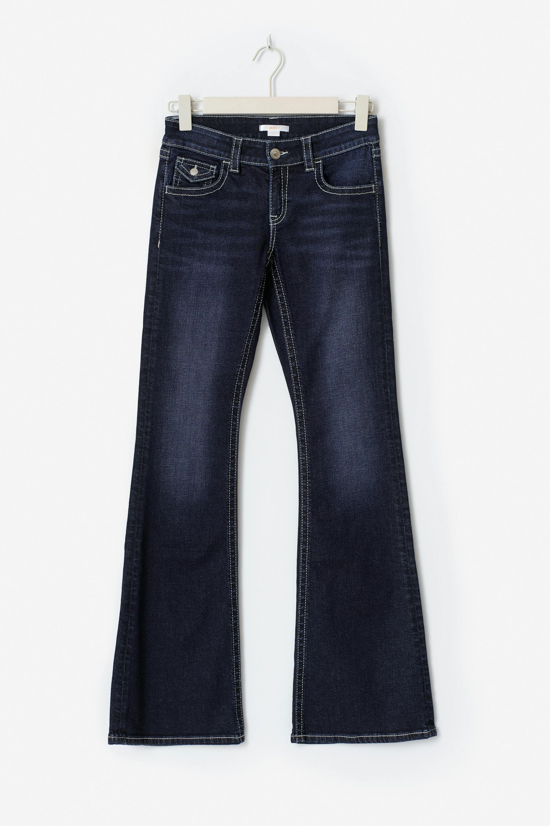 Bootcut jeans med låg midja. Jeansen är blåa och har broderade bakfickor med lock och knapp. De har justerbar resår i midjan, utsvängda ben, dragkedjegylf, låg stretch, bälteshällor och framfickor.