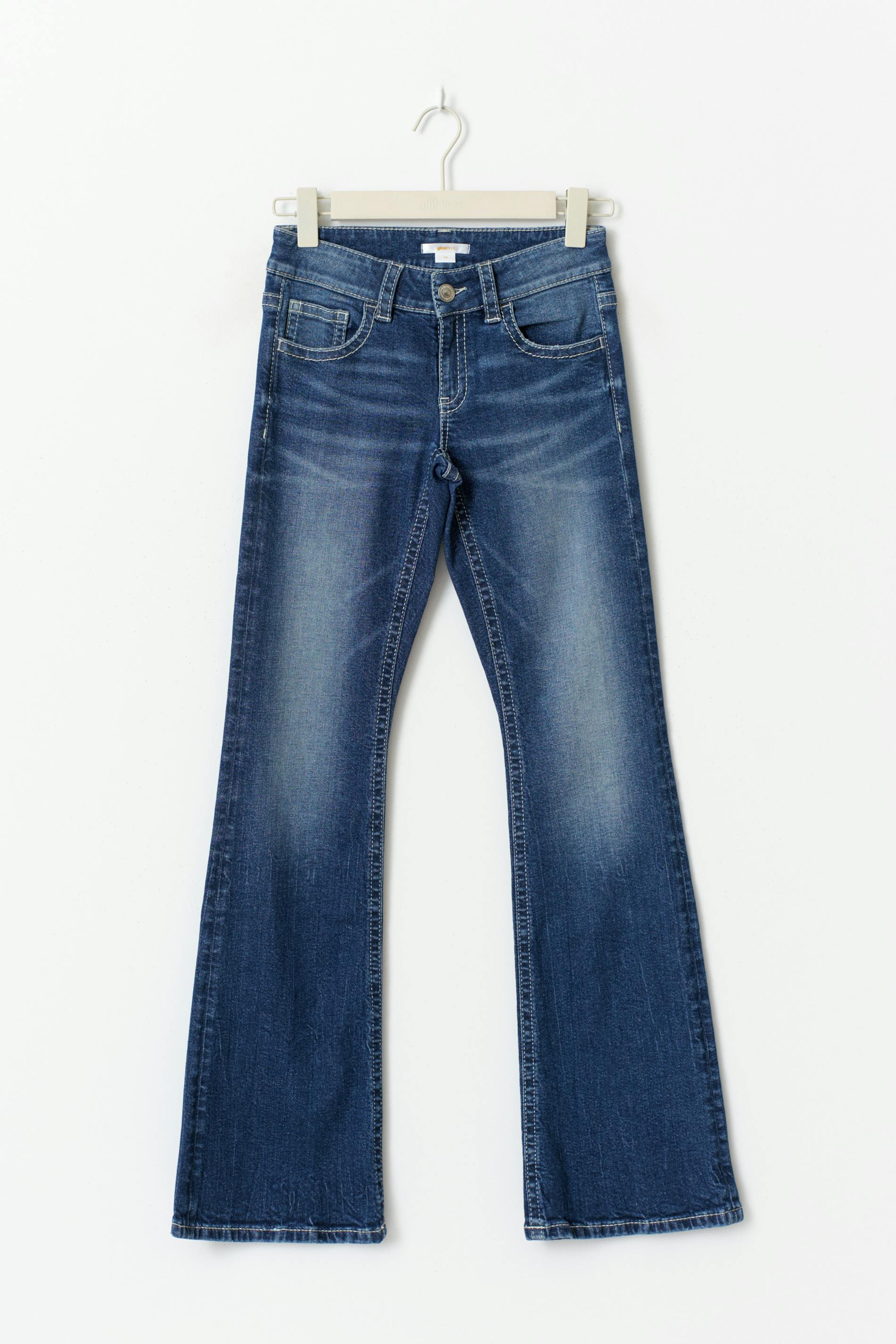 Tall flare jeans med låg midja. Jeansen är blåa och har utsvängda ben. De har låg stretch, justerbar resår i midjan, bälteshällor, framfickor, dragkedjegylf och broderade bakfickor med lock och knapp. Passar för dig som är 175 cm eller längre.