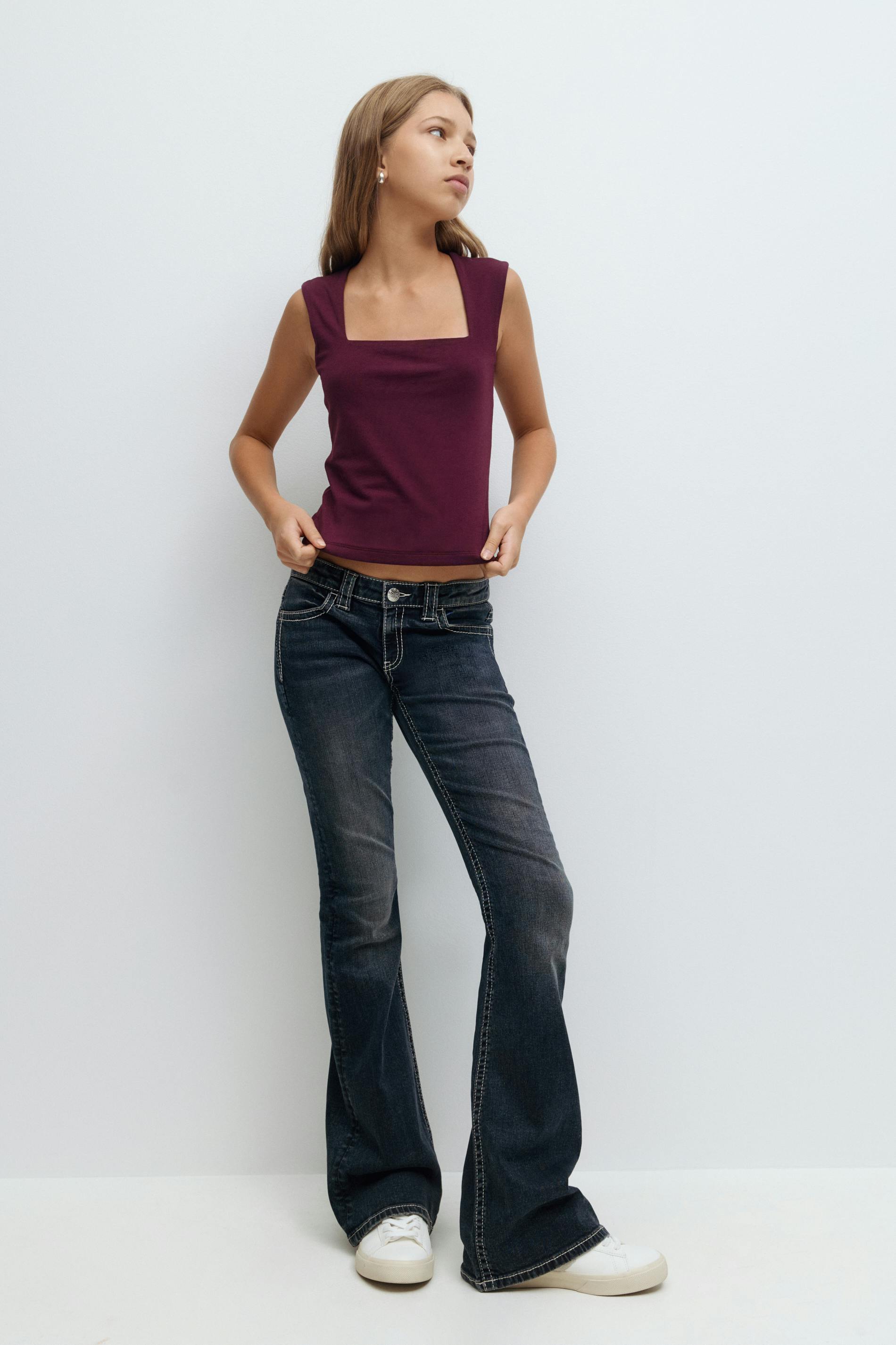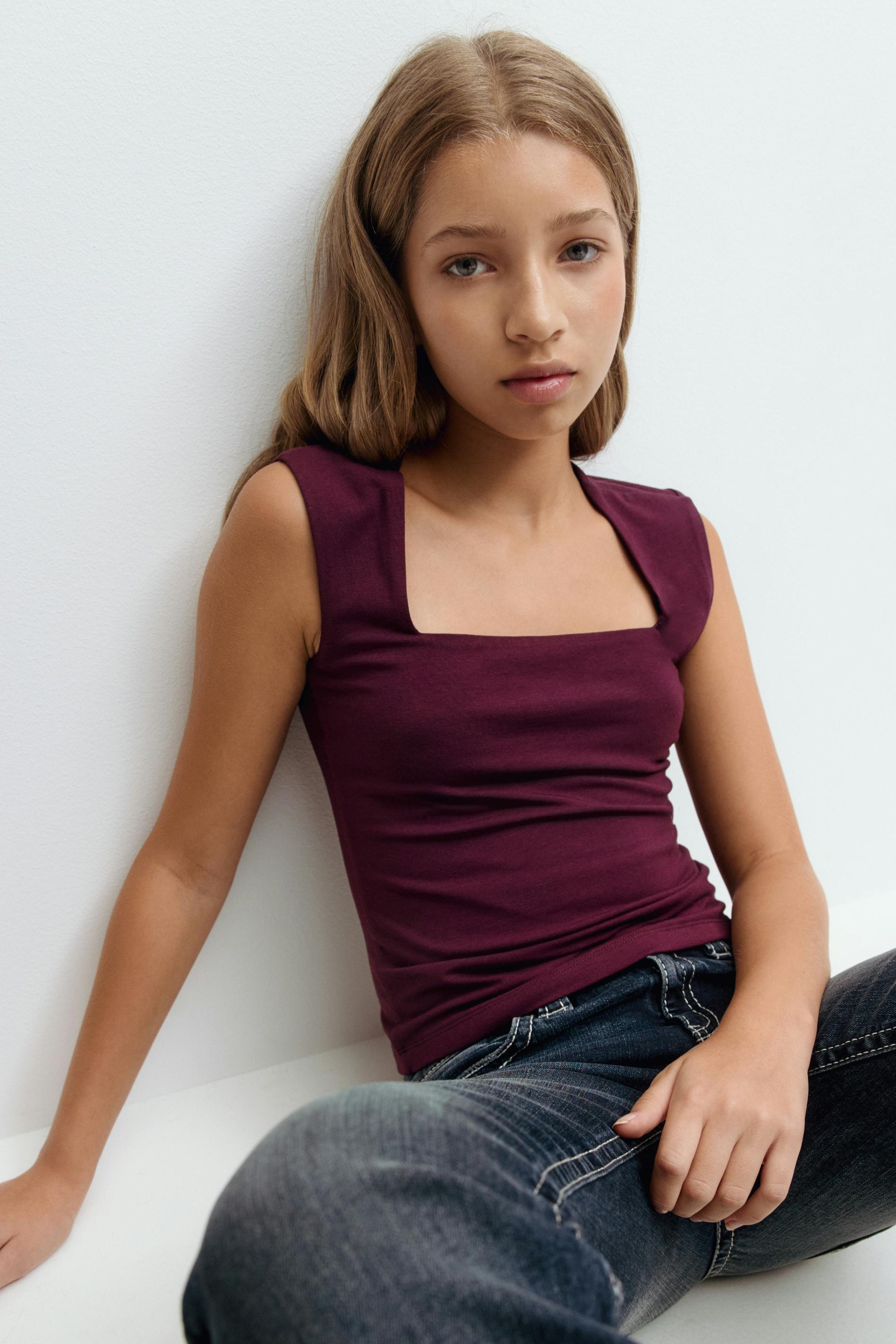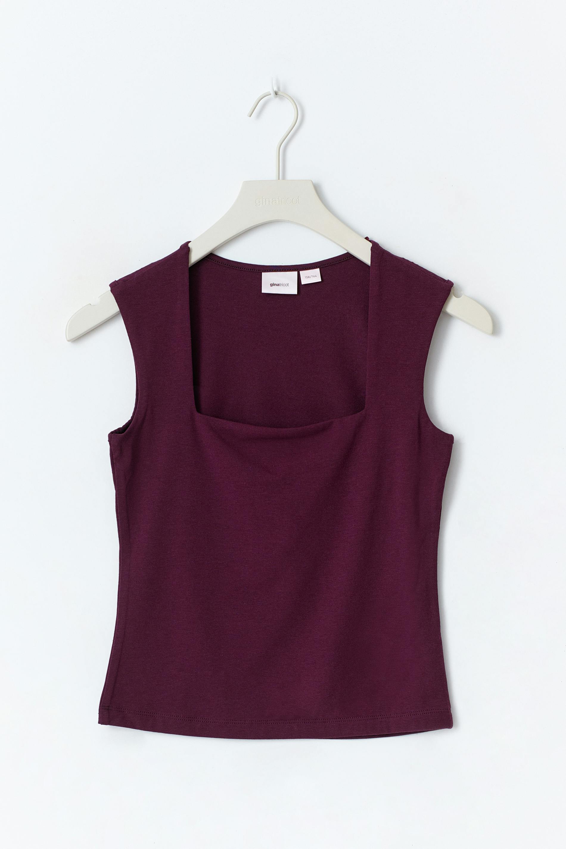 Ärmlös topp med fyrkantig halsringning. Toppen är vinröd och har figurnära passform. Den har croppad längd och stretchigt material.
