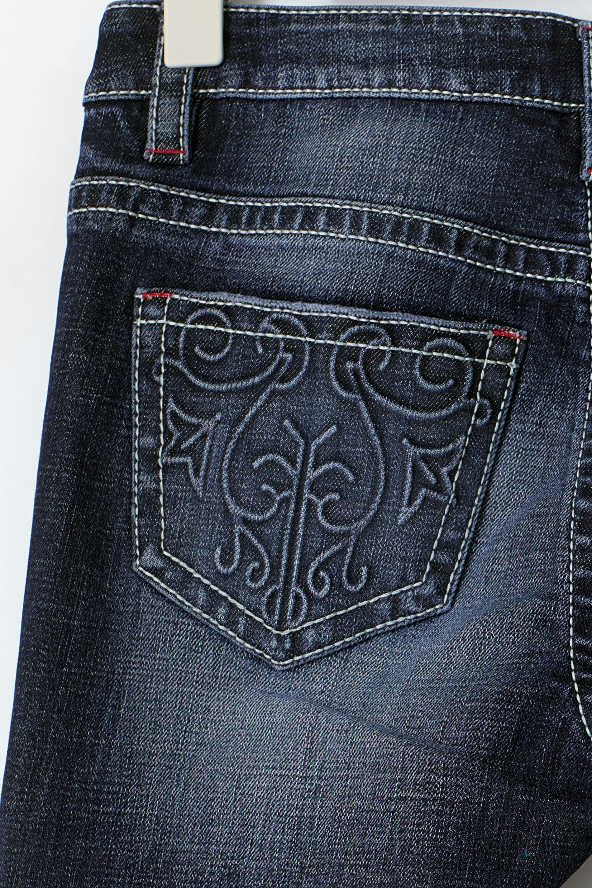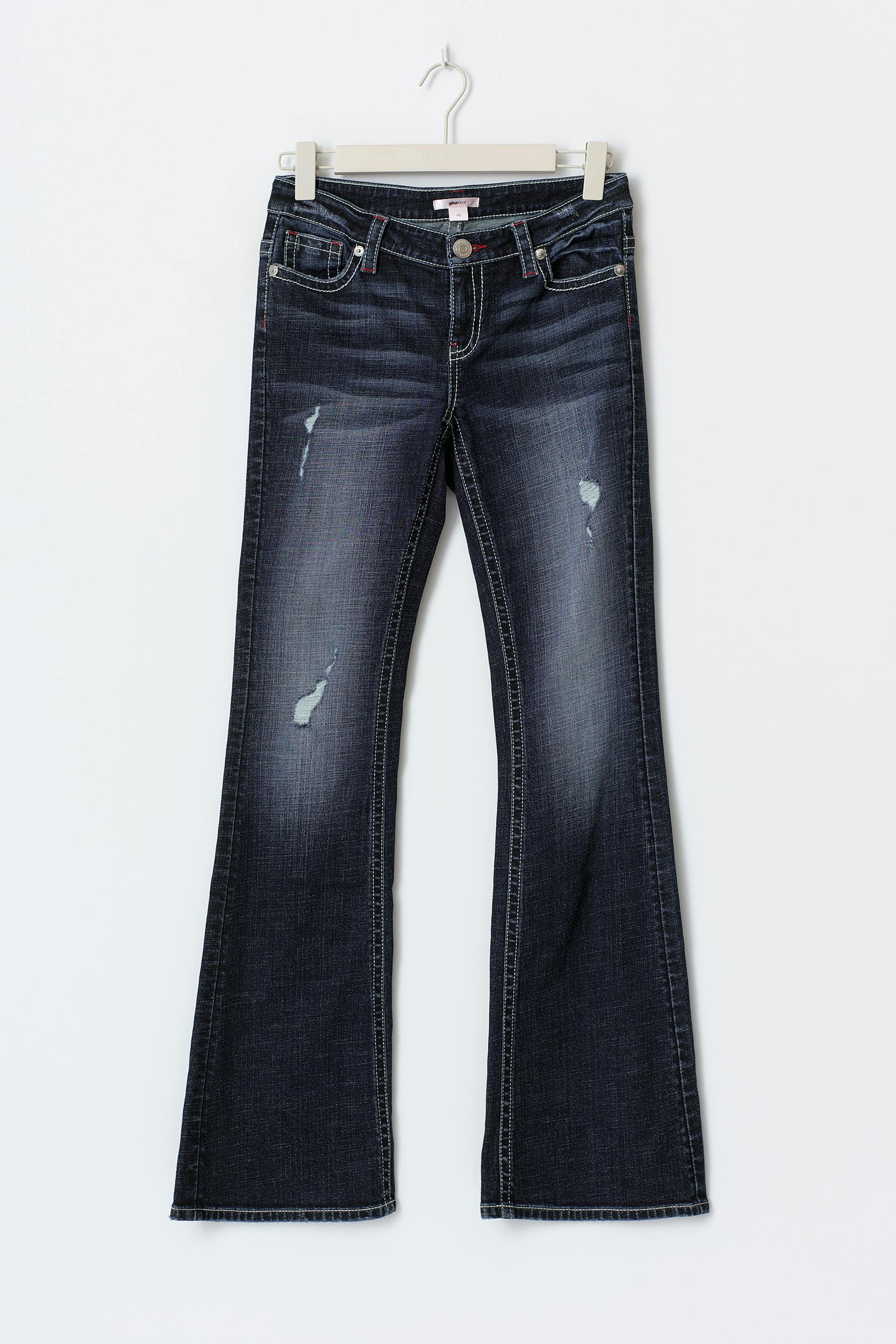 Flare jeans med en låg midja. Jeansen är mörkblåa och har en normallängd. De har broderade bakfickor, utsvängda ben, en låg stretch, framfickor och dragkedjegylfar.