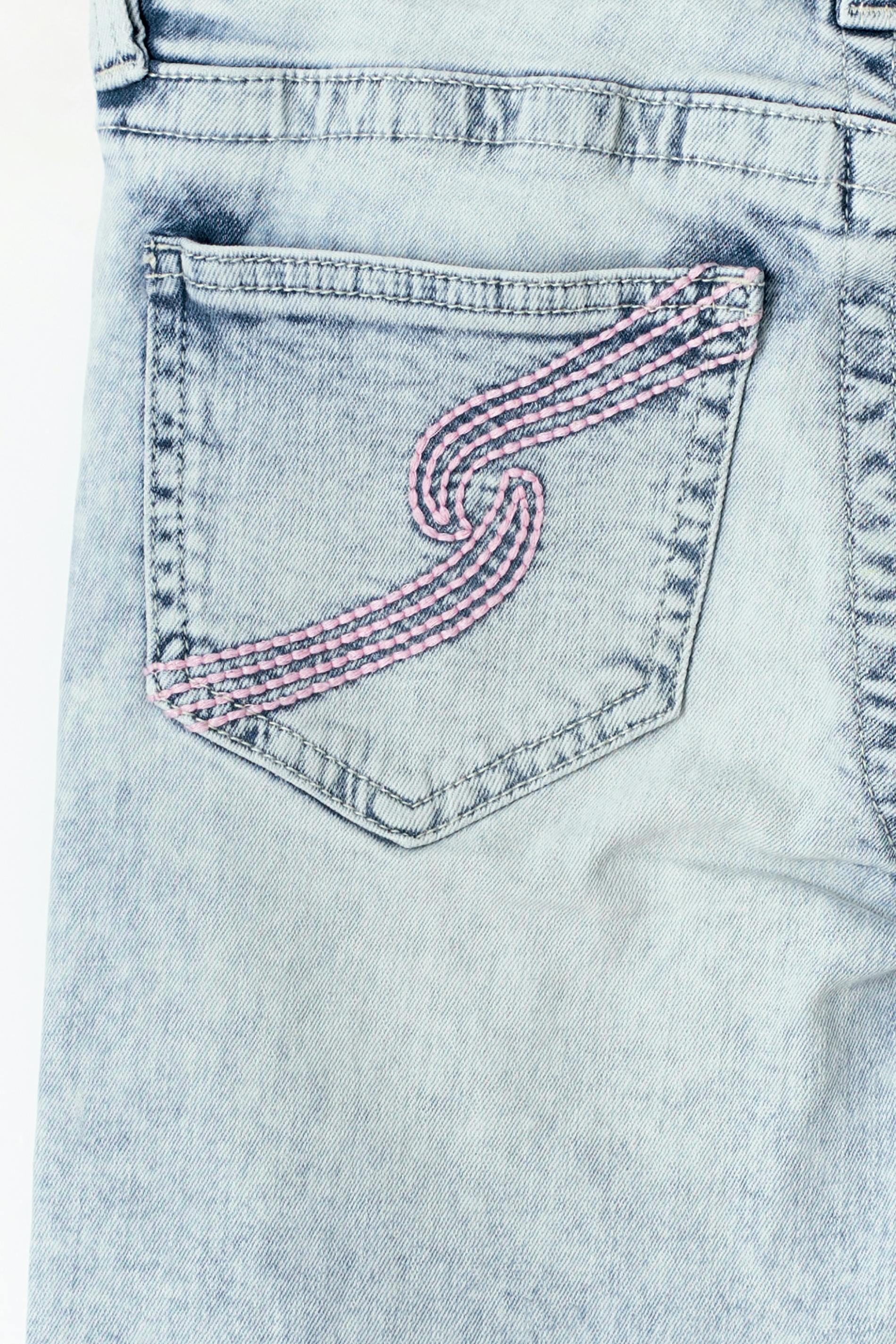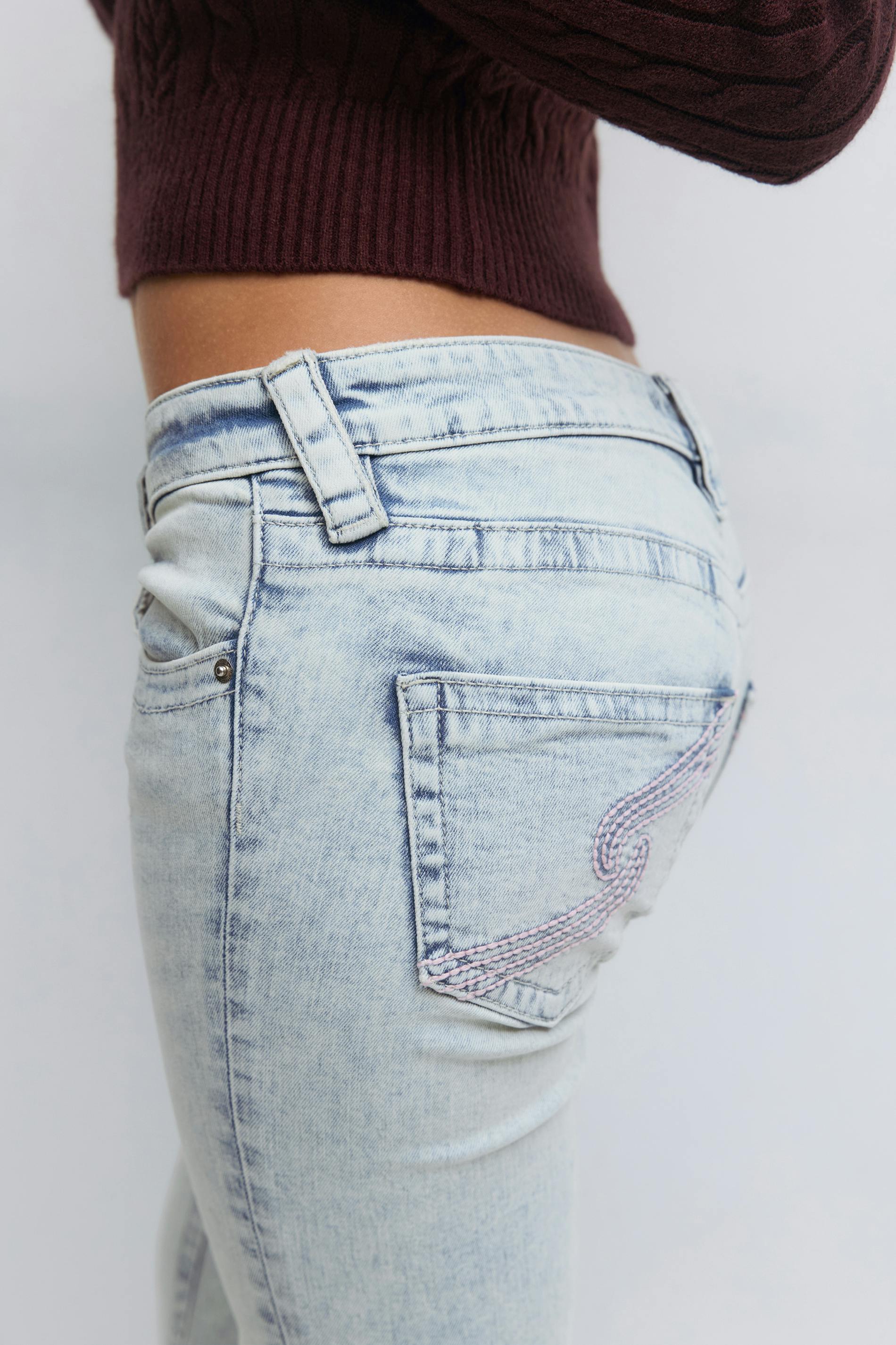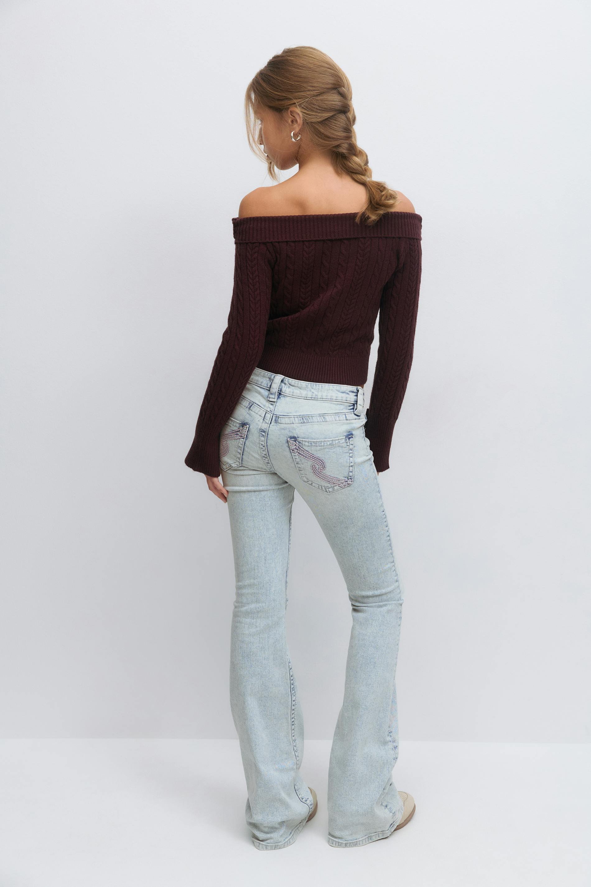 Flare jeans med låg midja. Jeansen är blåa och har utsvängda ben med normallängd. De har dragkedjegylf, bälteshällor och fickor fram och bak.