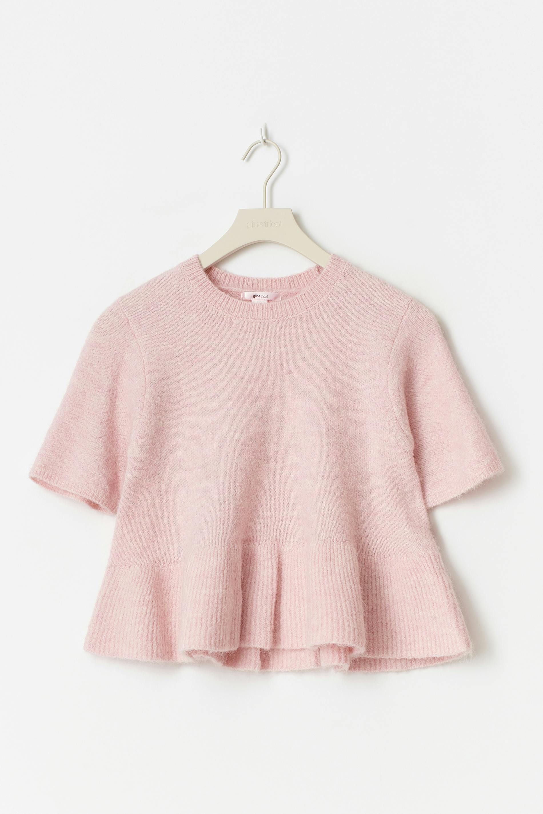 Stickad peplumtopp med volang i nederkant. Toppen är rosa och har mjukt stickat material. Den har lös passform, korta ärmar, rund halsringning och ribbstickad nederkant.
