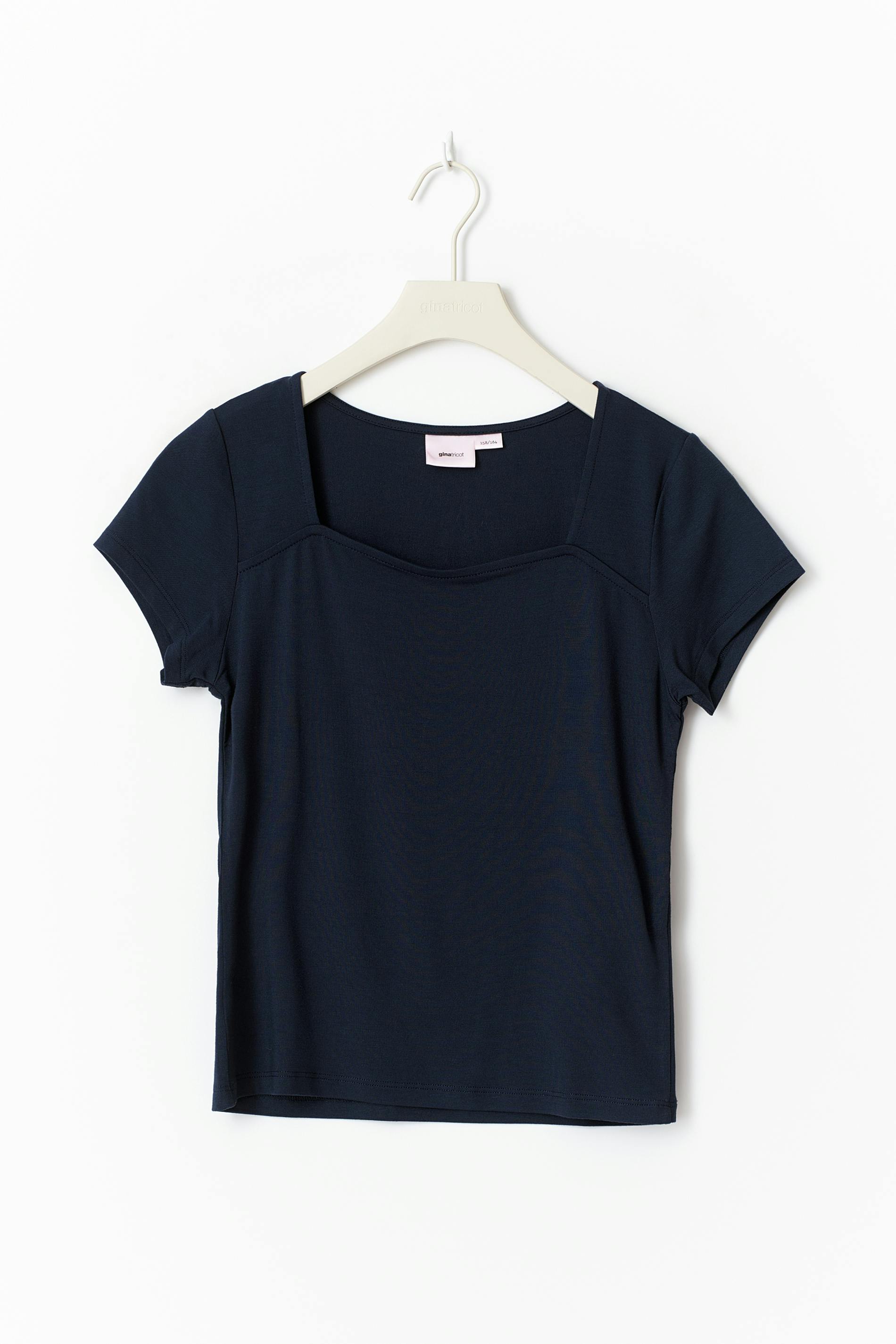 Kortärmad topp med fyrkantig halsringning. Toppen är marinblå och har normal passform.