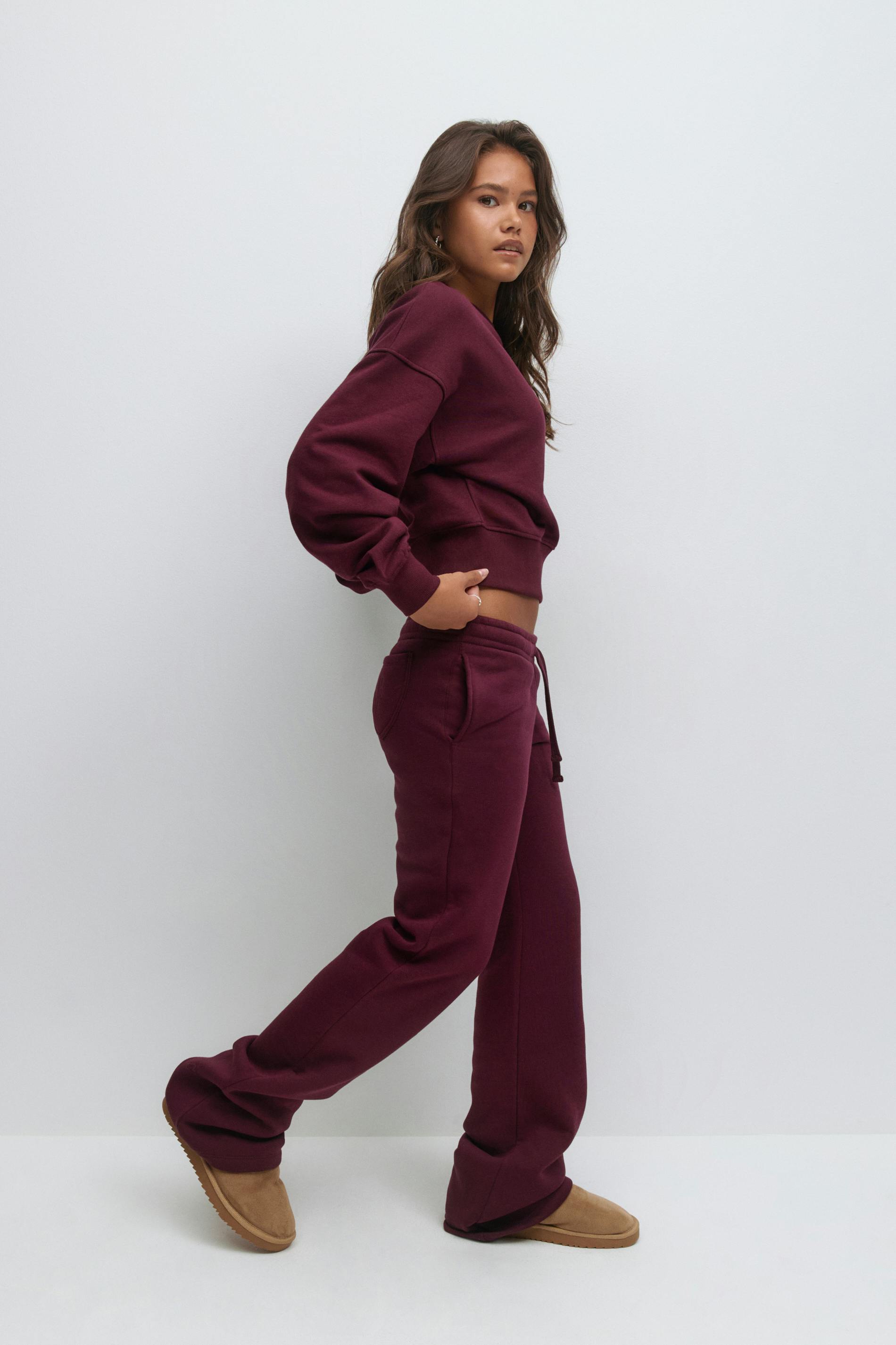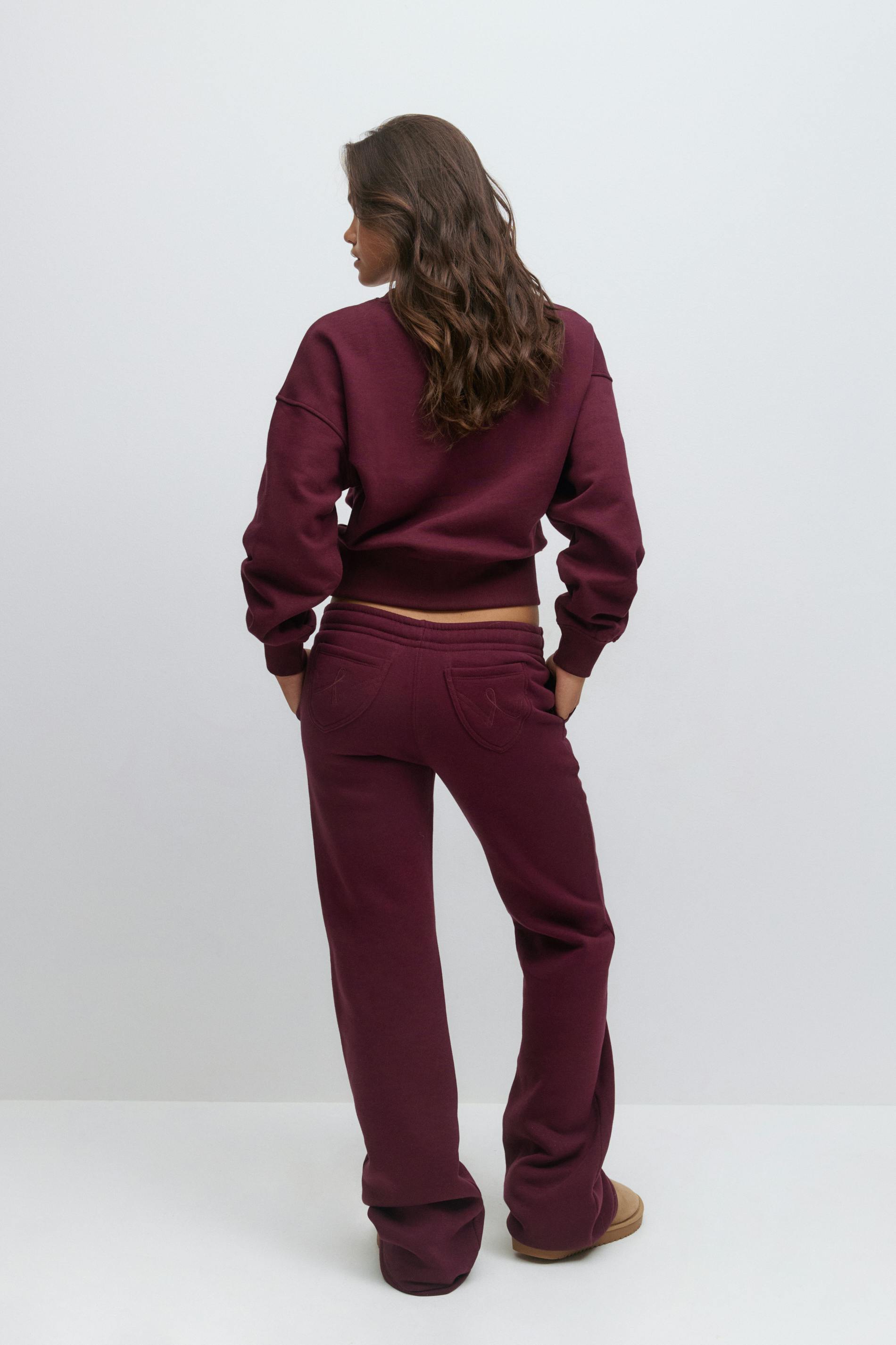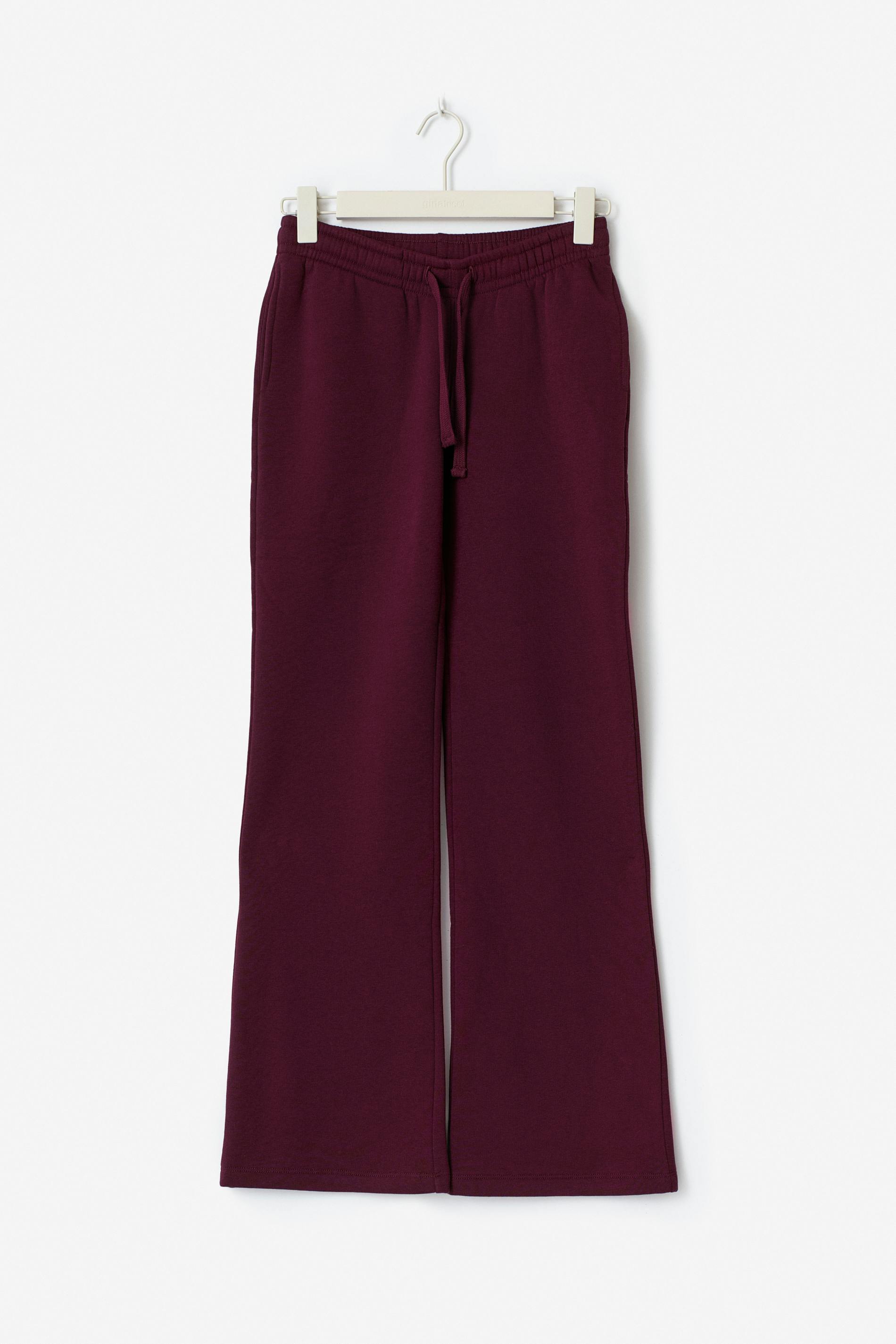 Lågmidjade mjukisbyxor med bakfickor. Byxorna är vinröda och har knytsnören framtill. De har vida ben, normal passform, resår i midjan och fickor i sidorna.