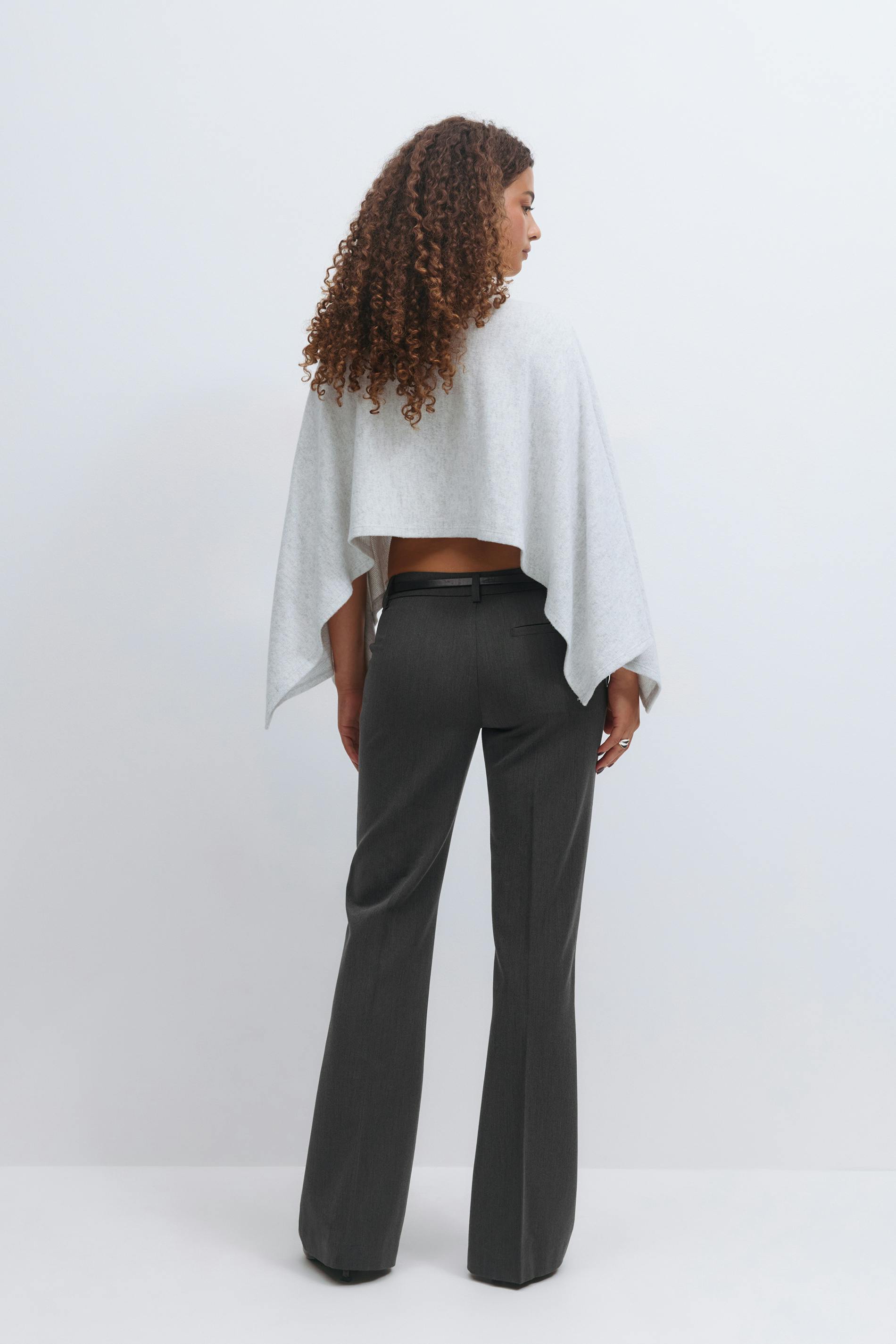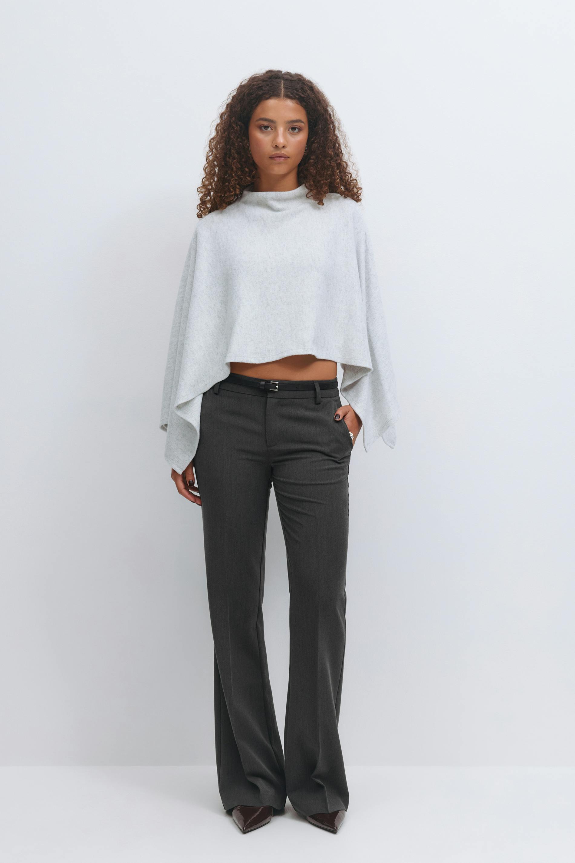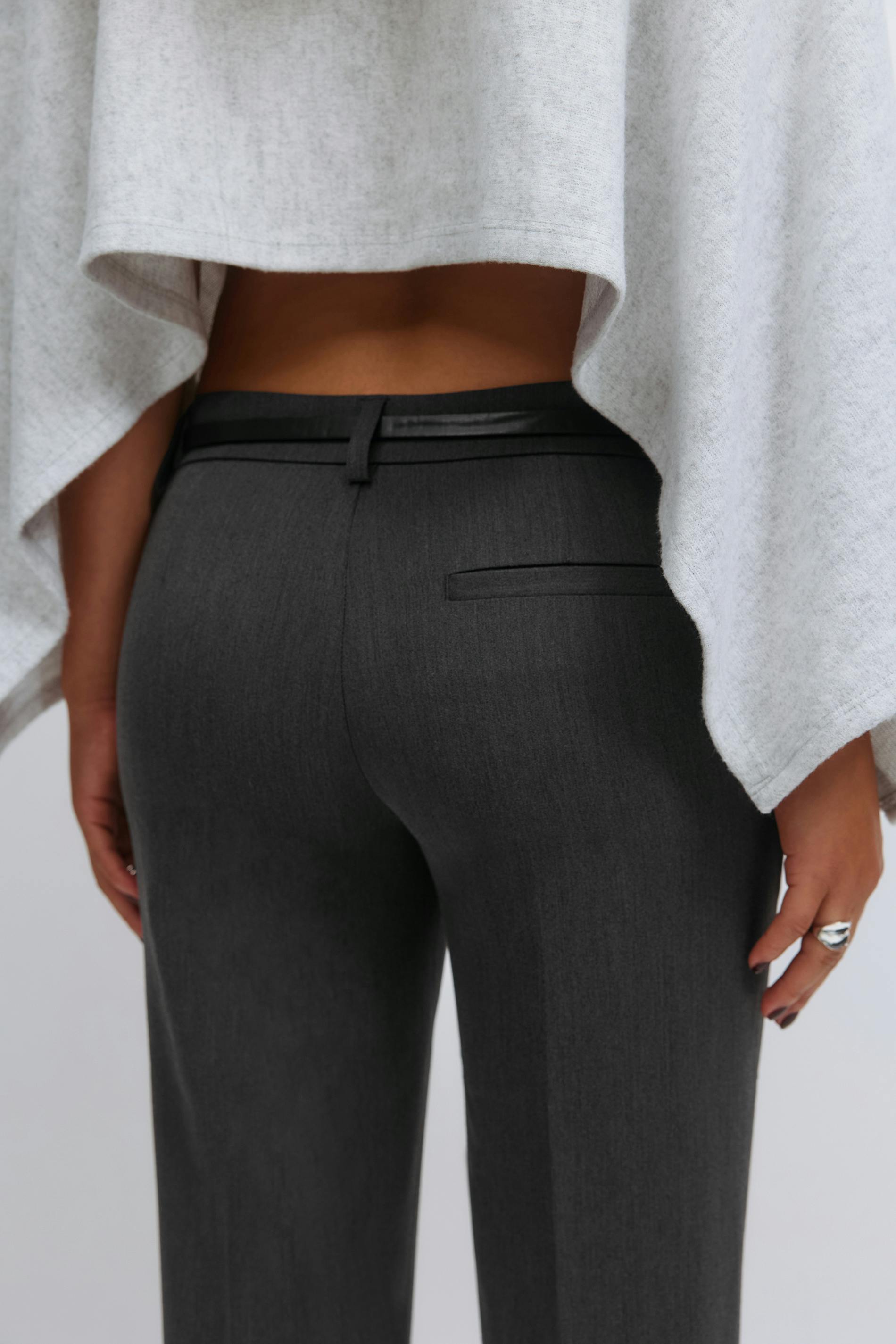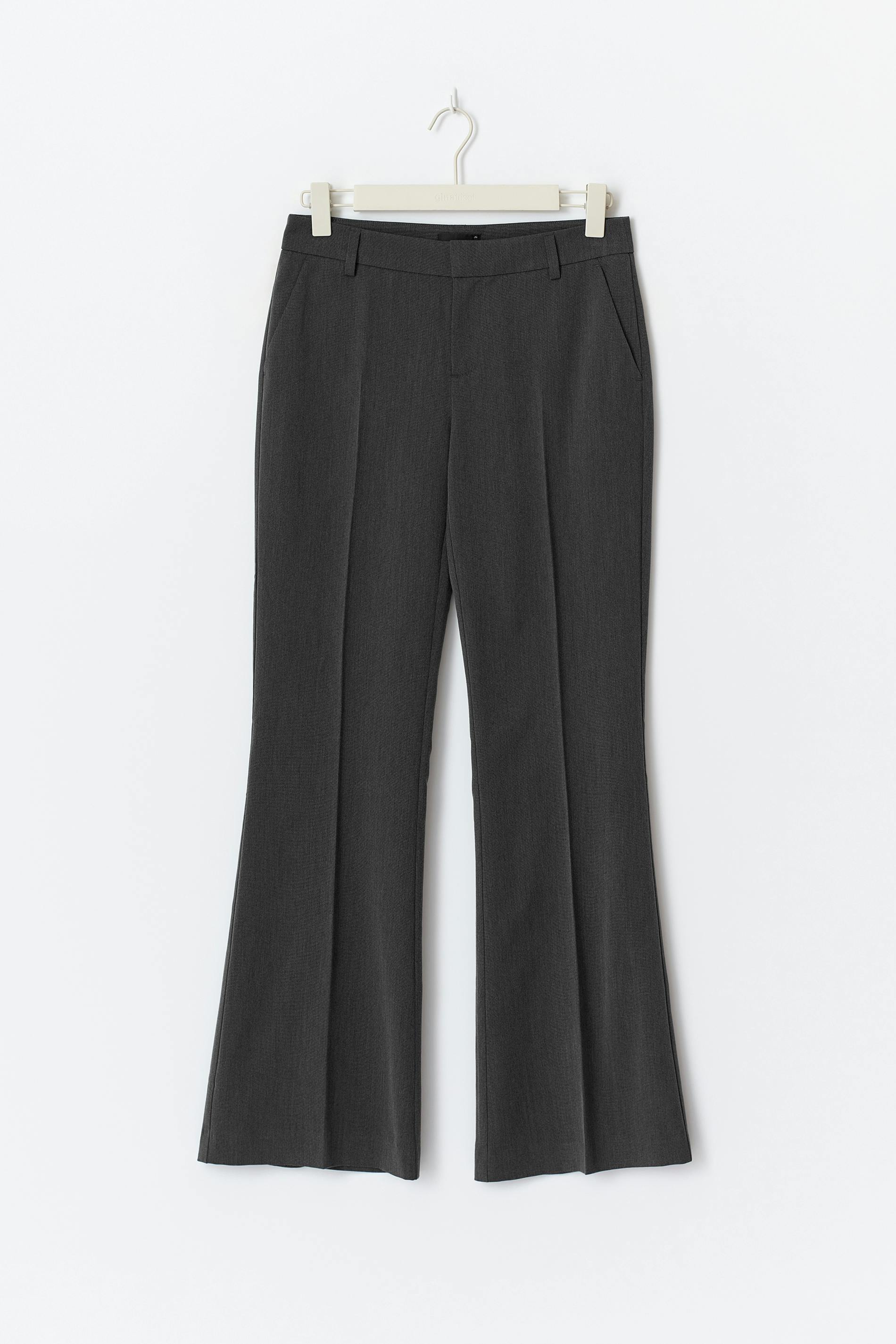 Lågmidjade kostymbyxor med pressveck. Byxorna är gråa och har utsvängda ben. De har dragkedjegylf, fickor i sidorna och bälteshällor.
