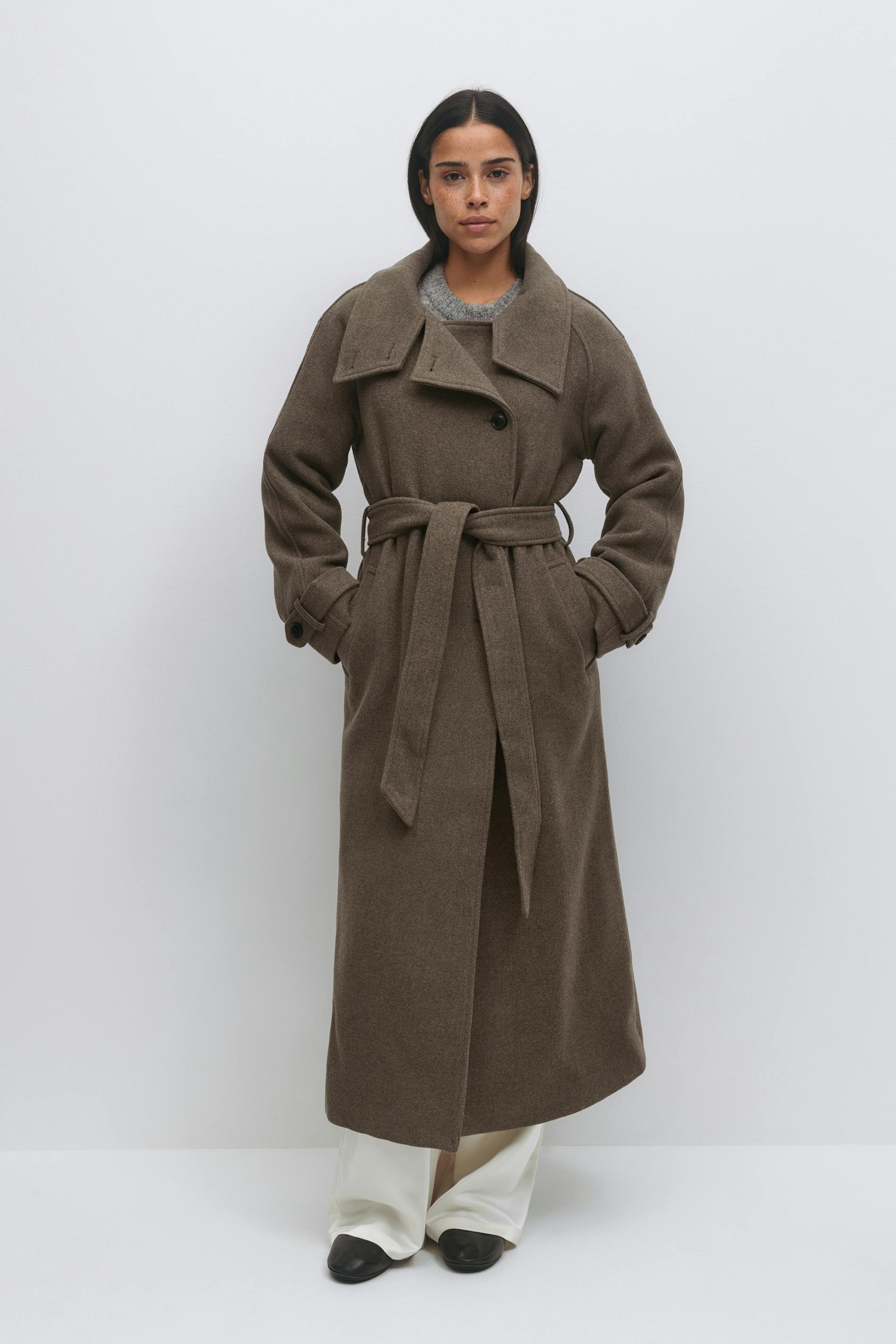 Lång ullkappa i ullblandning med knytskärp i midjan. Ullkappan är grå och har oversize fit. Den har hög krage, knäppning fram, lång ärm, slits bak och reglerbar slejf vid ärmsluten.