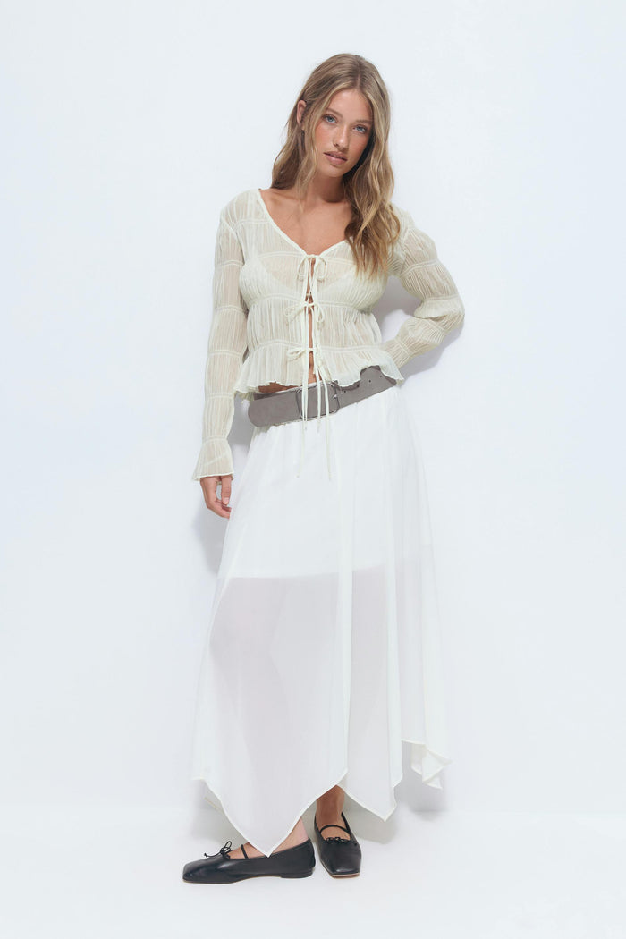 Floral tie top with short puff sleeve. The top is blue and has string tie closure at the front. It has u-neck, textured material, gathered seam below the bust and frill at the bottom.