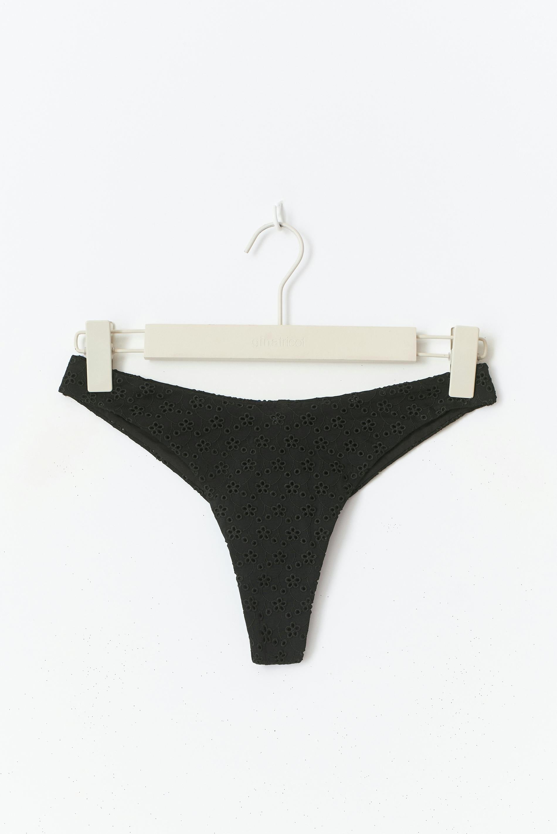 Brazilian bikini bottom with a mid waist. The pantie is black and fully lined and has a slim fit. It has an embroidered pattern.