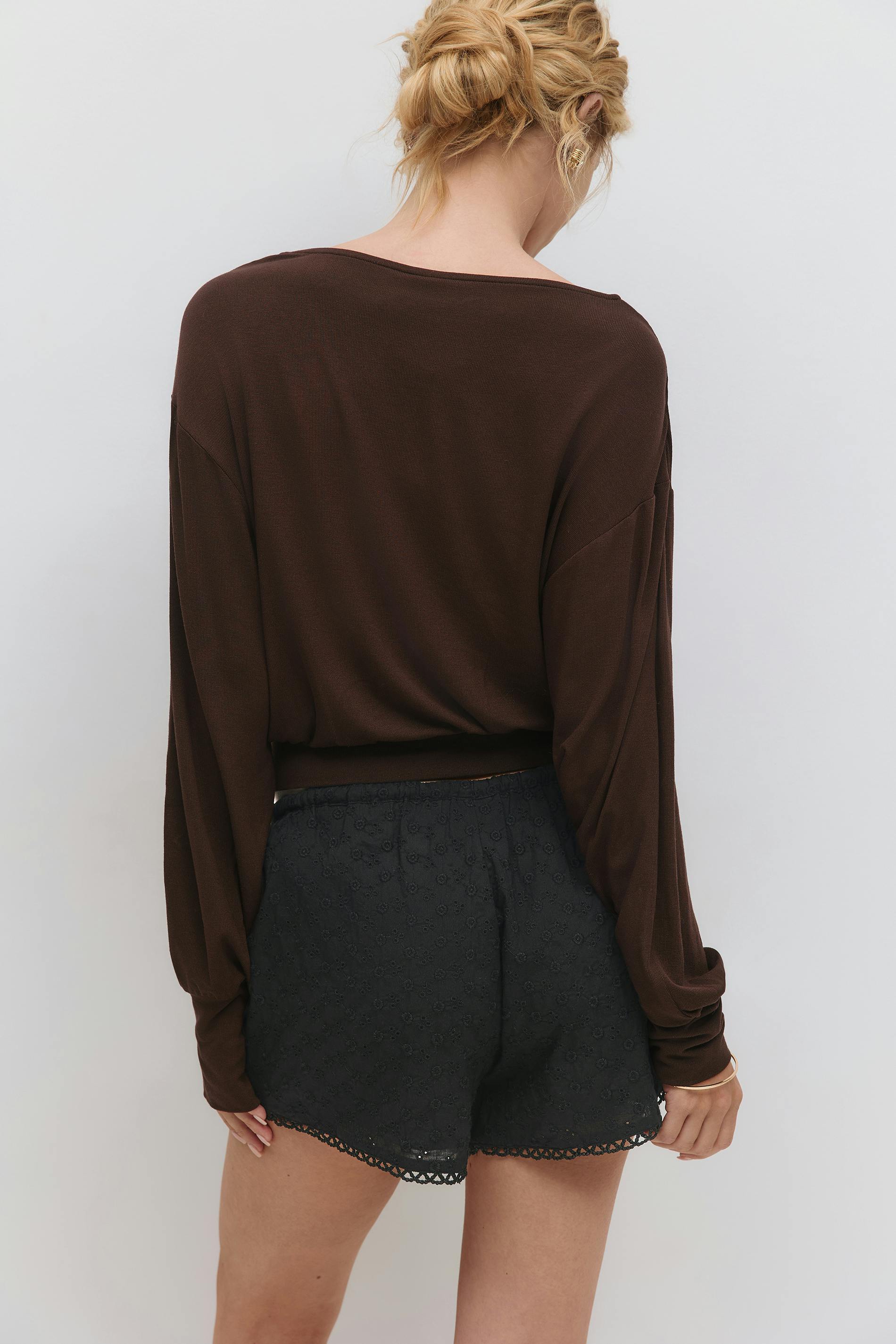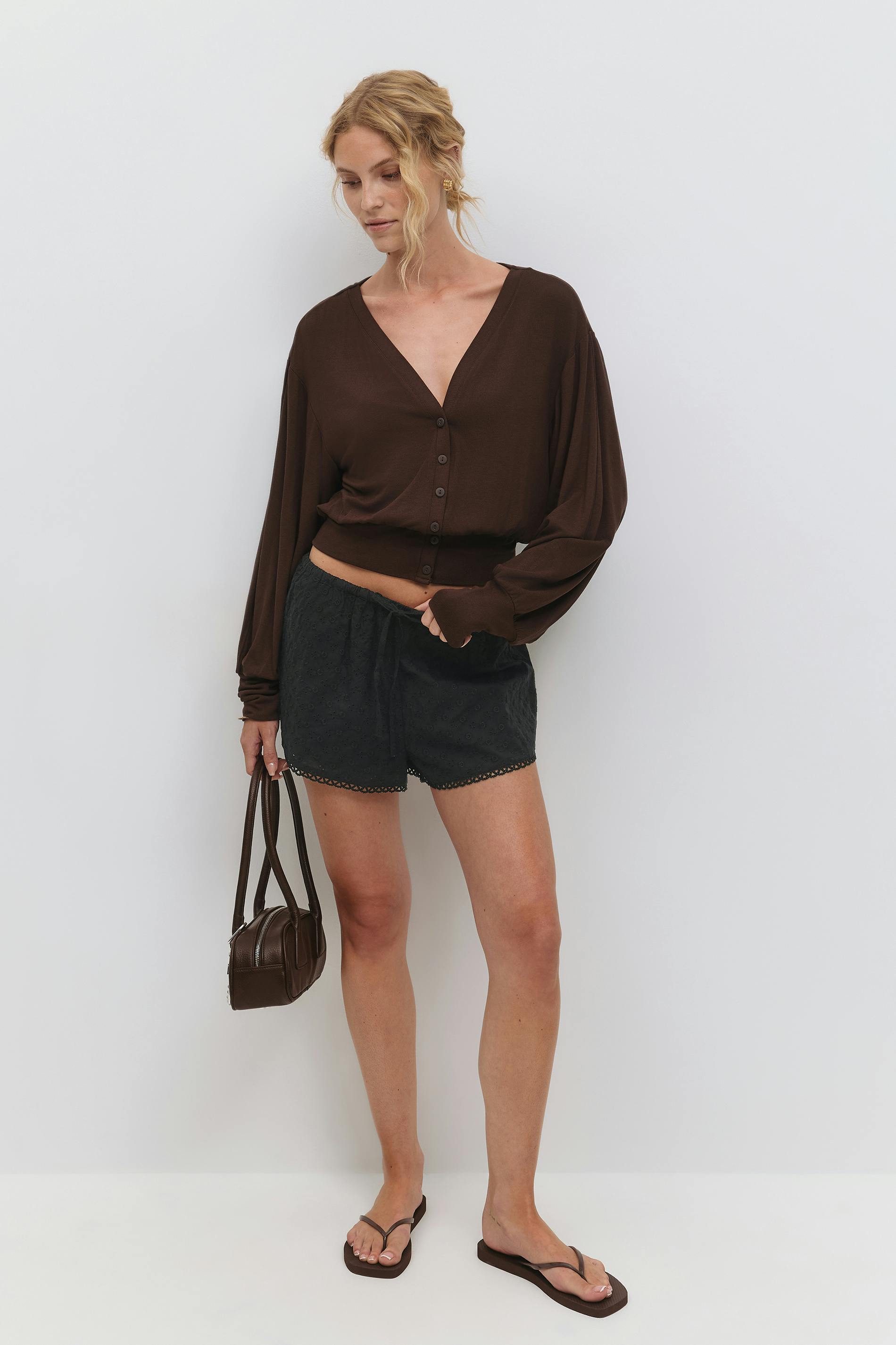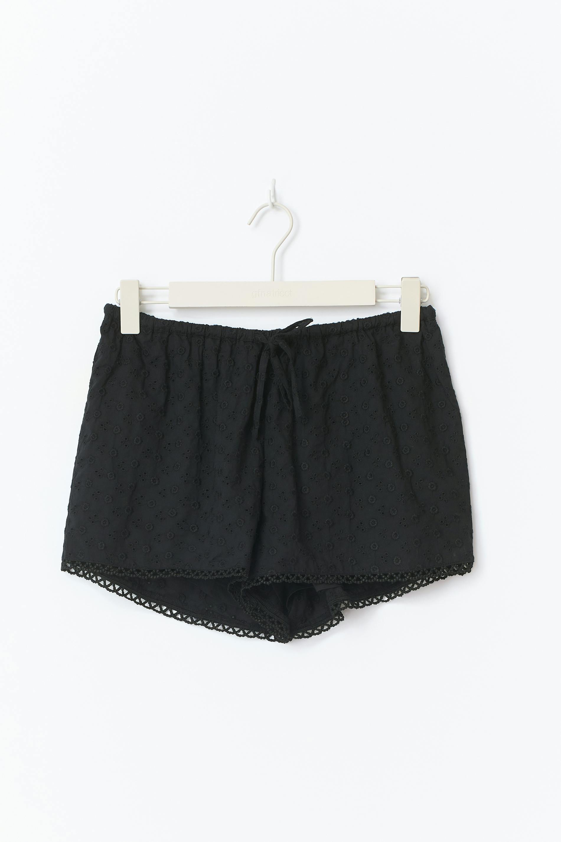Embroidered shorts with low waist. The shorts are black and have self-tie at the front. They have regular fit, short length and elastic at the waist.