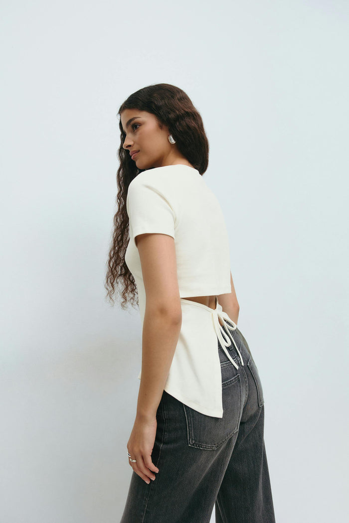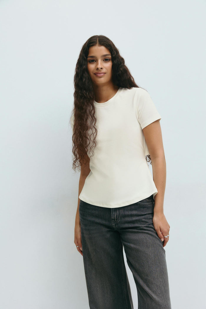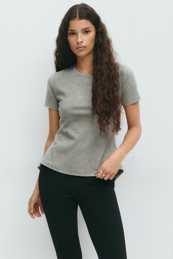 T-shirt with ruching in the sides. The t-shirt is grey and has fitted waist. It has round neckline, dropped shoulder, short sleeve and short length.