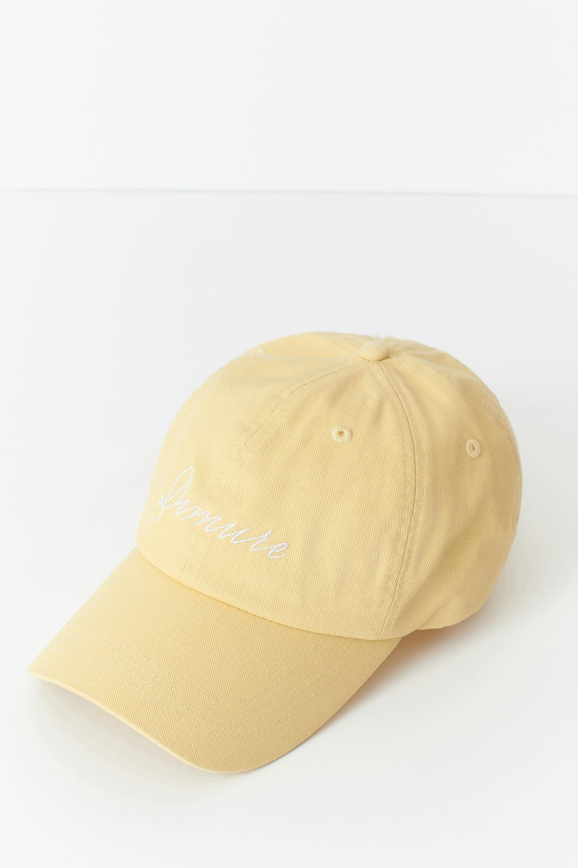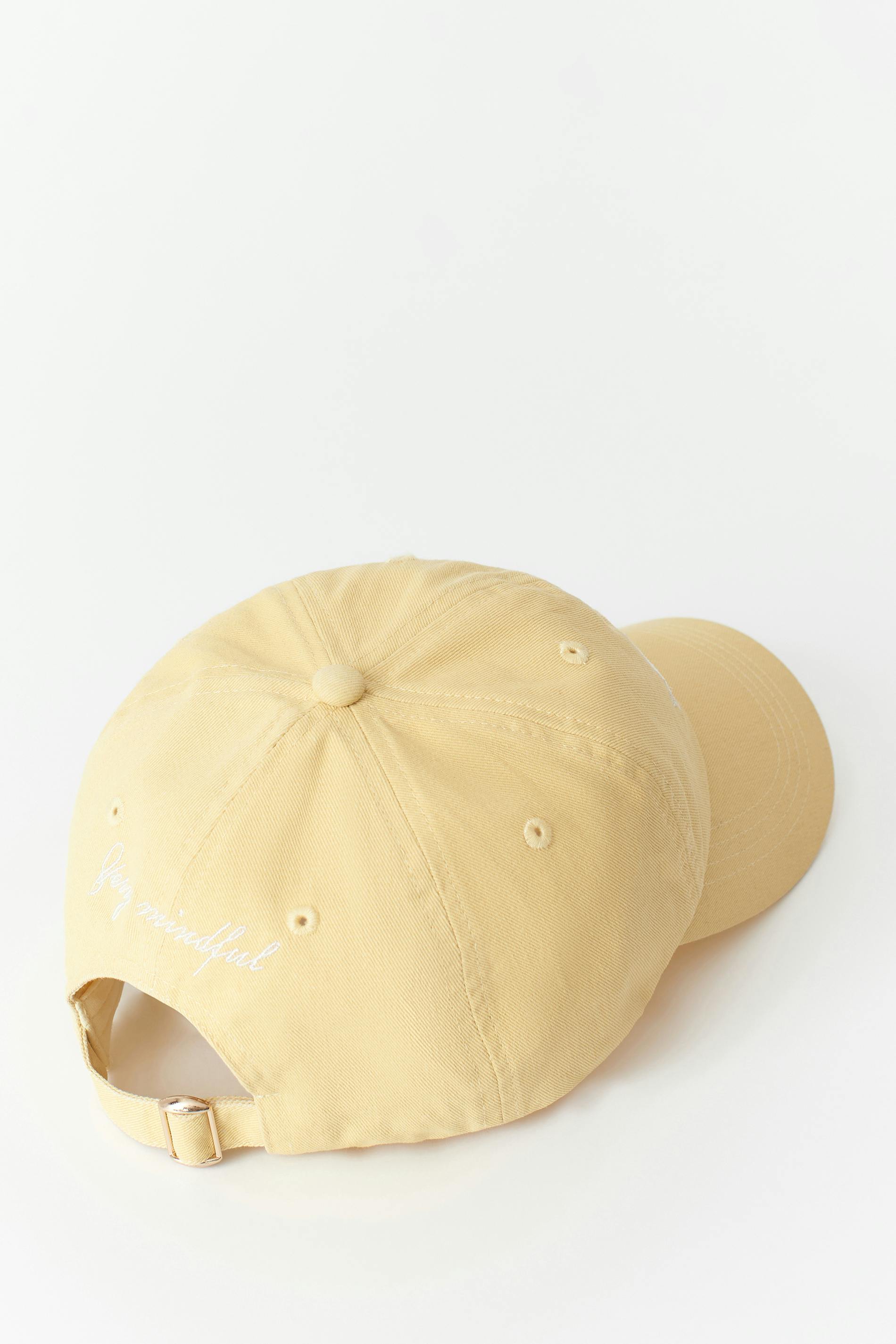 Cap with embroidered text at the front. The cap is yellow and has washed down look. It has adjustable tab at the back.