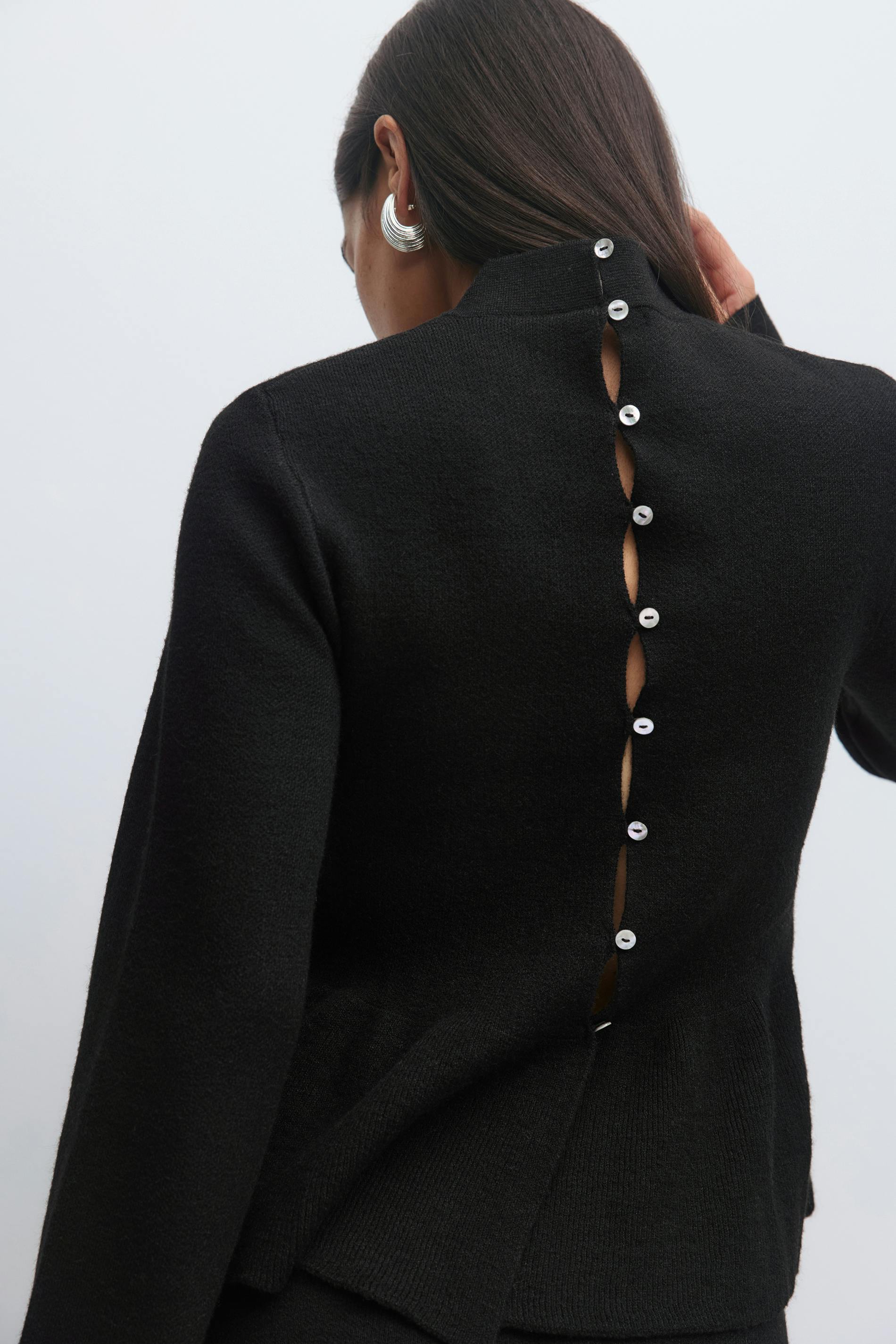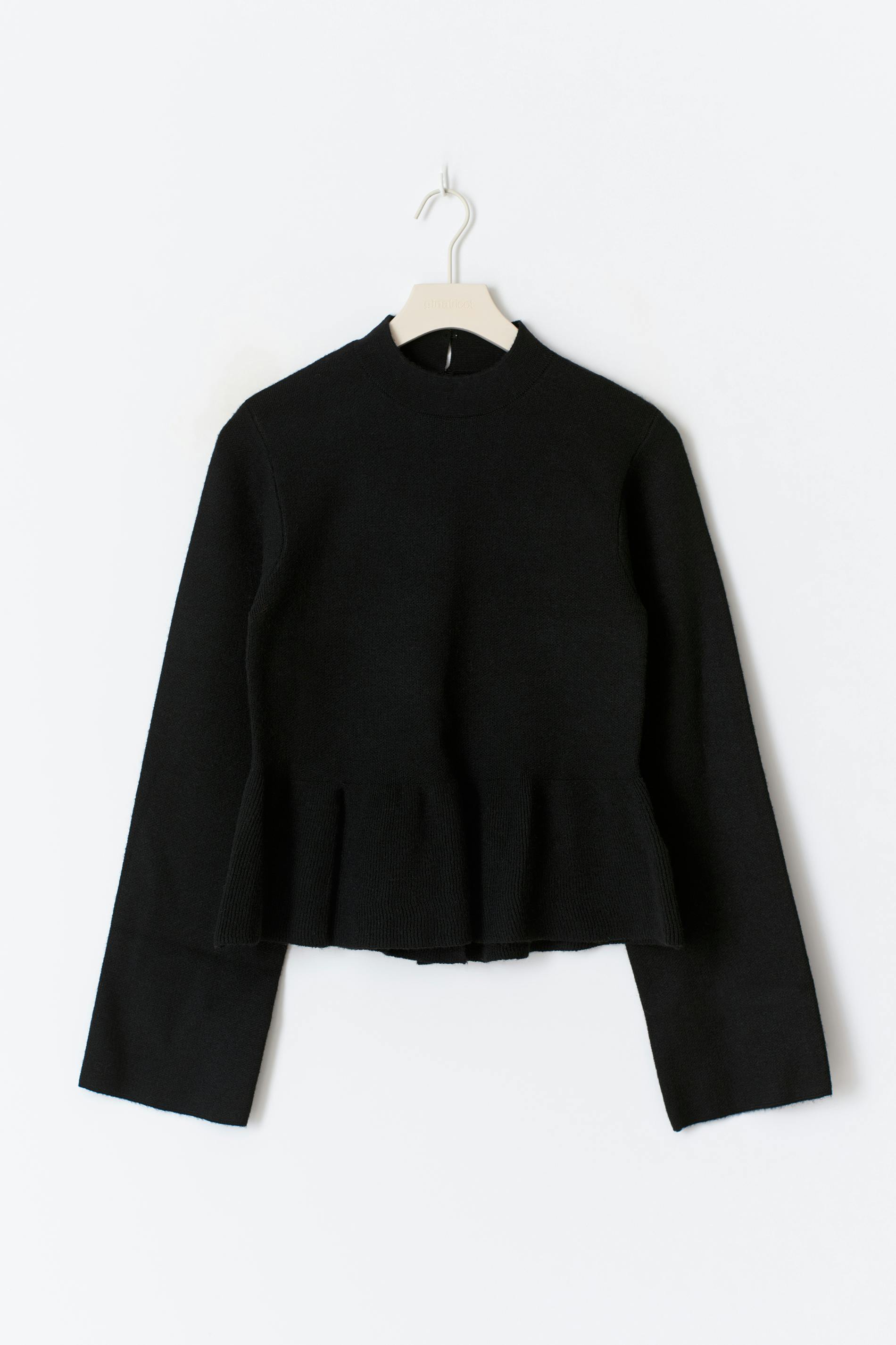 Stickad peplumtopp med volanger i nederkant. Toppen är svart och har en lång ärm. Den har en rund halsringning, knäppe baktill och en normal passform.