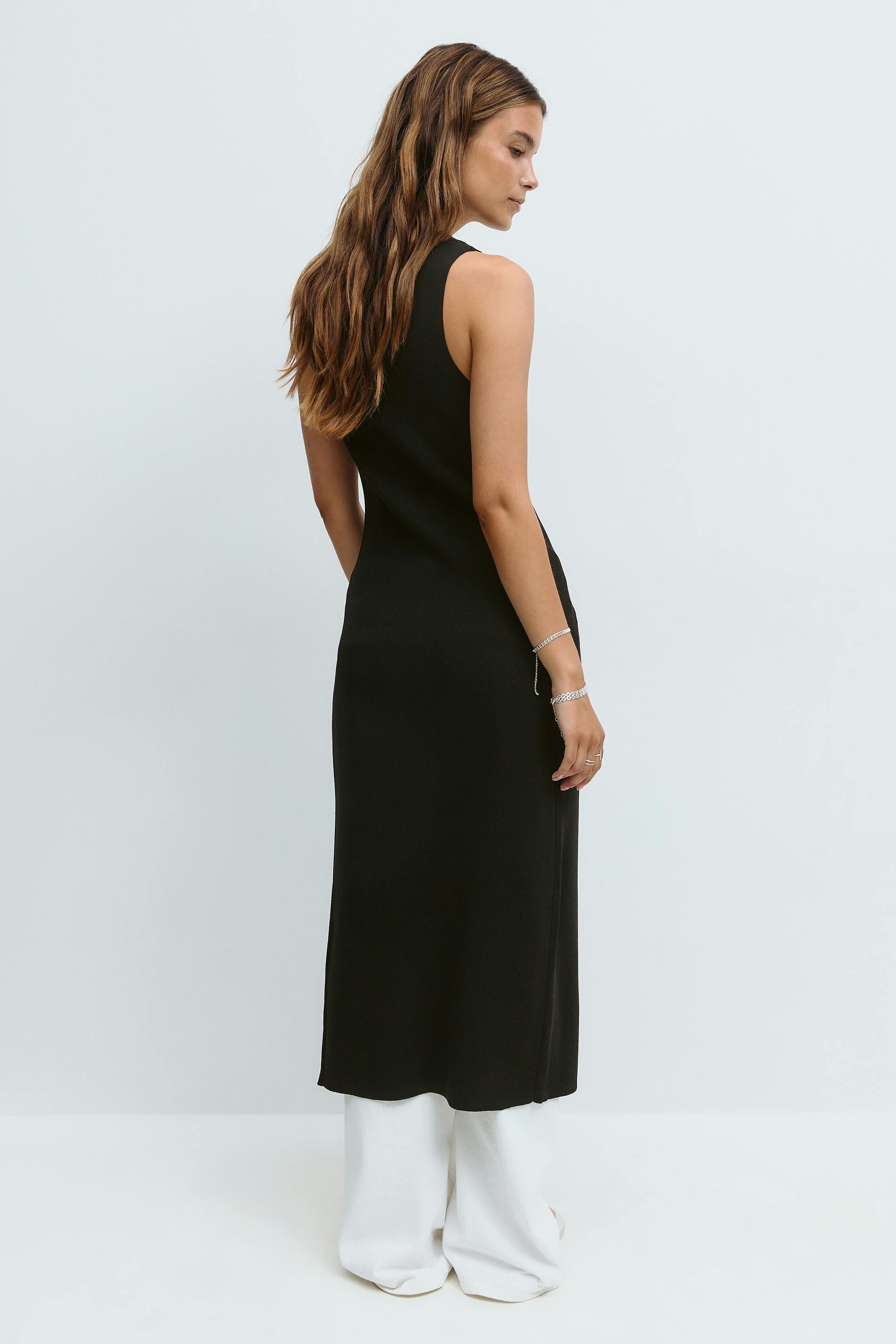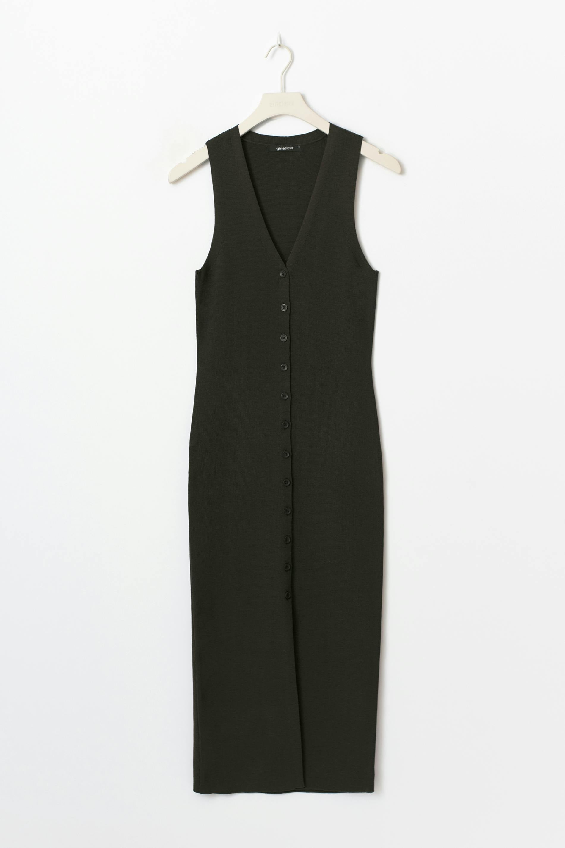 Stickad klänning med v-ringning. Klänningen är svart och ärmlös och har figurnära passform. Den har knappar framtill.