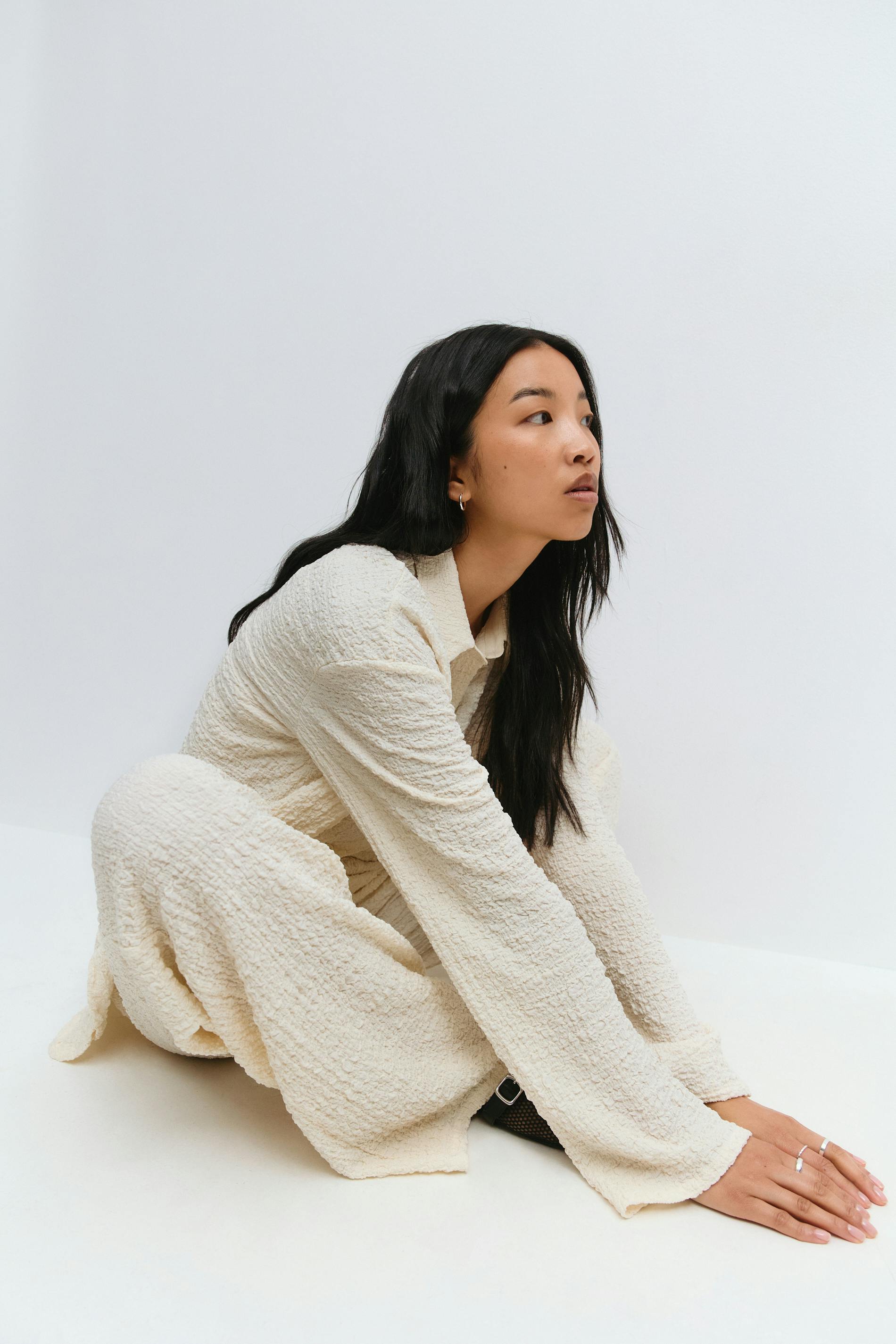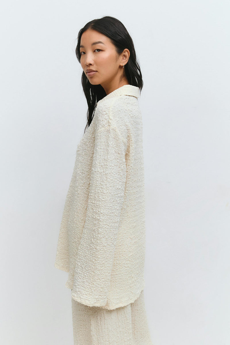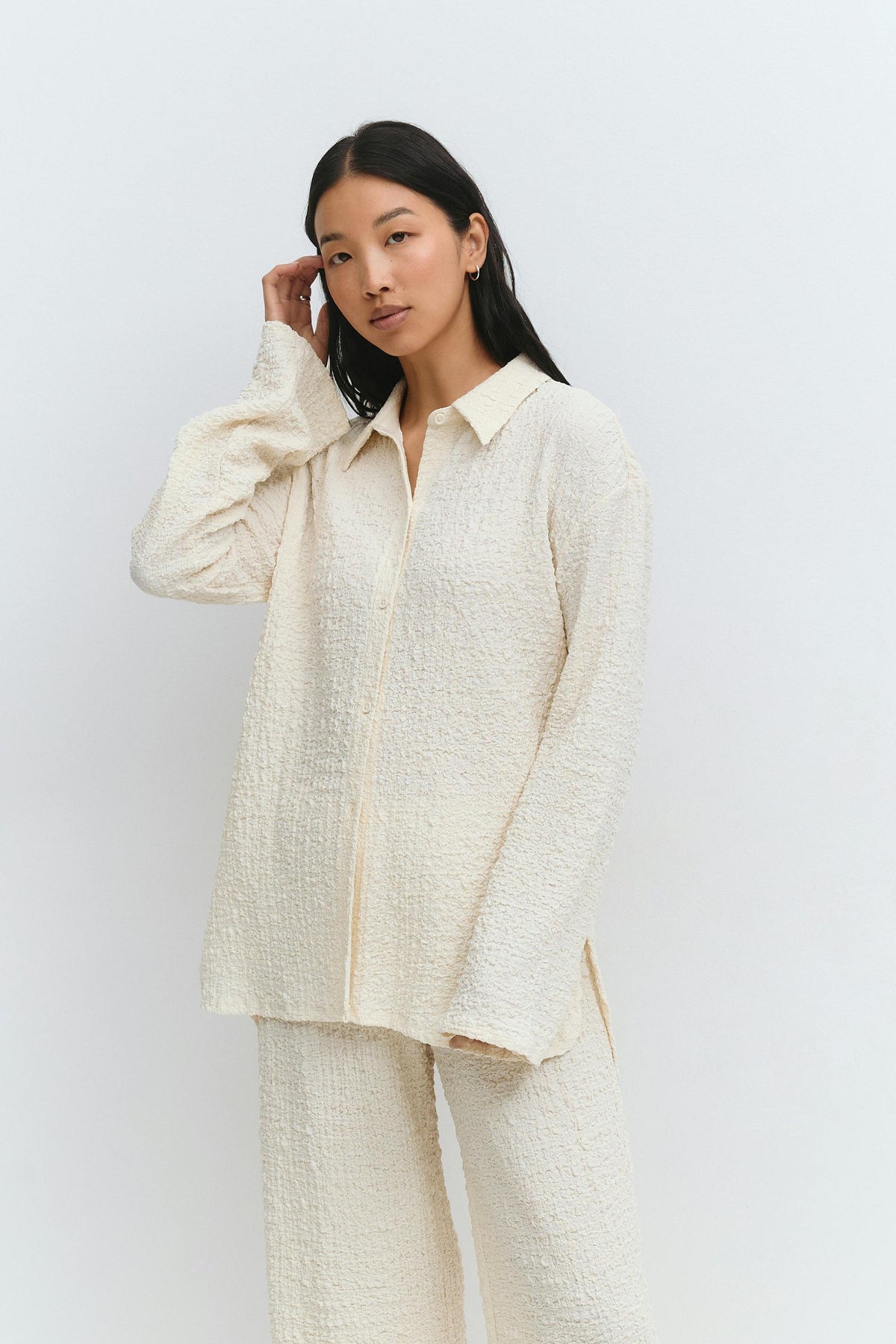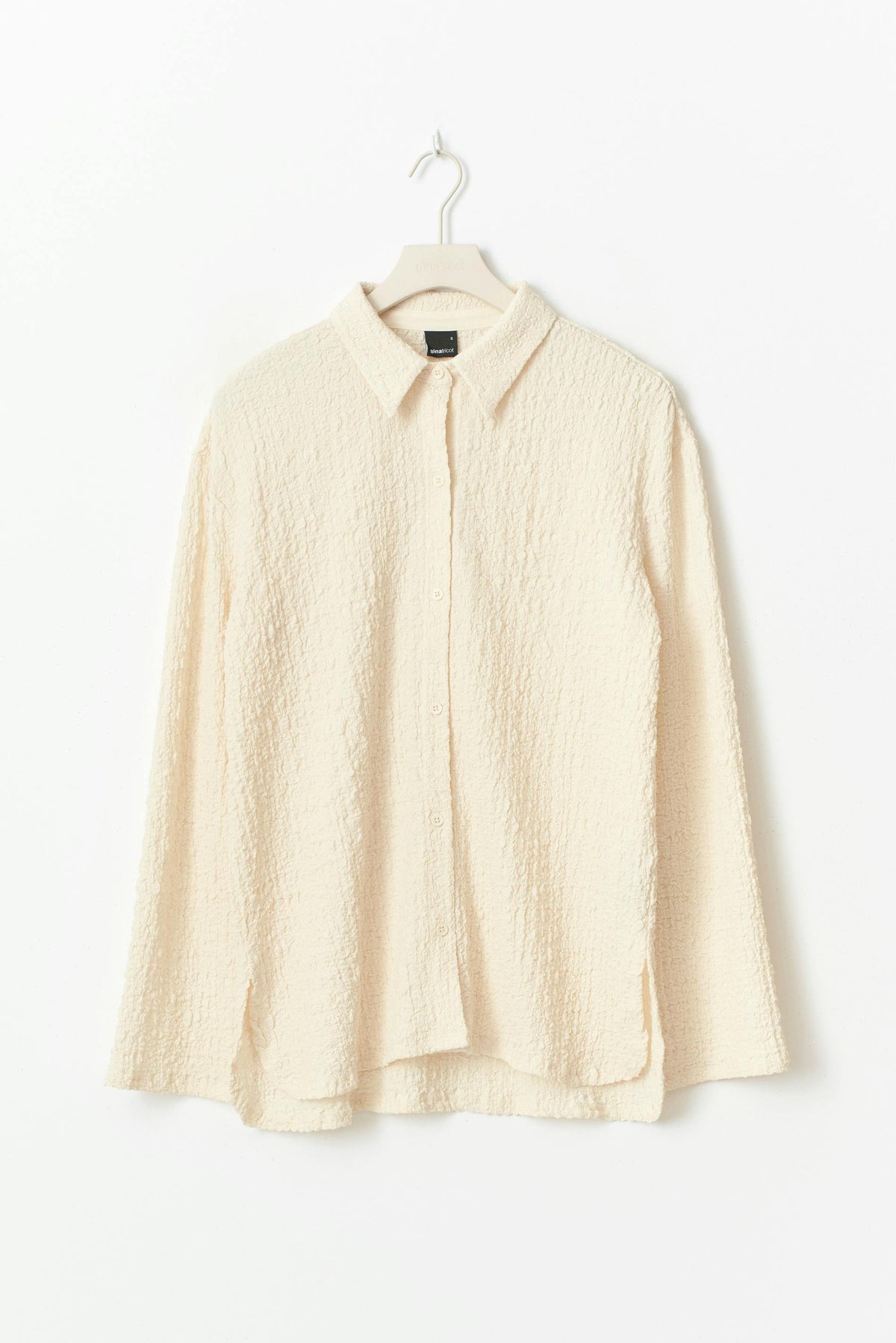 Long-sleeved shirt with textured cloth. The shirt is white and long and has loose-fitting style. It has collar and buttons at the front.