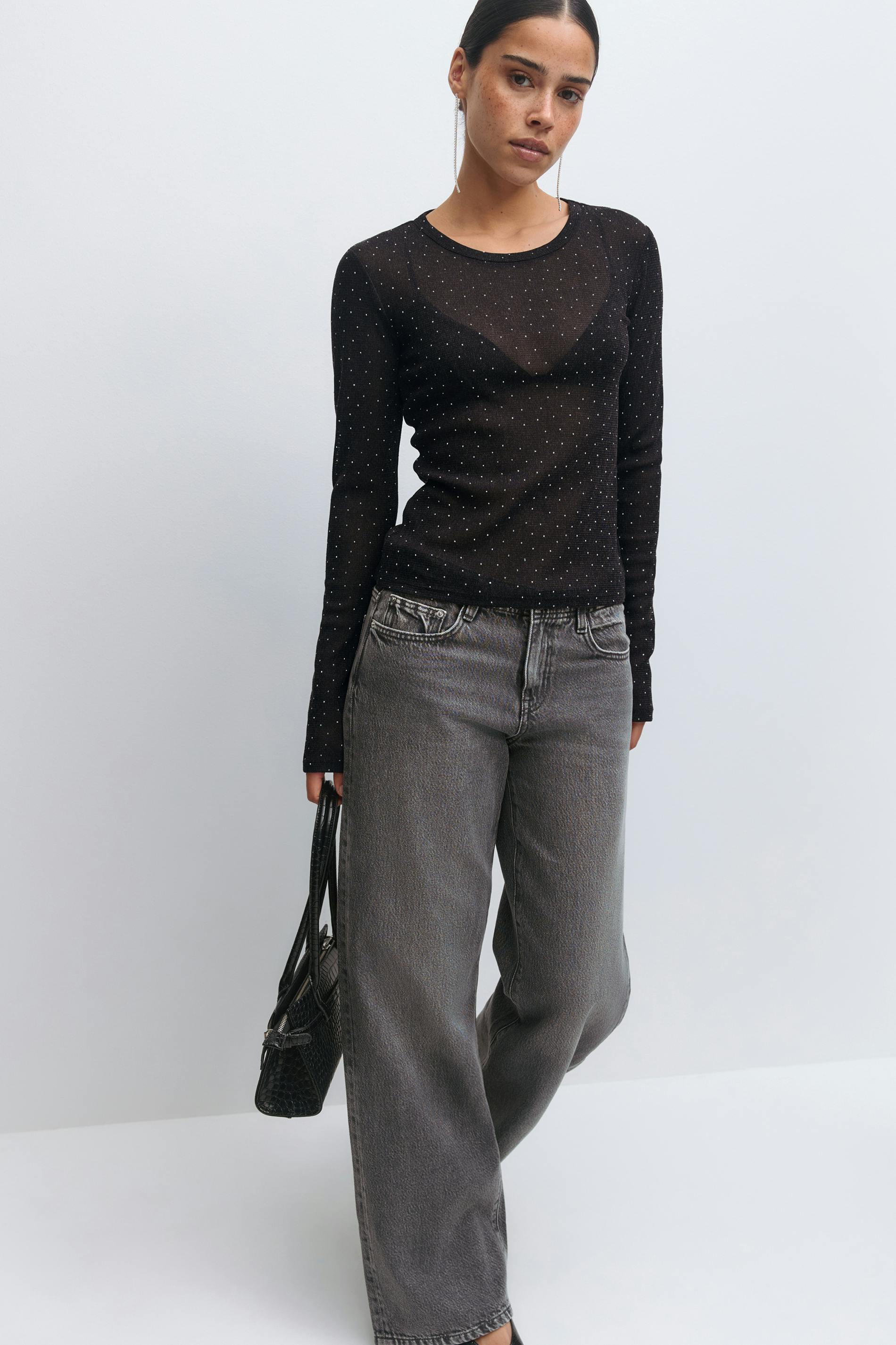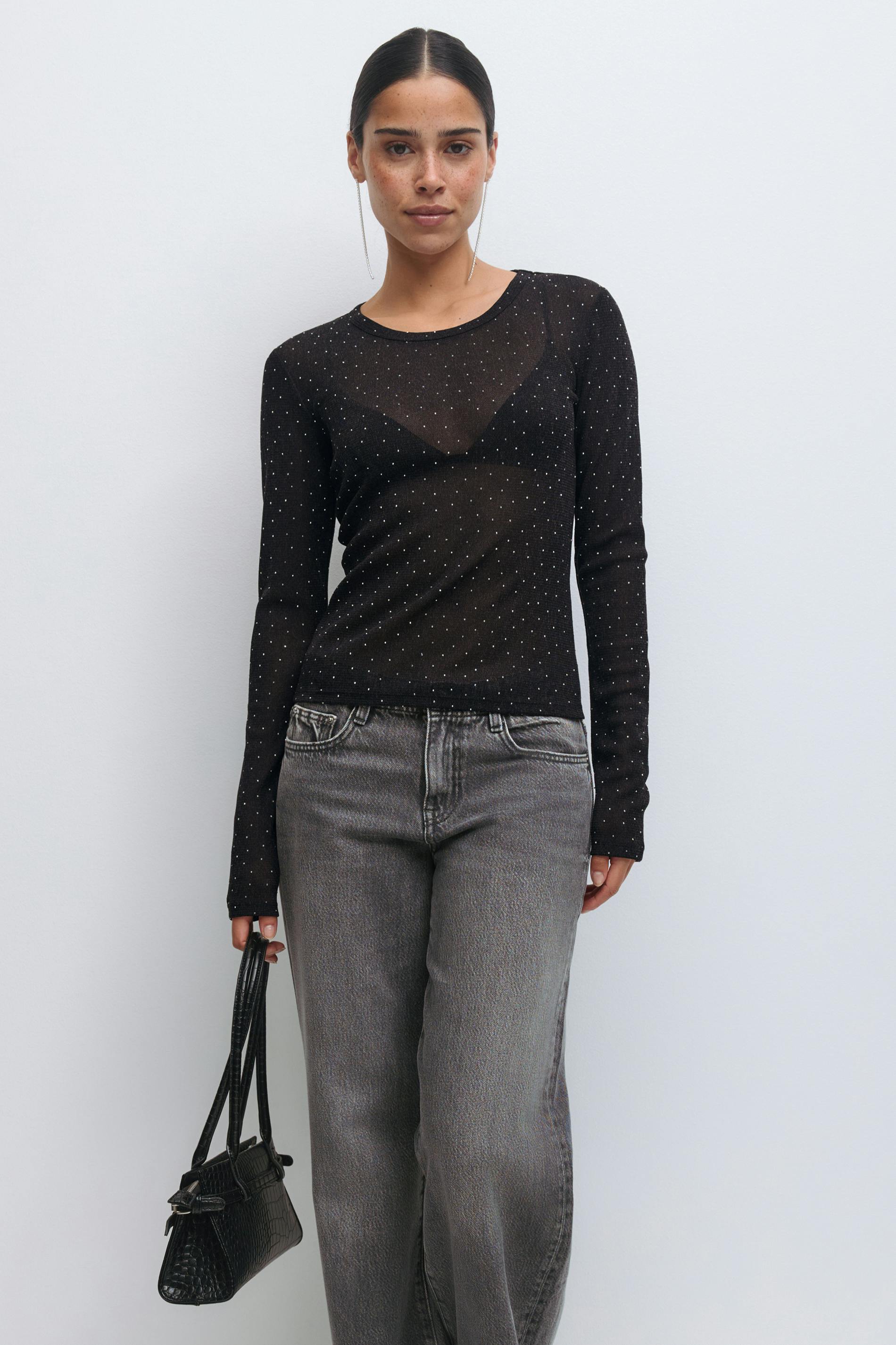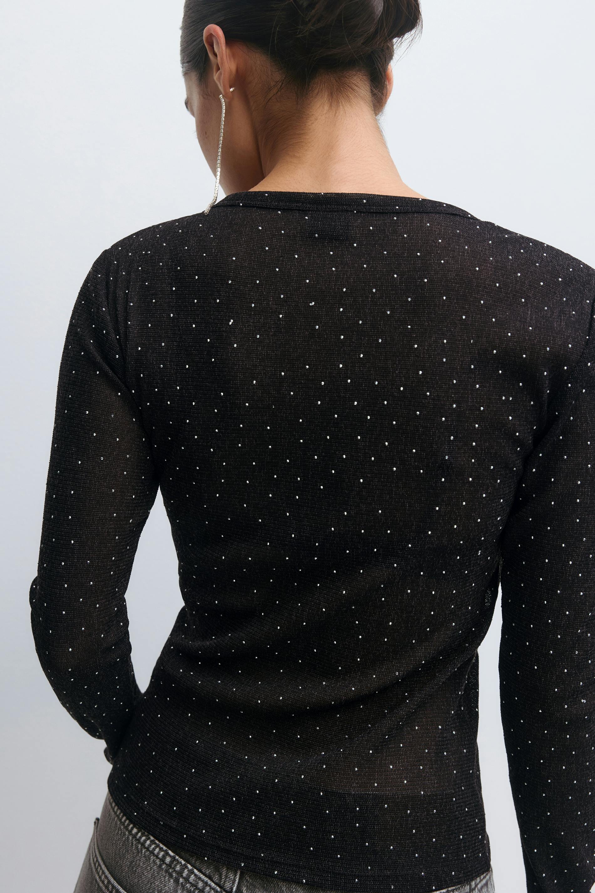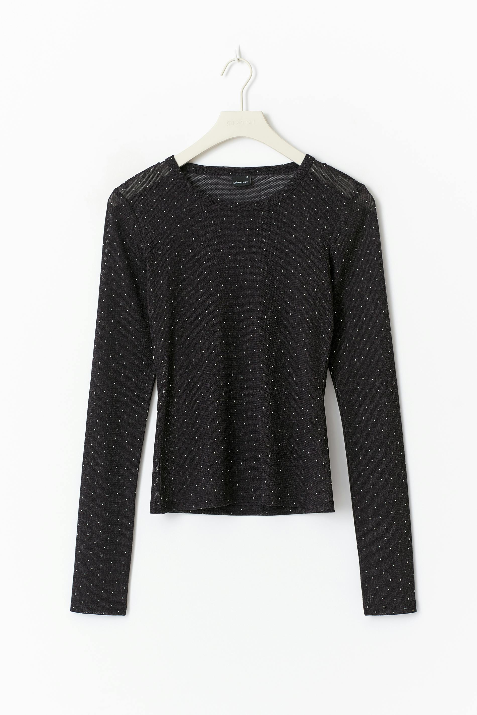Strassprydd topp med en figurnära passform. Toppen är brun och långärmad och har en rund halsringning. Den har en normallängd.