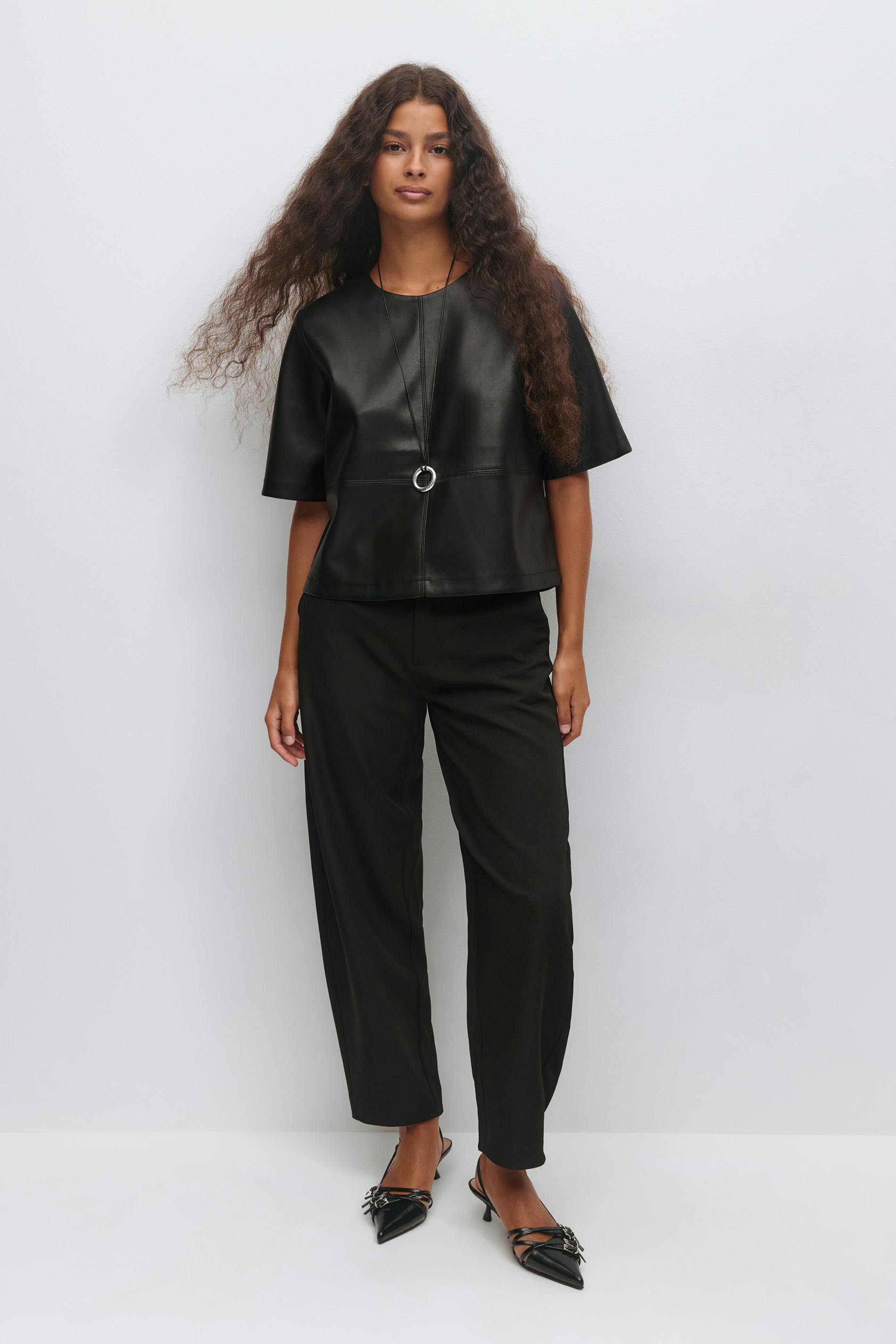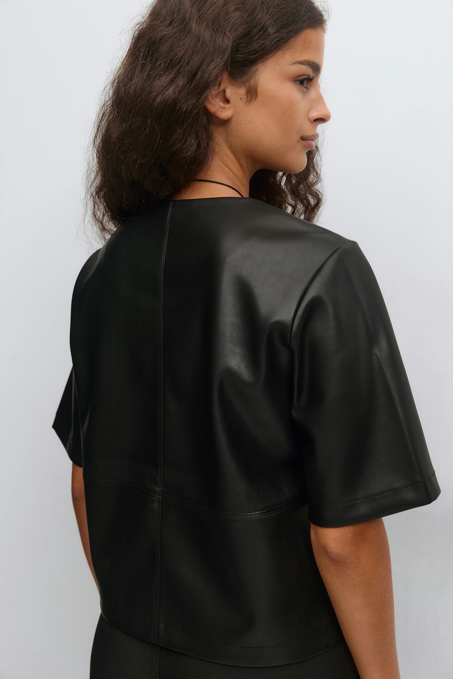 Boxig t-shirt i skinnimitation med korta ärmar. T-shirten är svart och har lös passform. Den har rund halsringning och dekorativa sömdetaljer fram och bak.